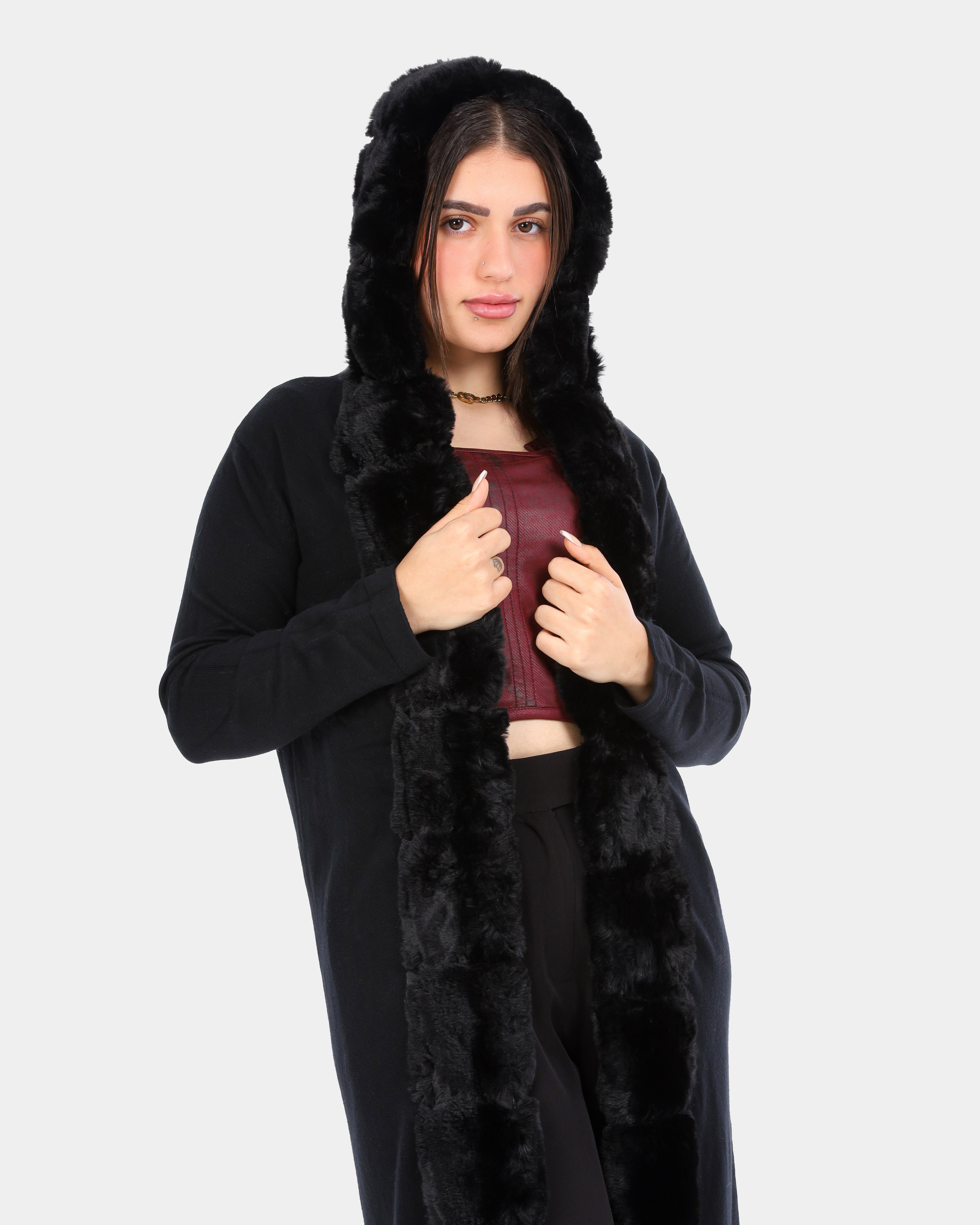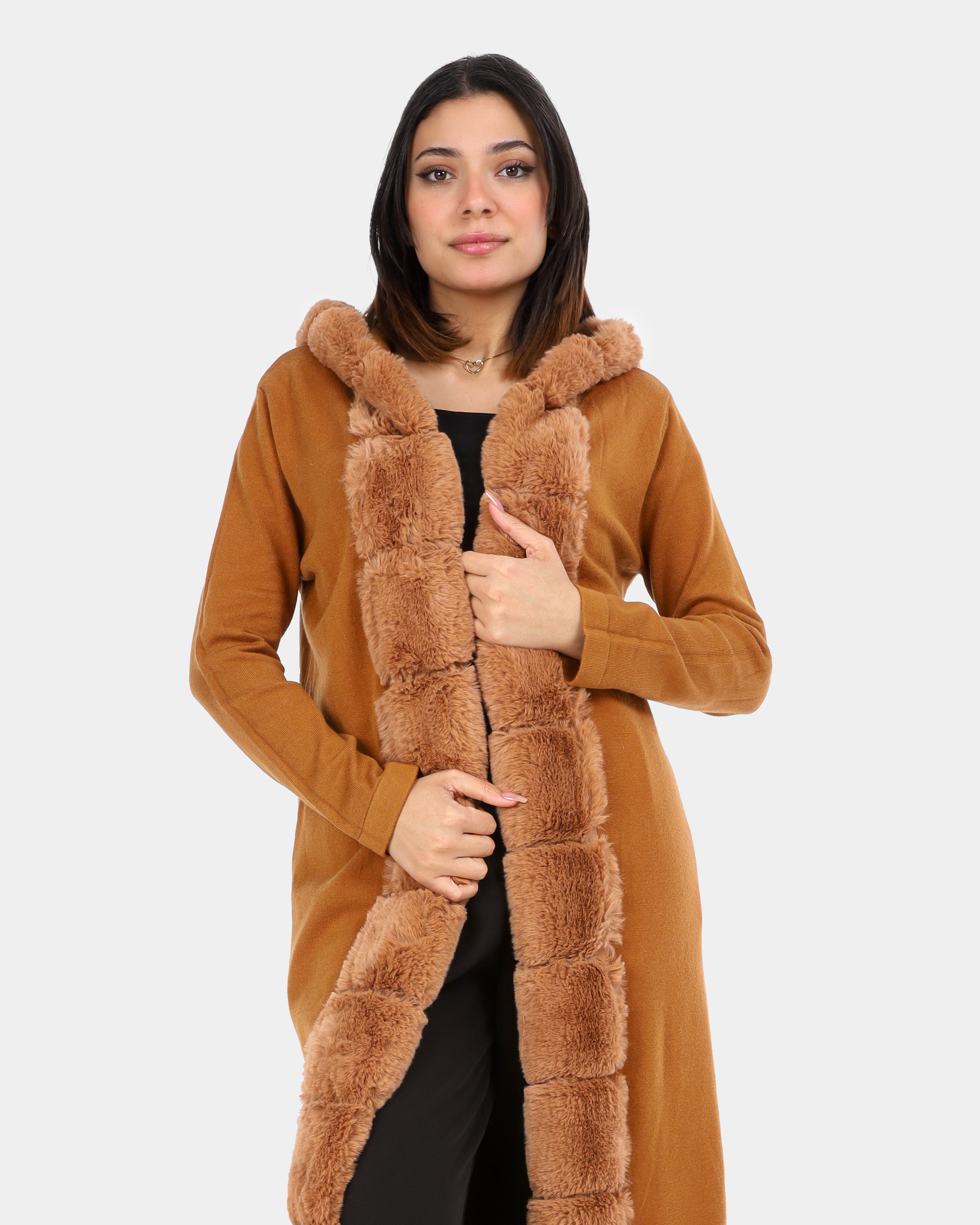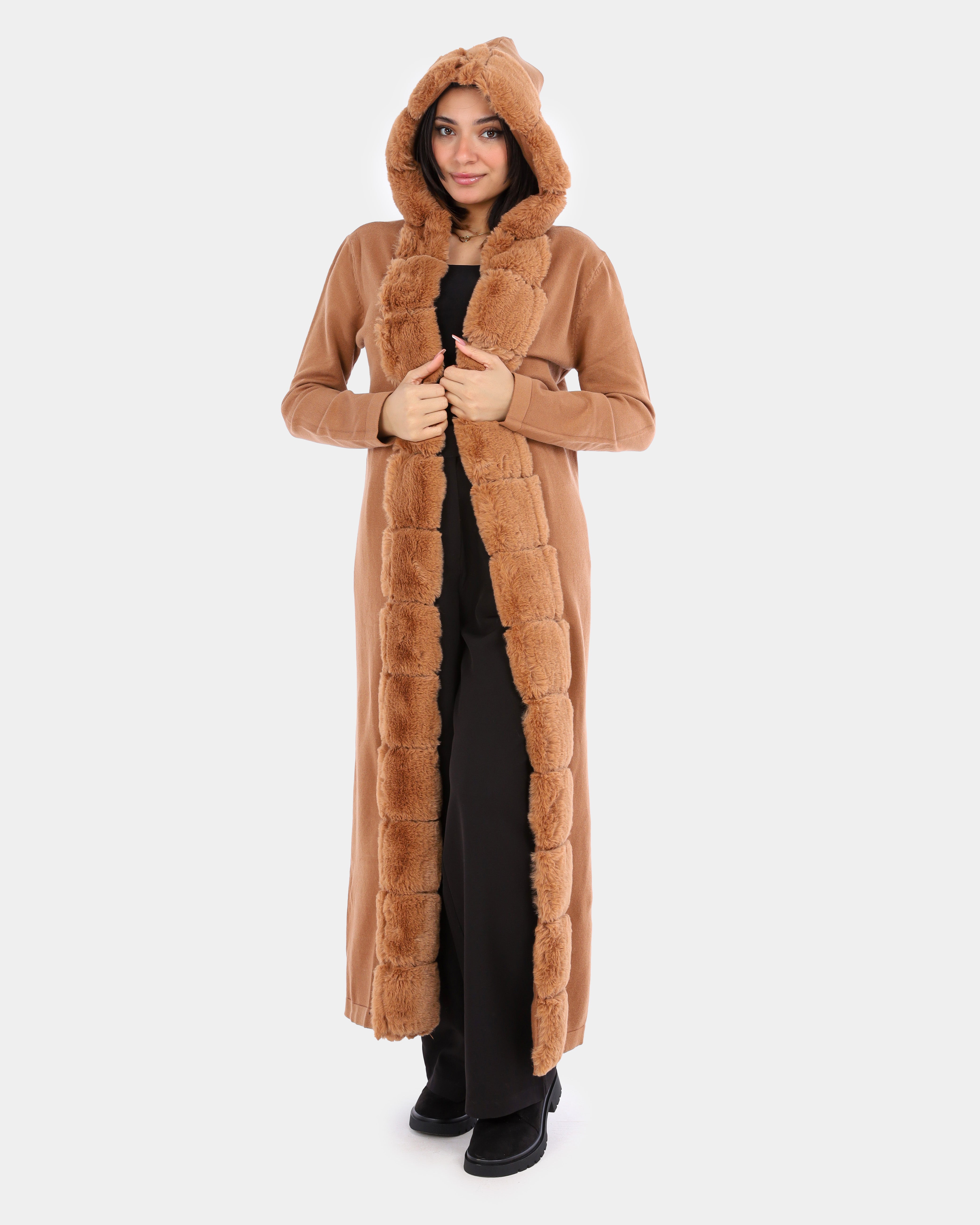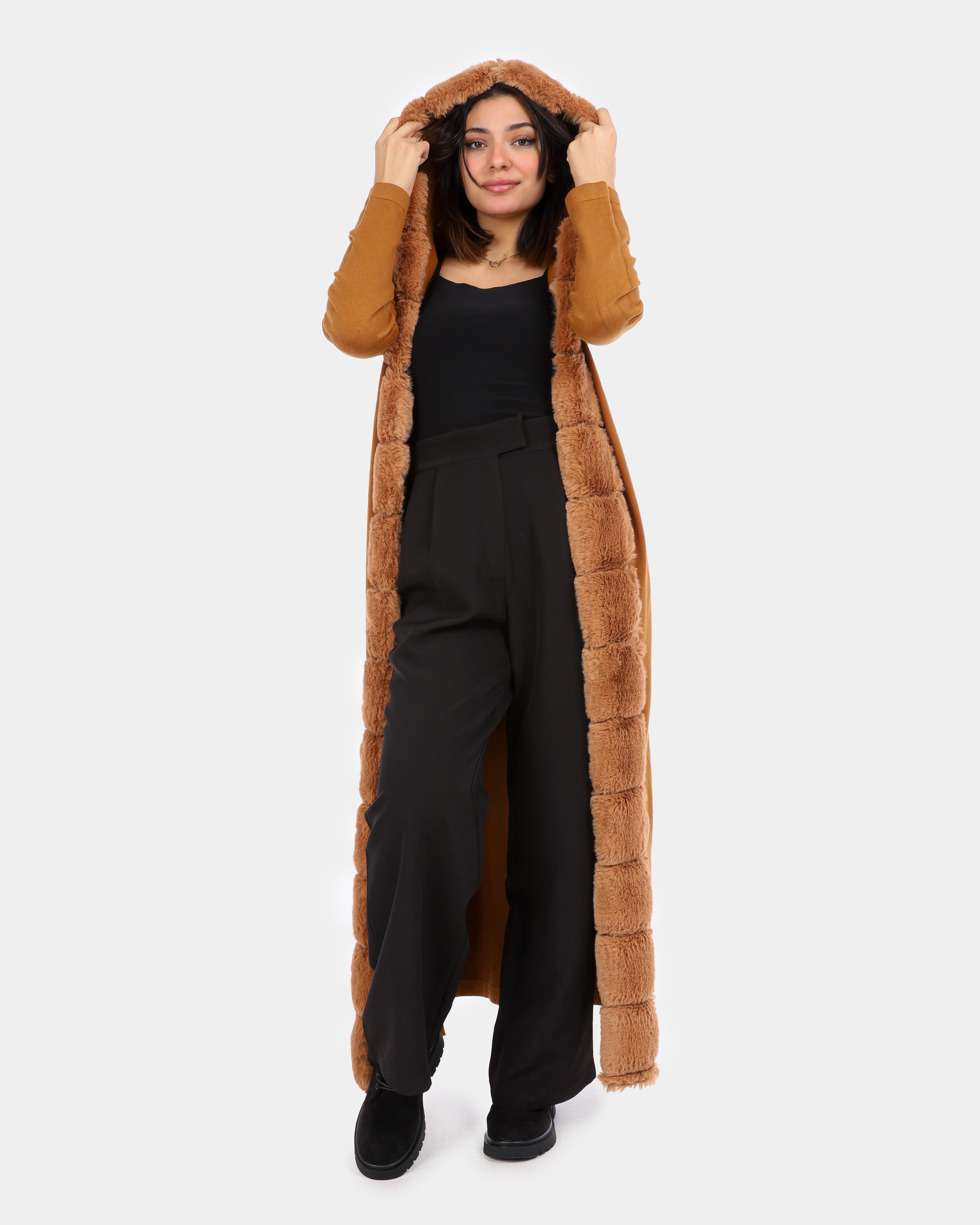Long Hooded Cardigan with Ribbed Faux Fur Trim w1754900