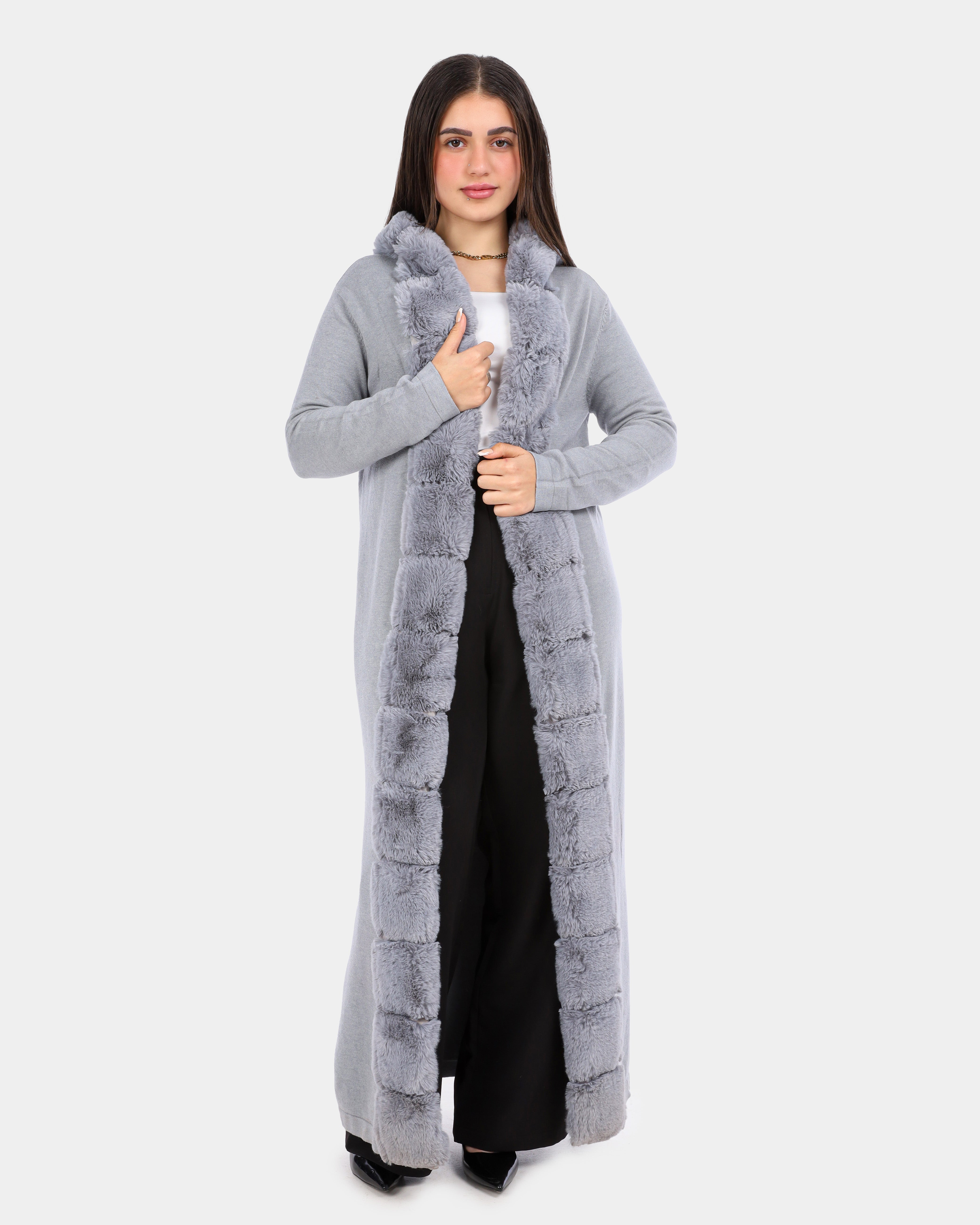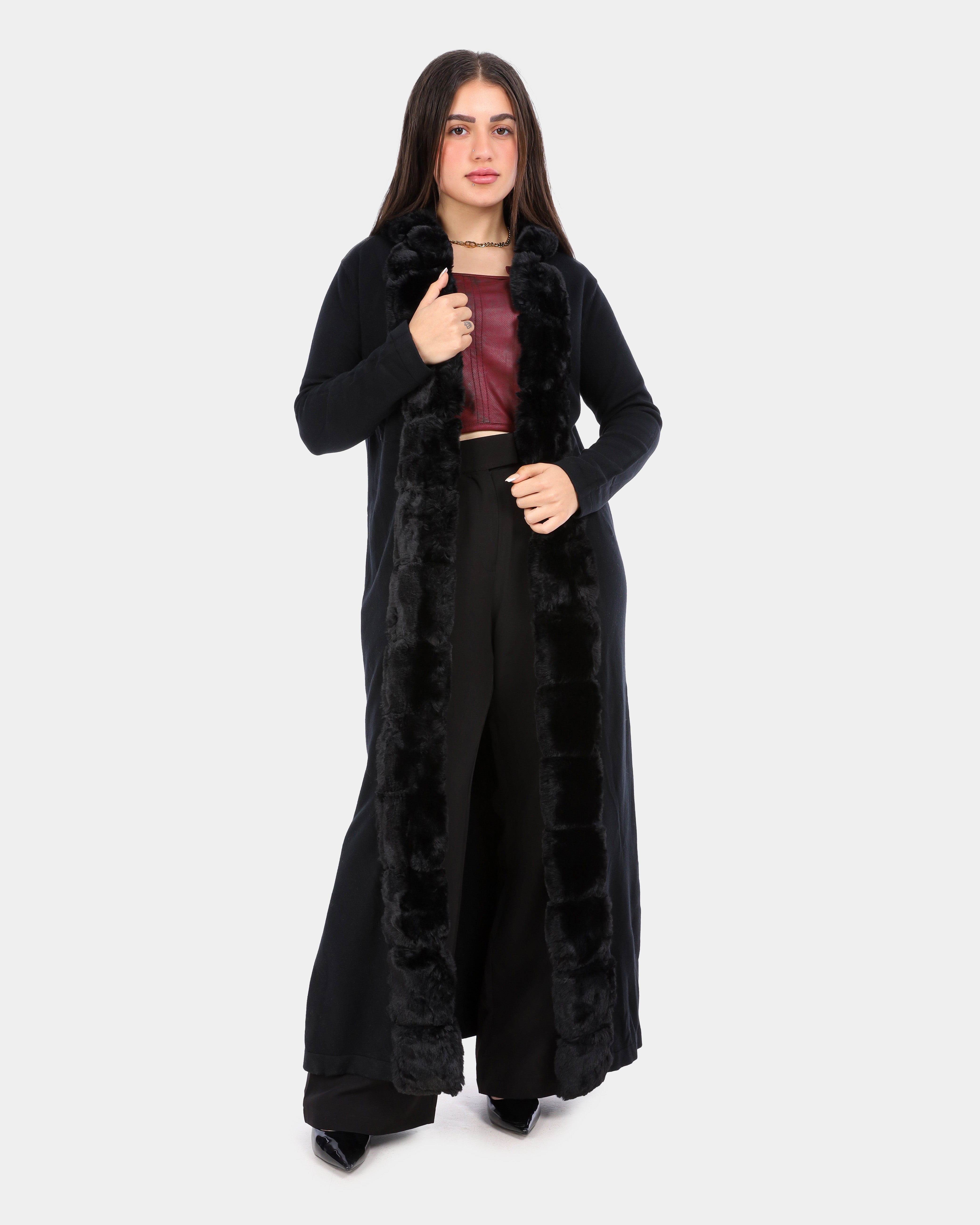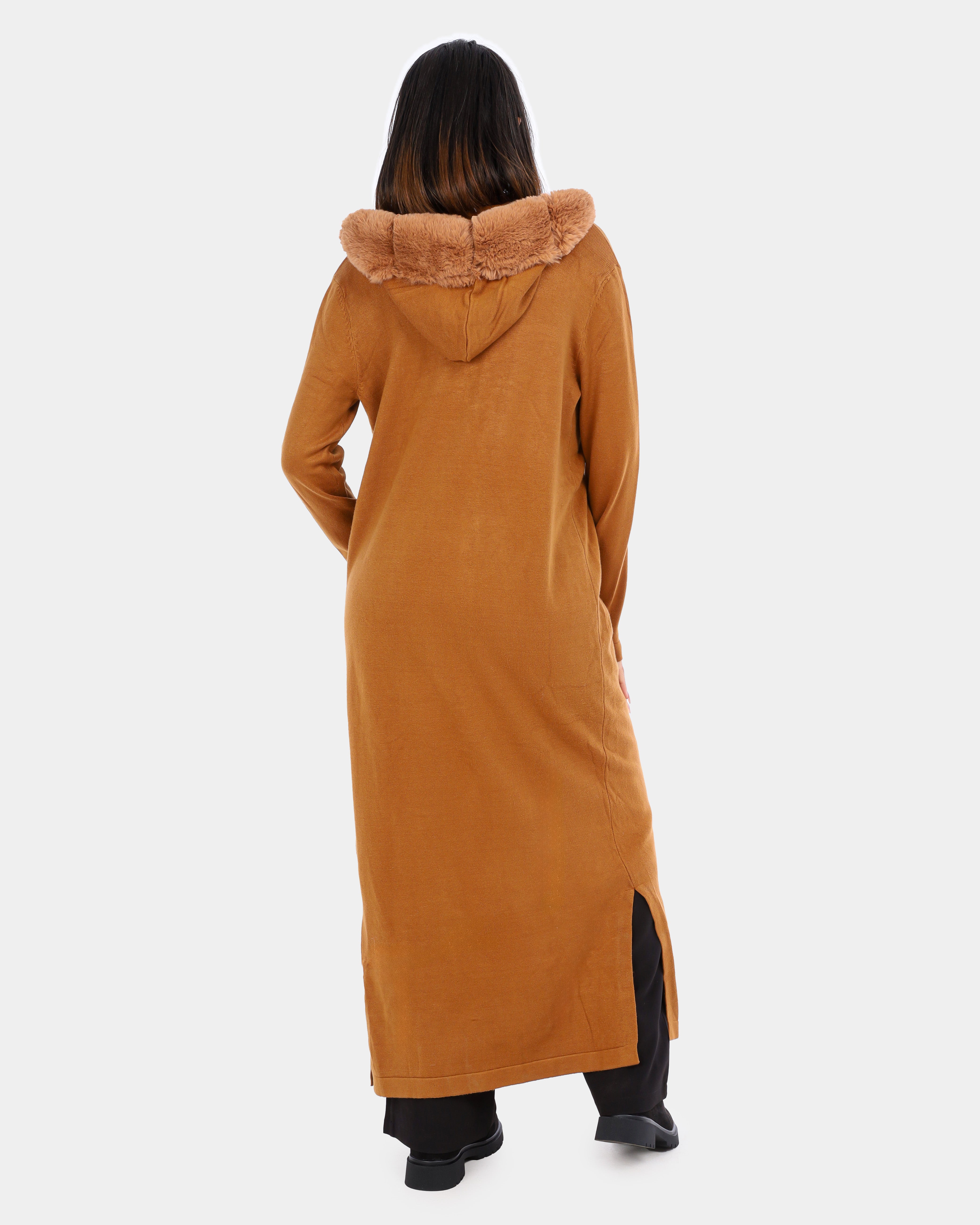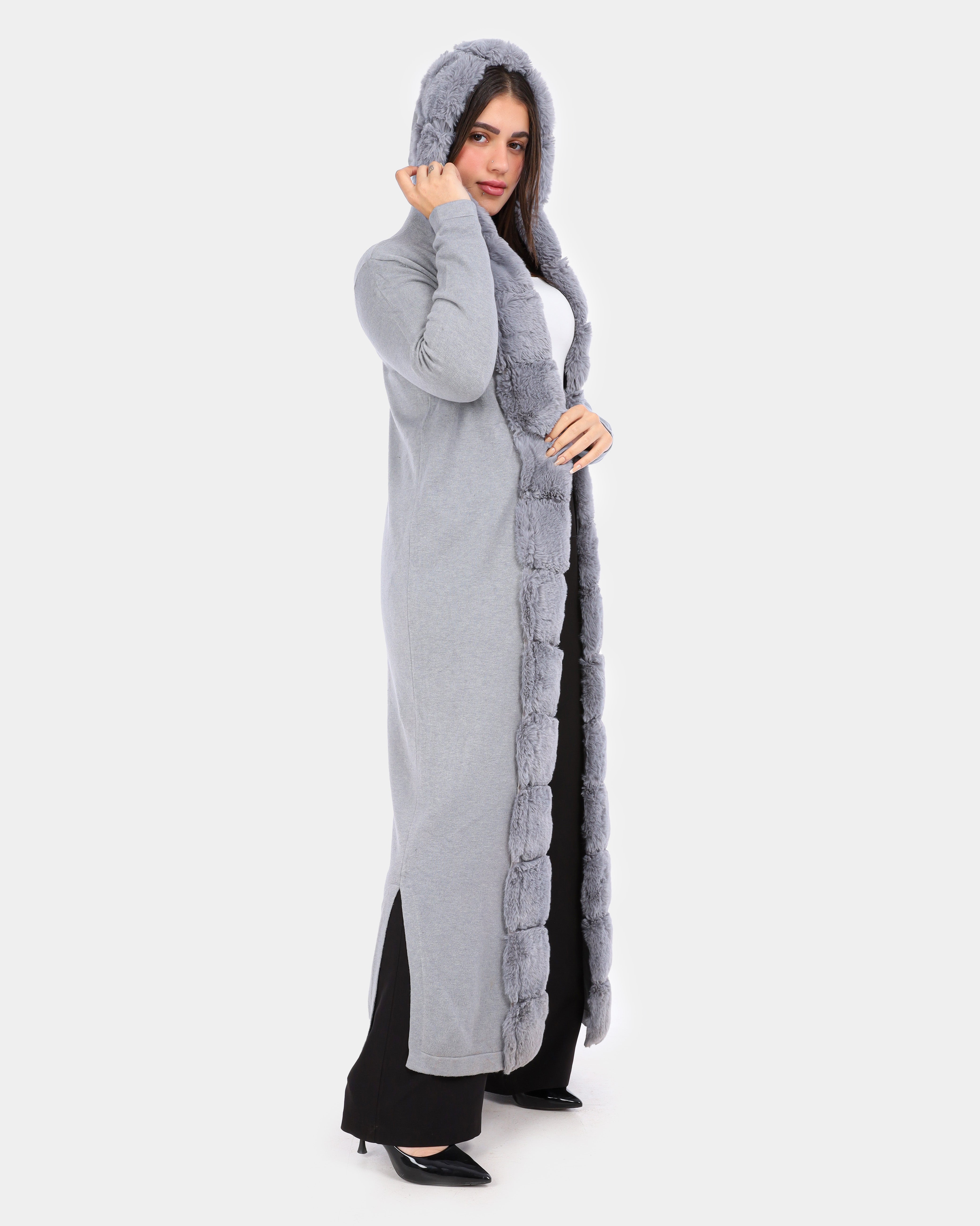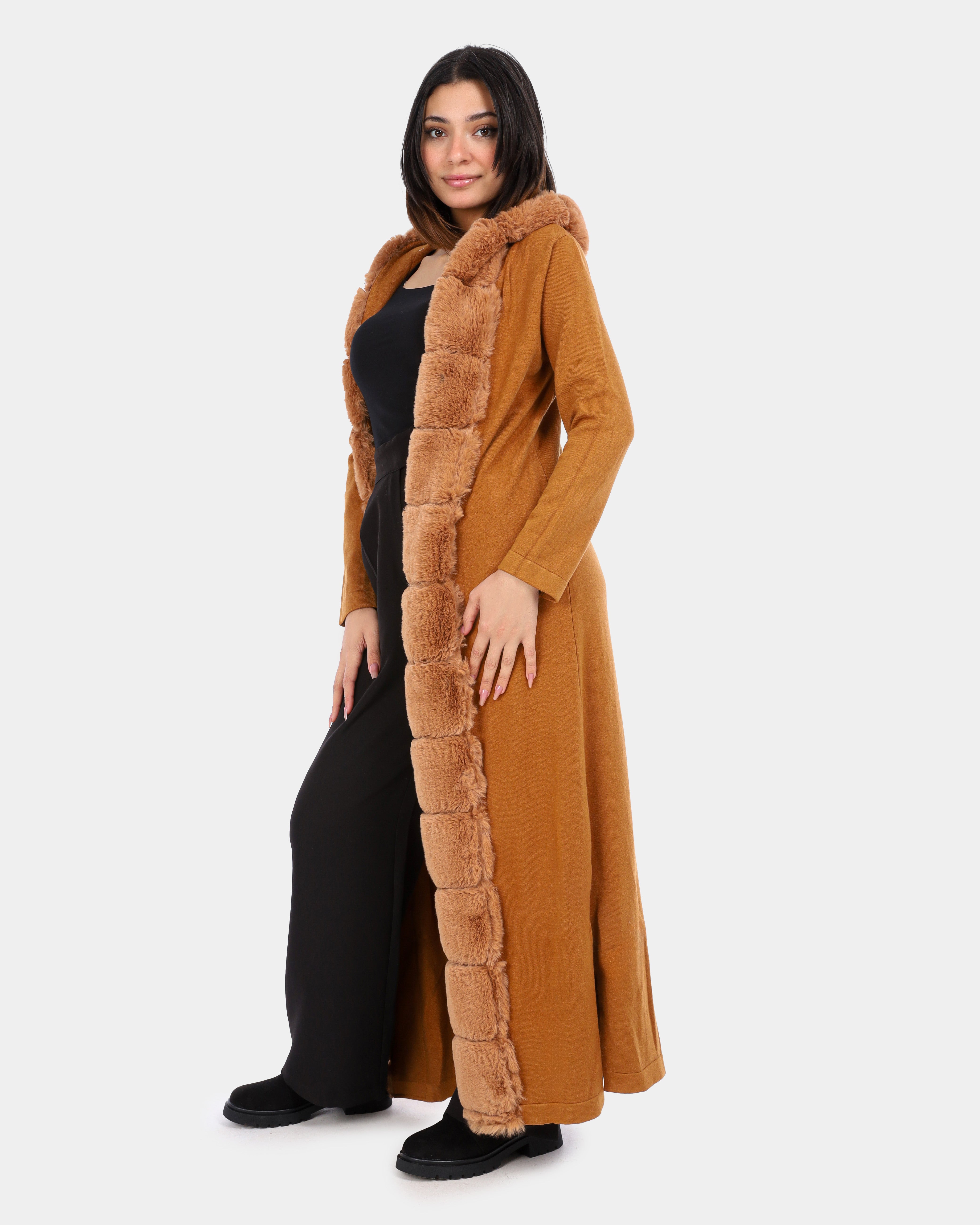 Long Hooded Cardigan with Ribbed Faux Fur Trim w1754900