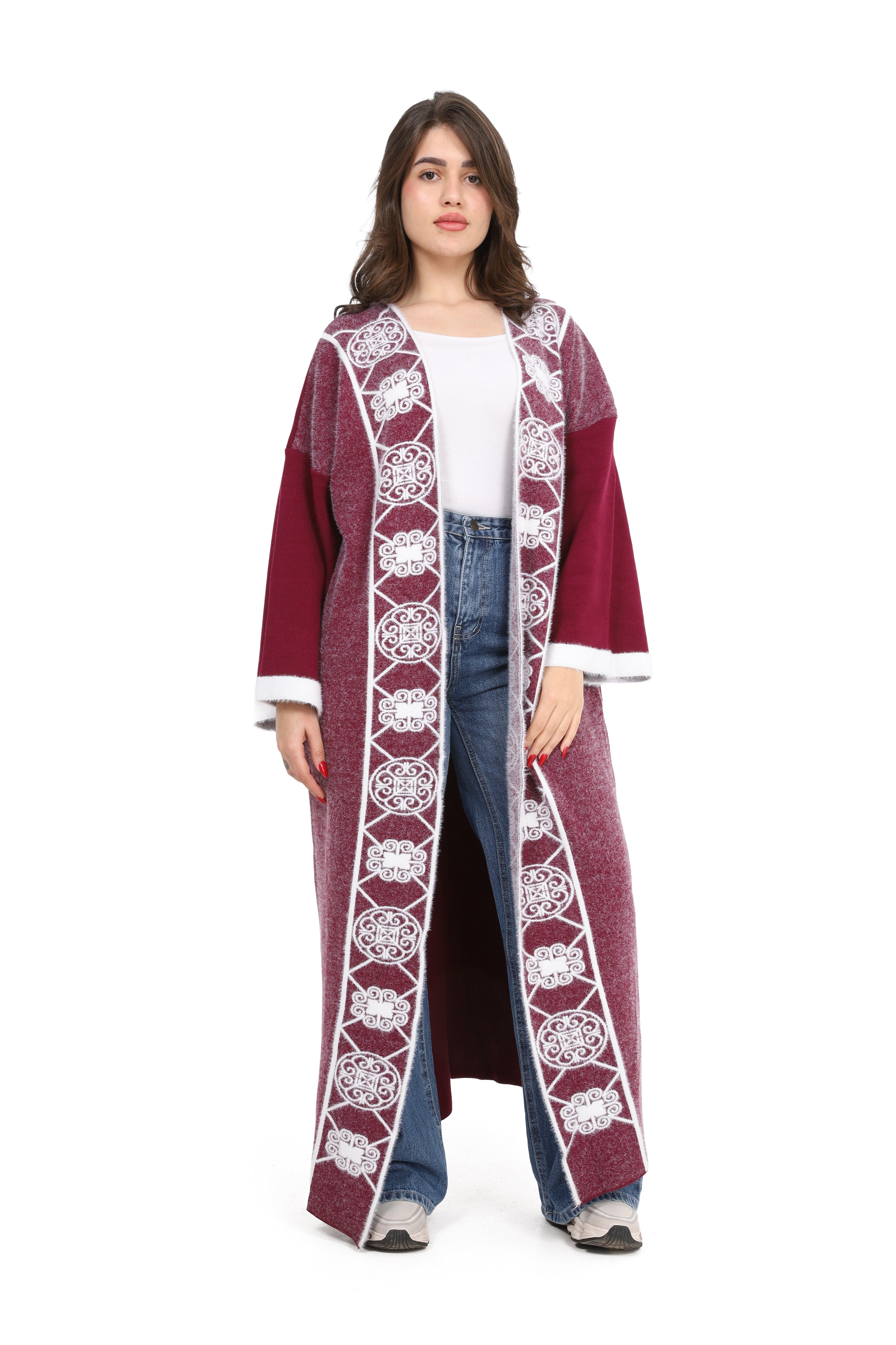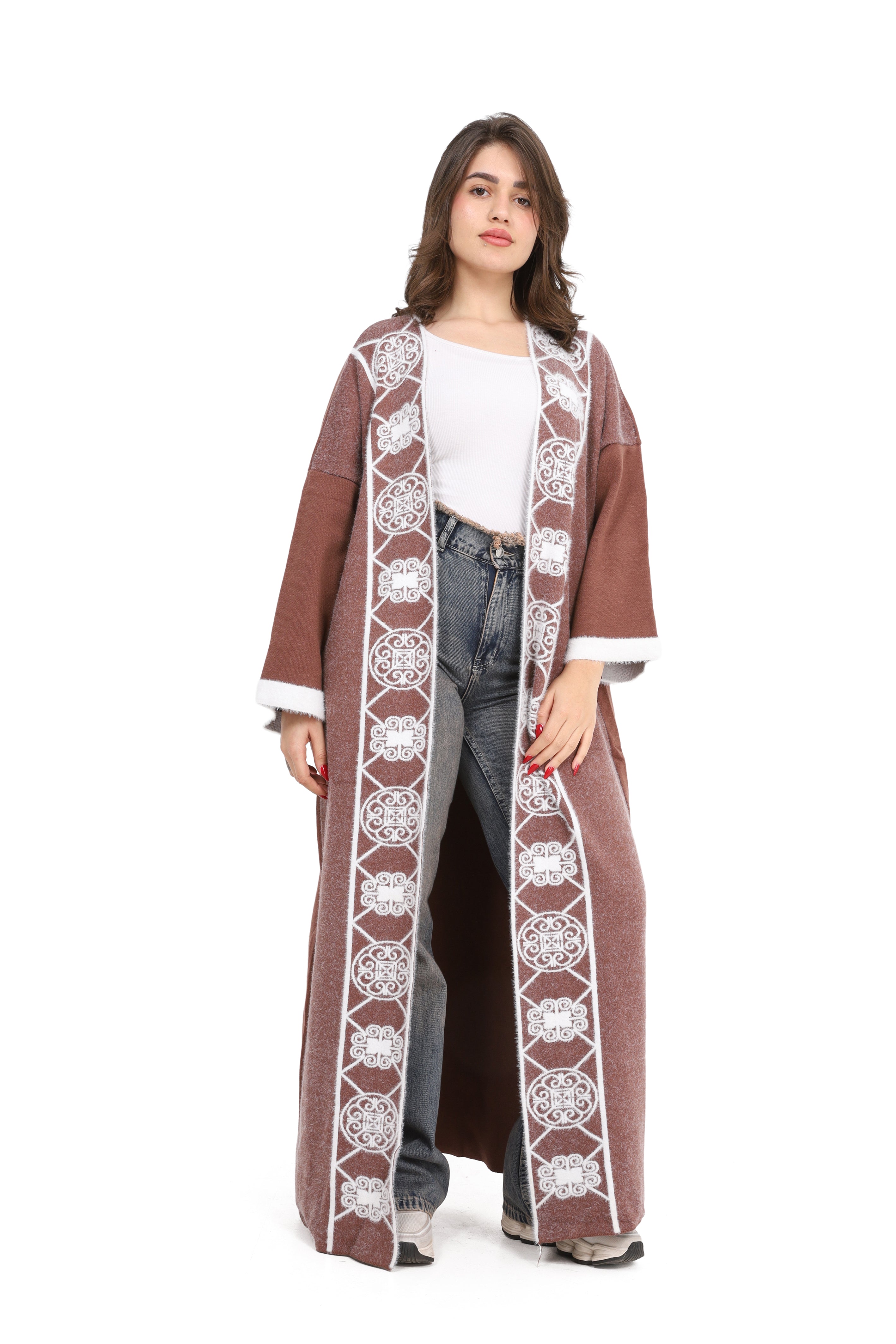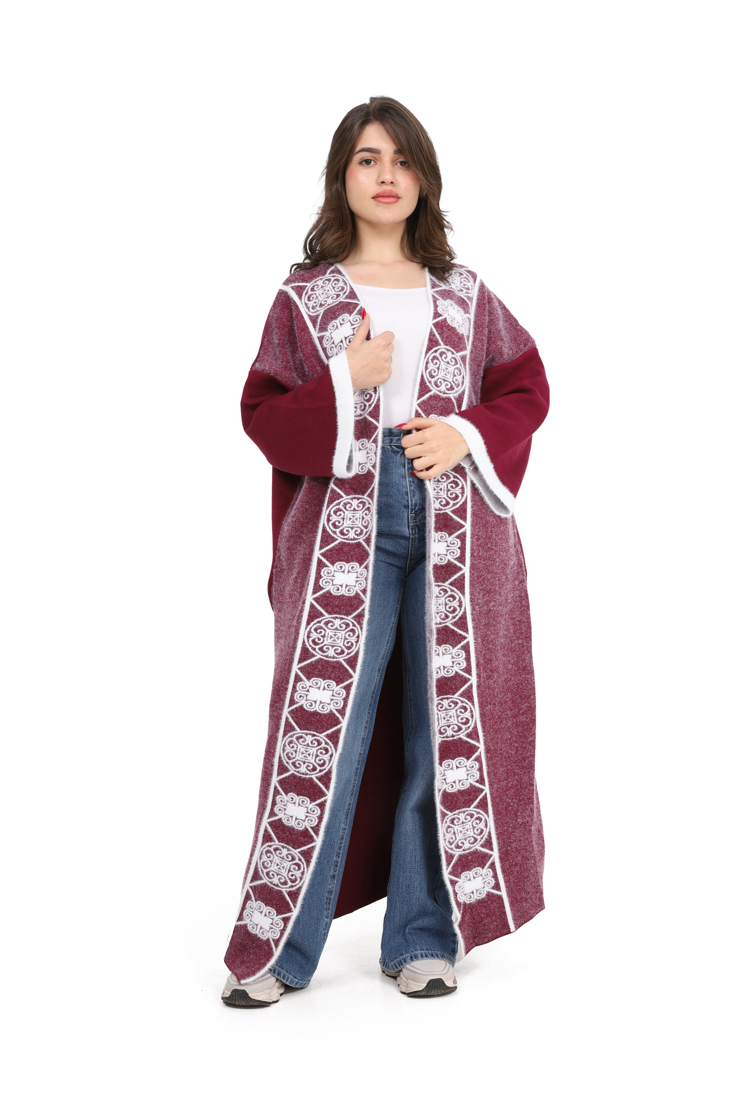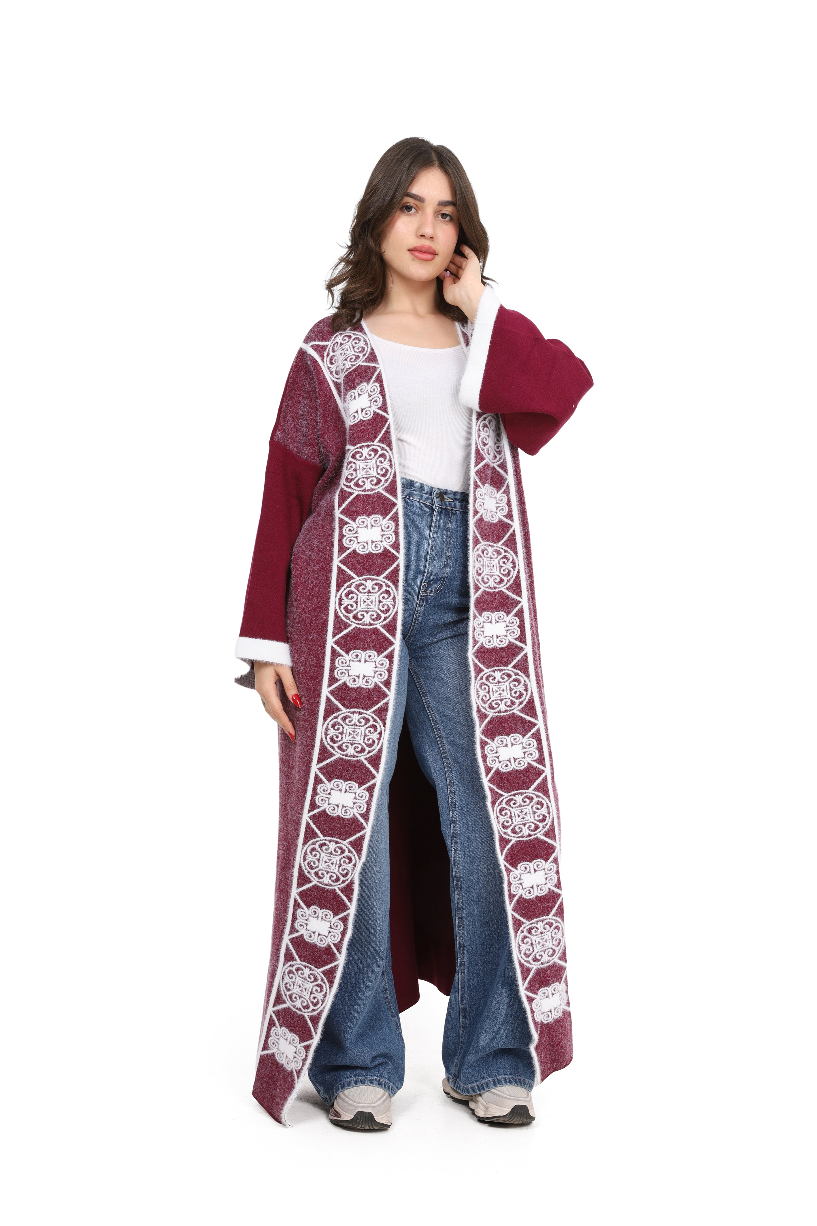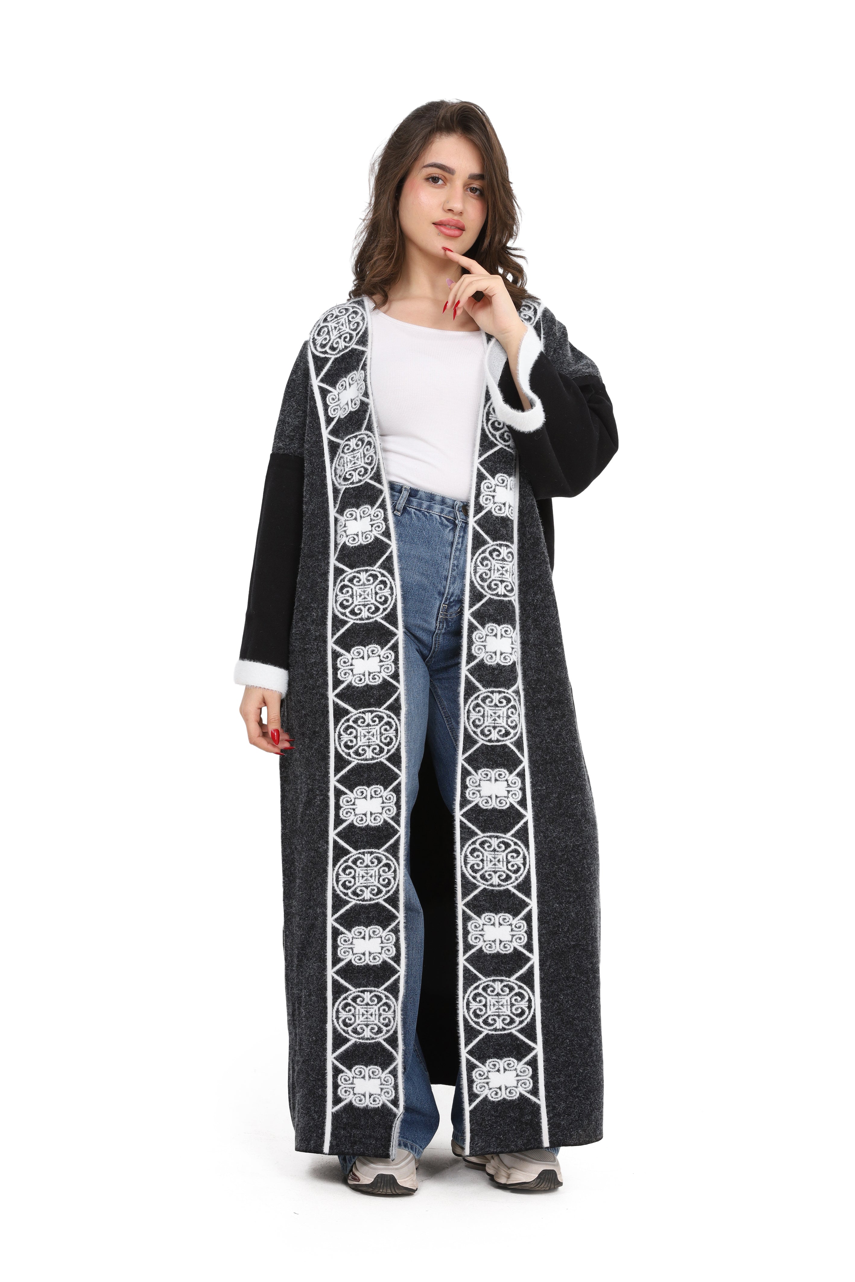 Elegant open-front long cardigan with delicate embroidered detailing on the front. Designed in a relaxed fit with wide sleeves for comfort style
