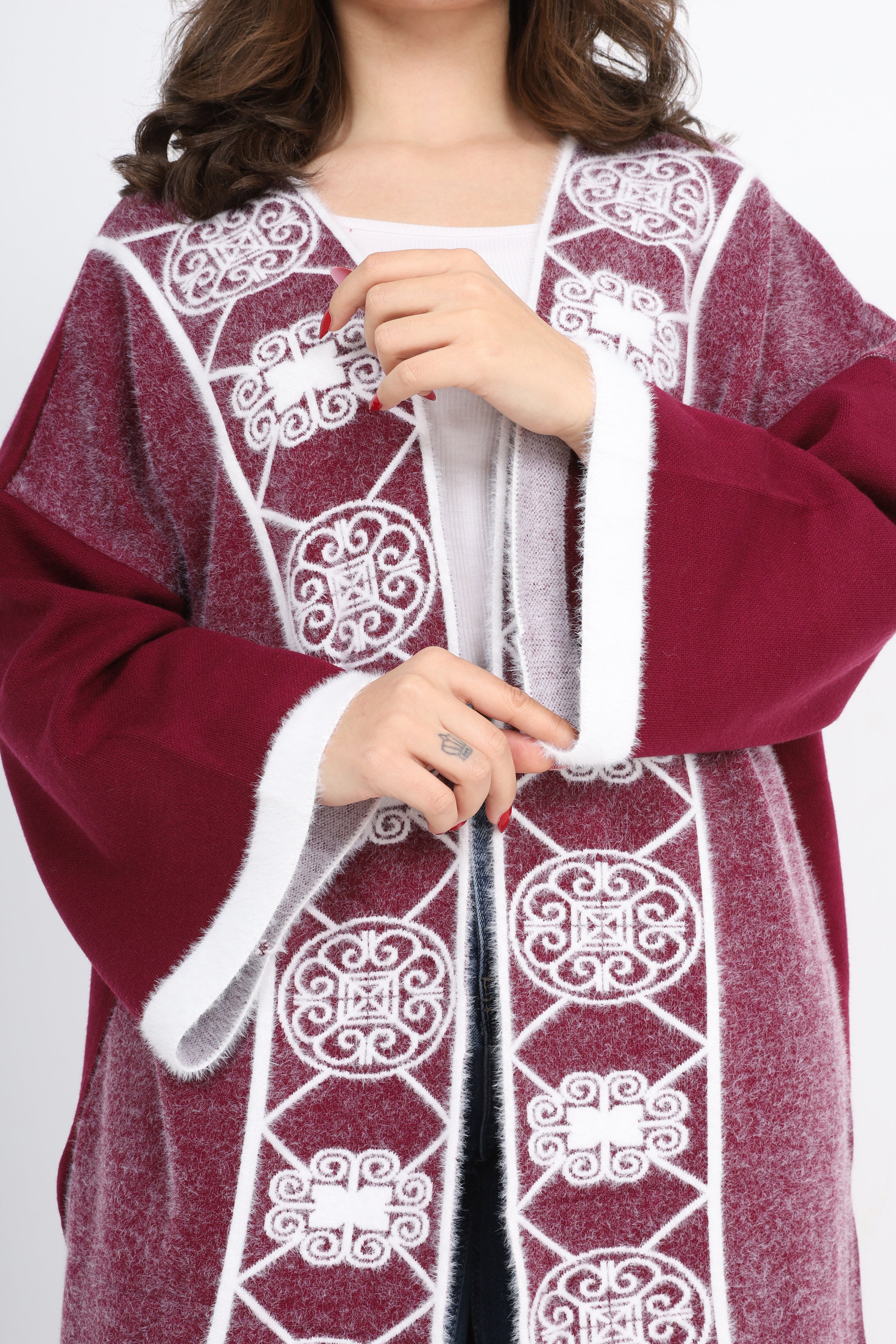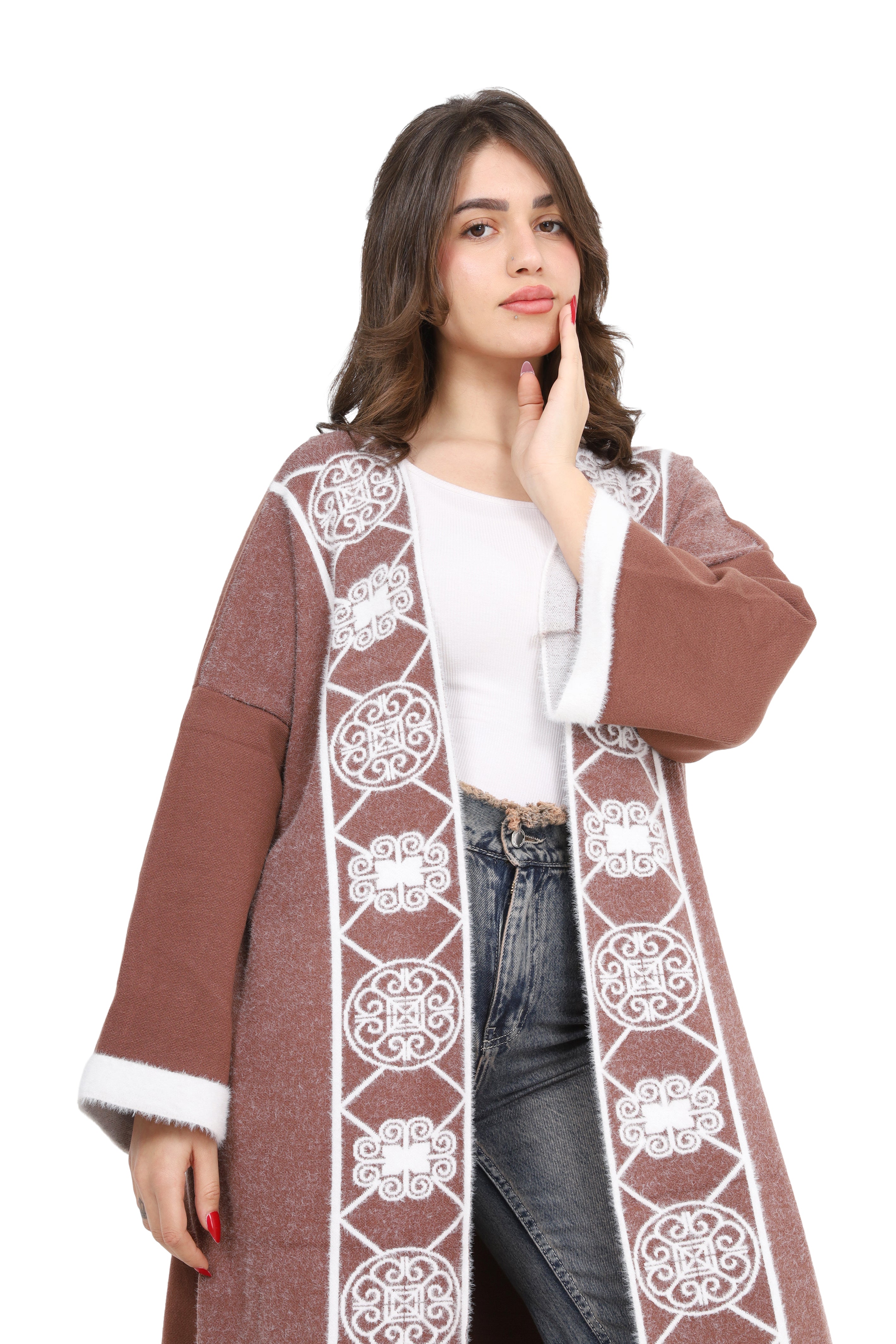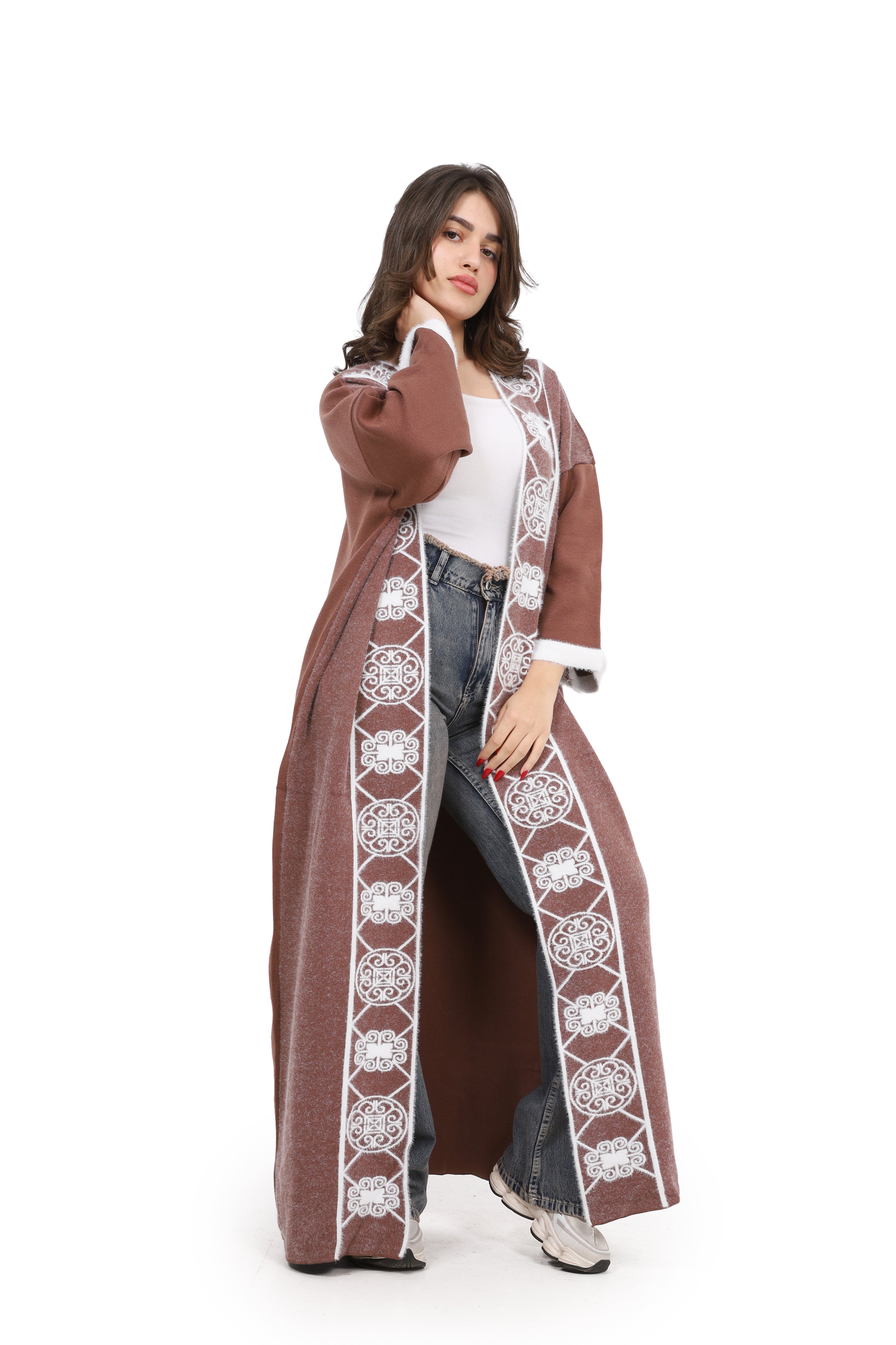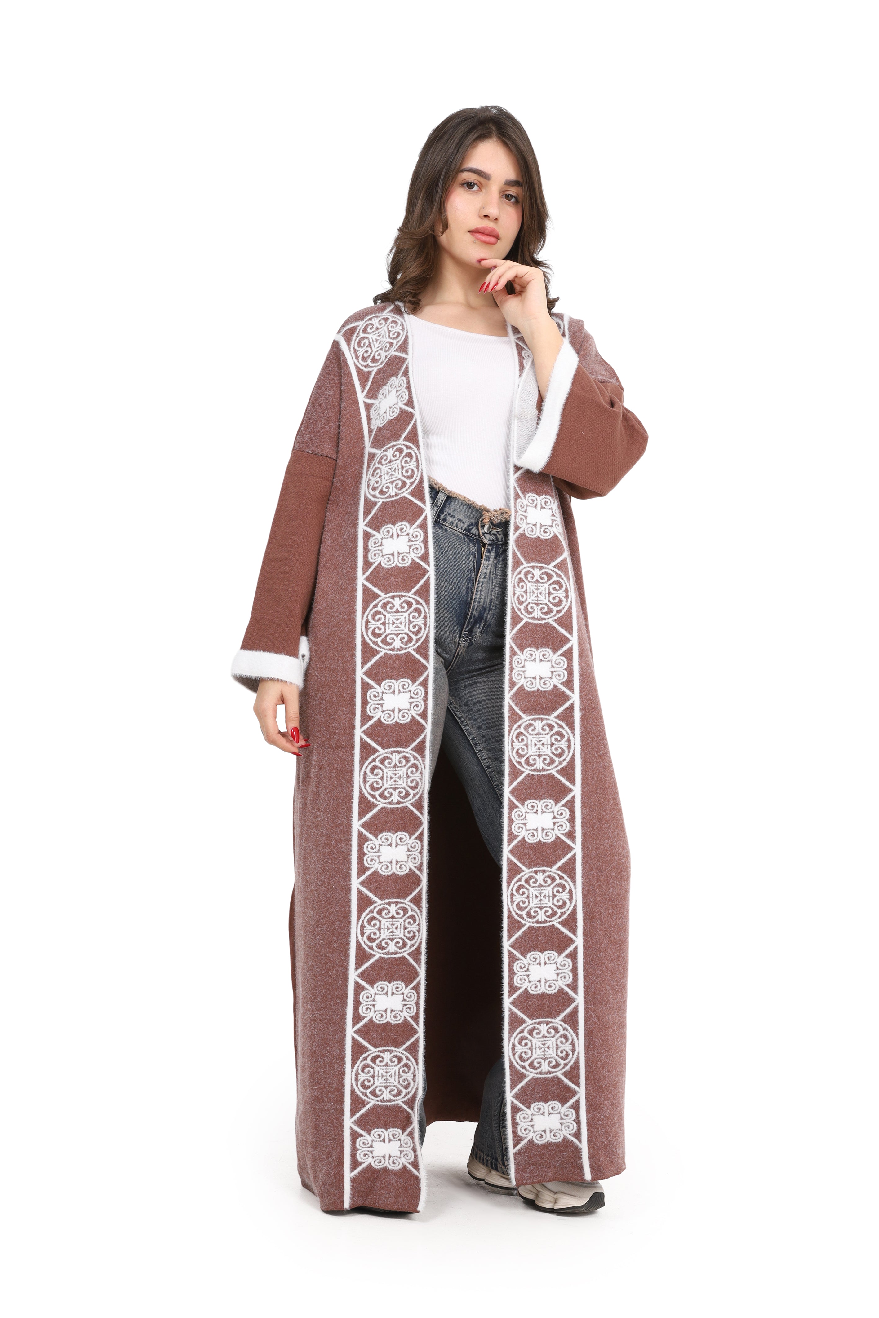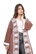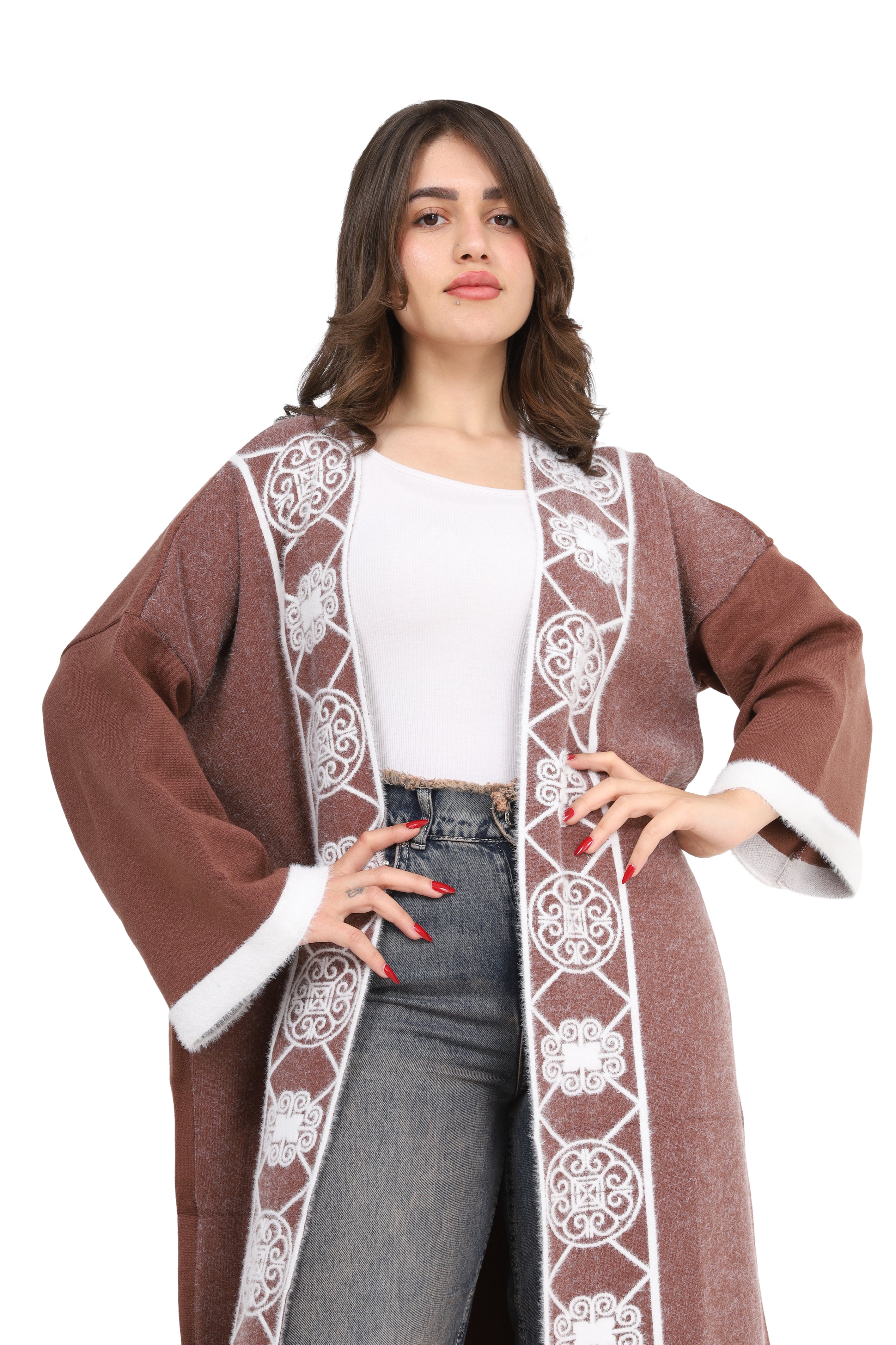 Elegant open-front long cardigan with delicate embroidered detailing on the front. Designed in a relaxed fit with wide sleeves for comfort style