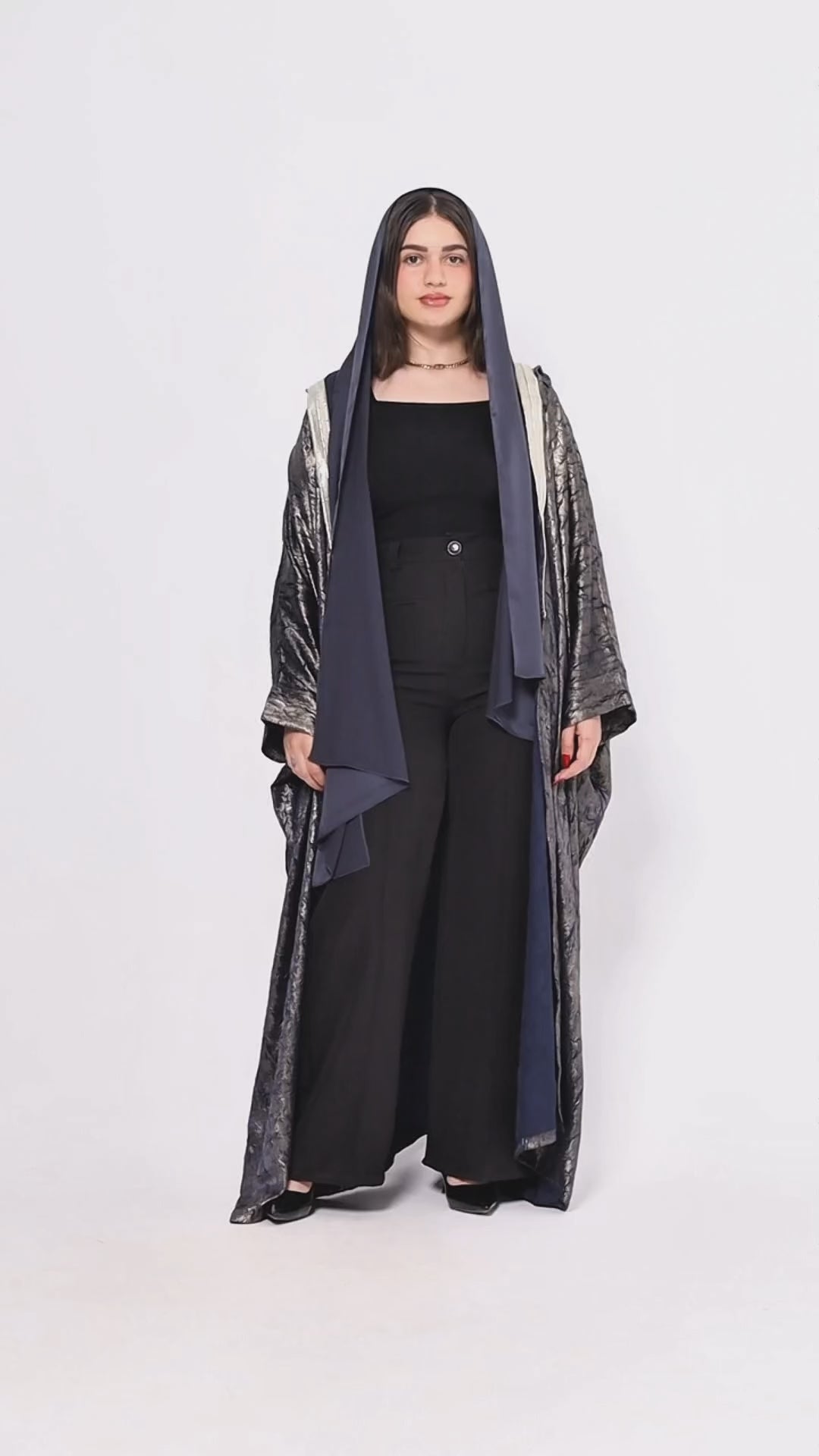 Elegant open cardigan designed with a simple decorative line and hood.