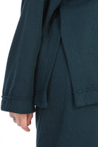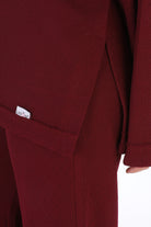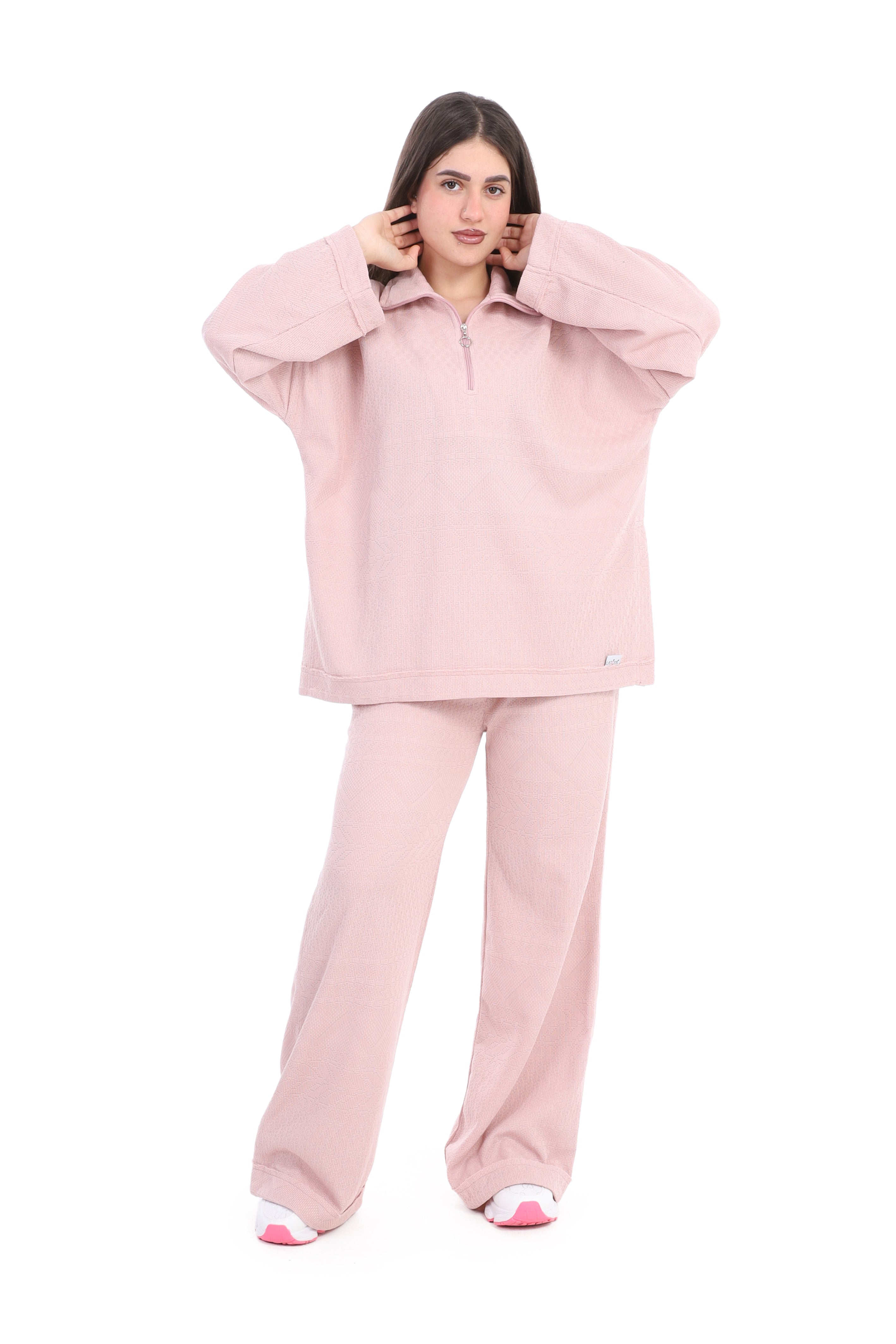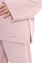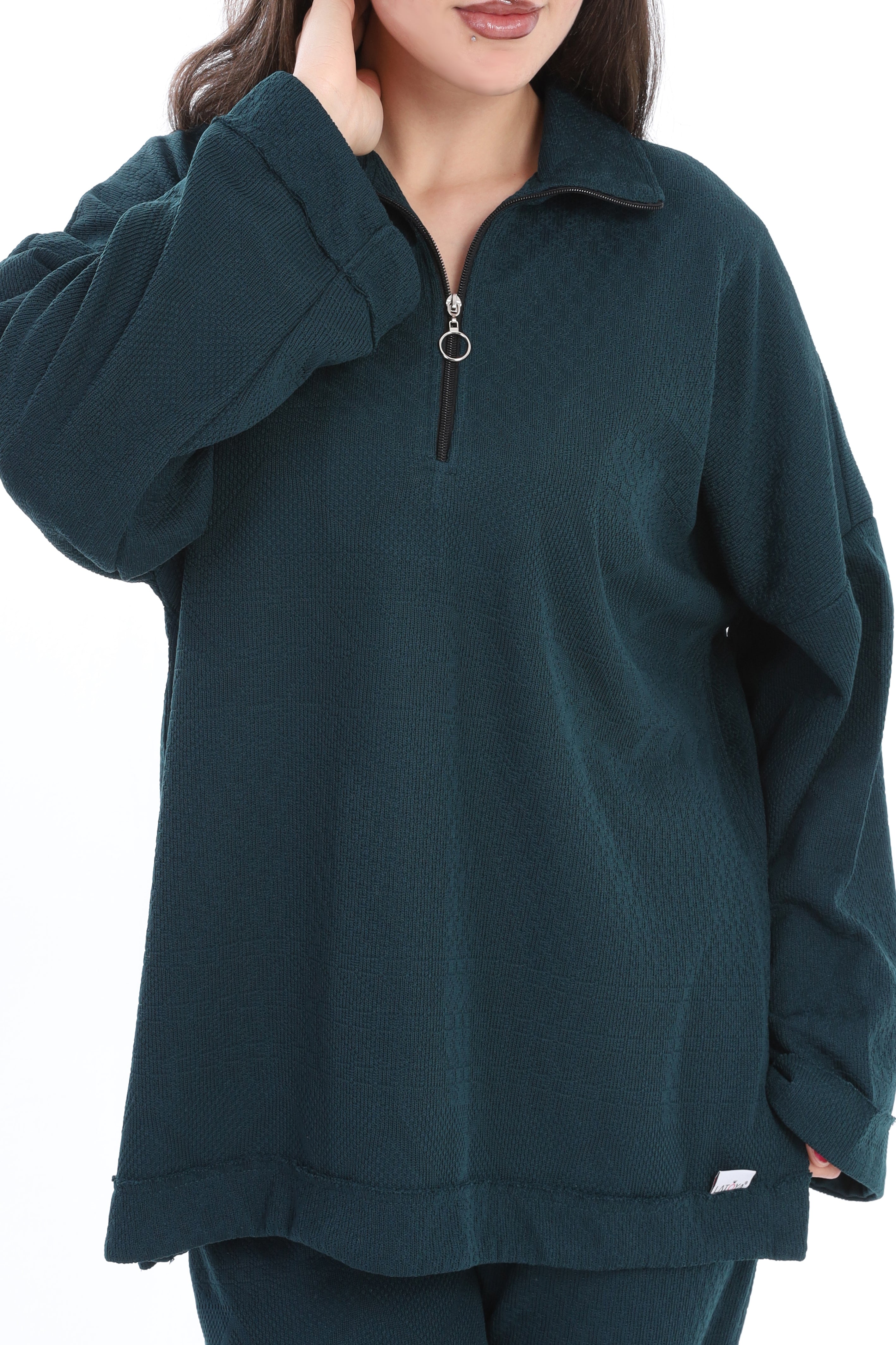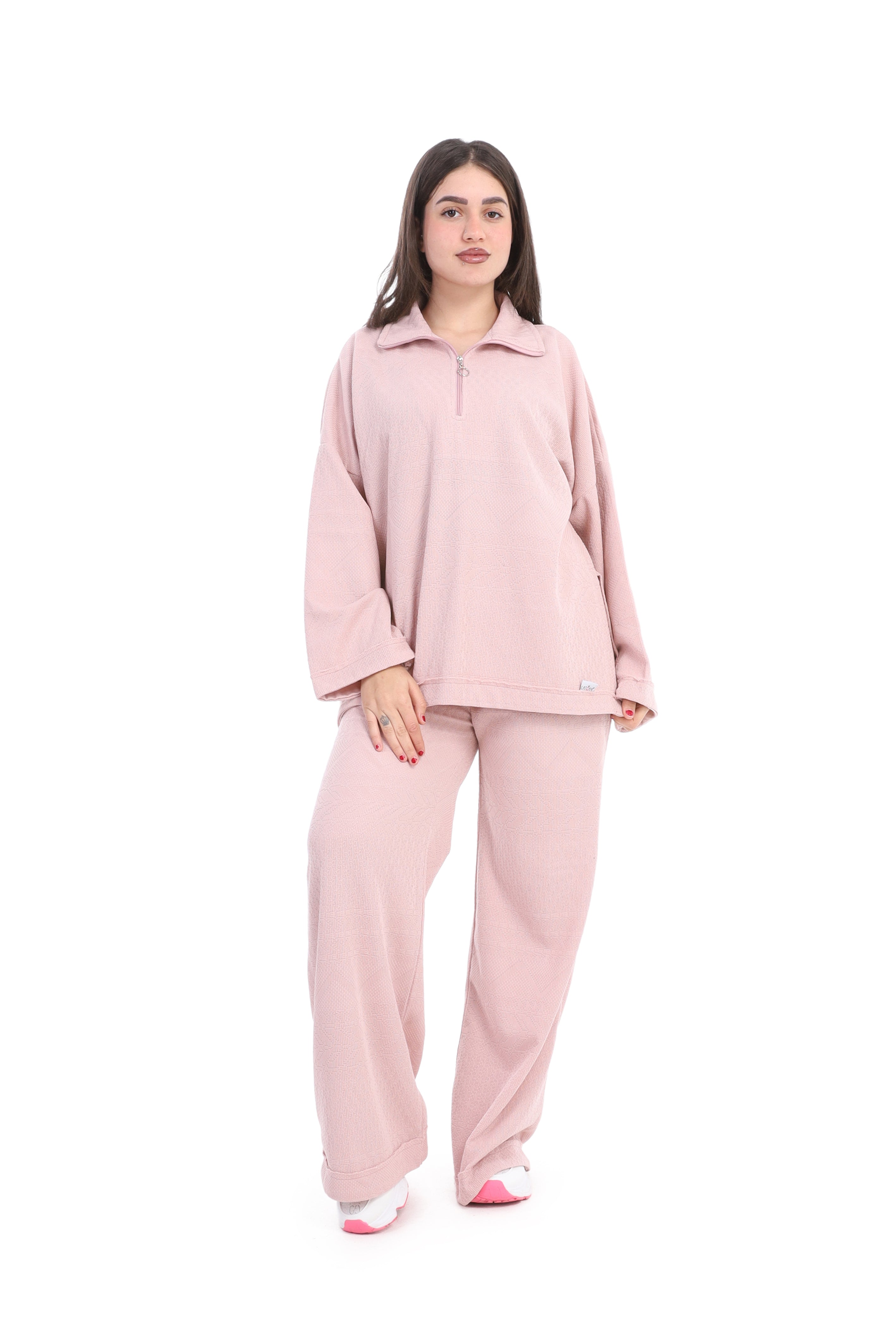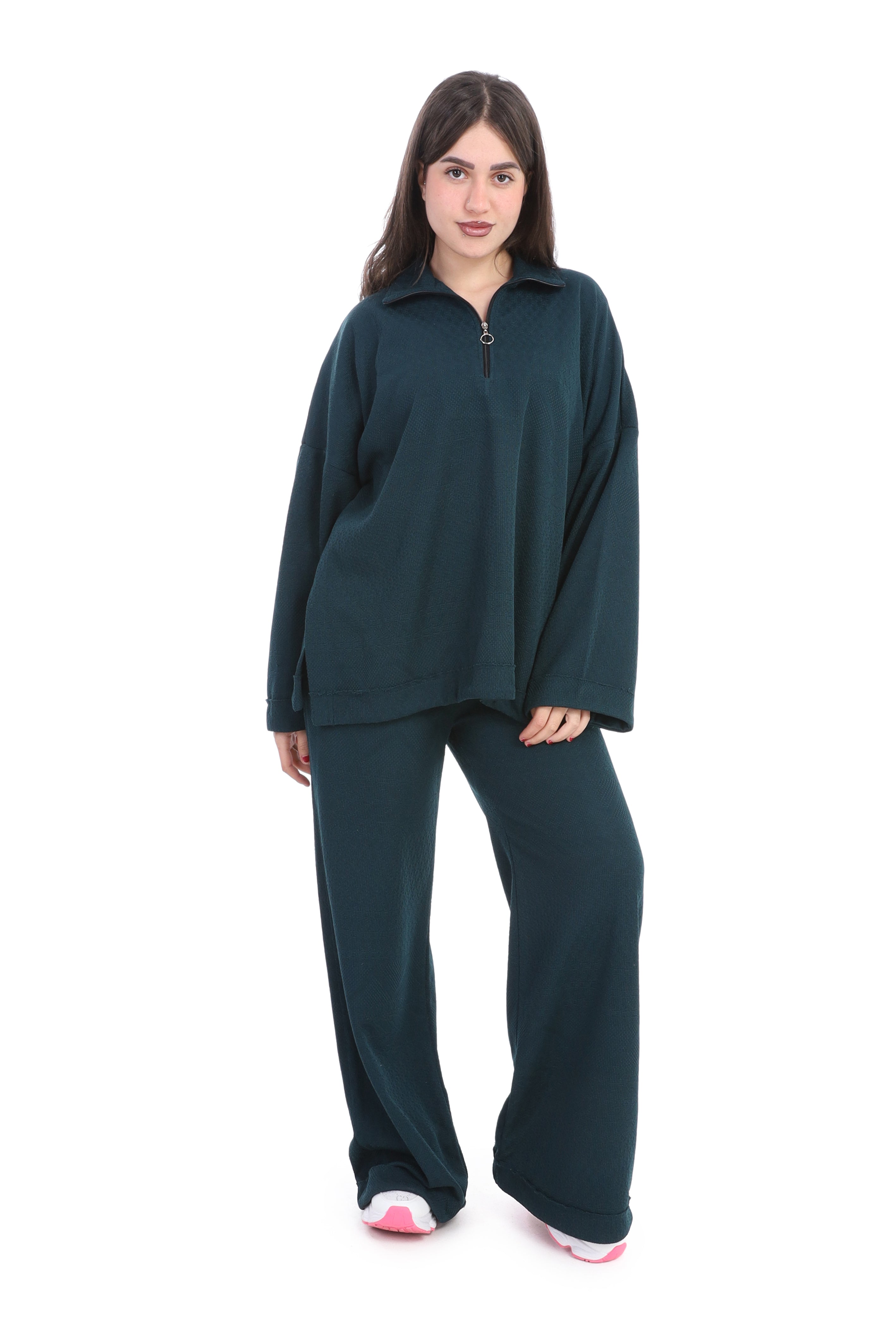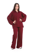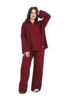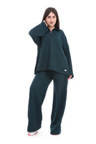 A relaxed two-piece lounge set in a cozy, casual look. The top features a loose, oversized fit with a half-zip mock neck collar.