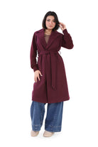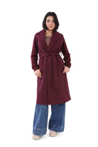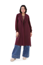 Open-front long coat crafted from a soft wool blend fabric.