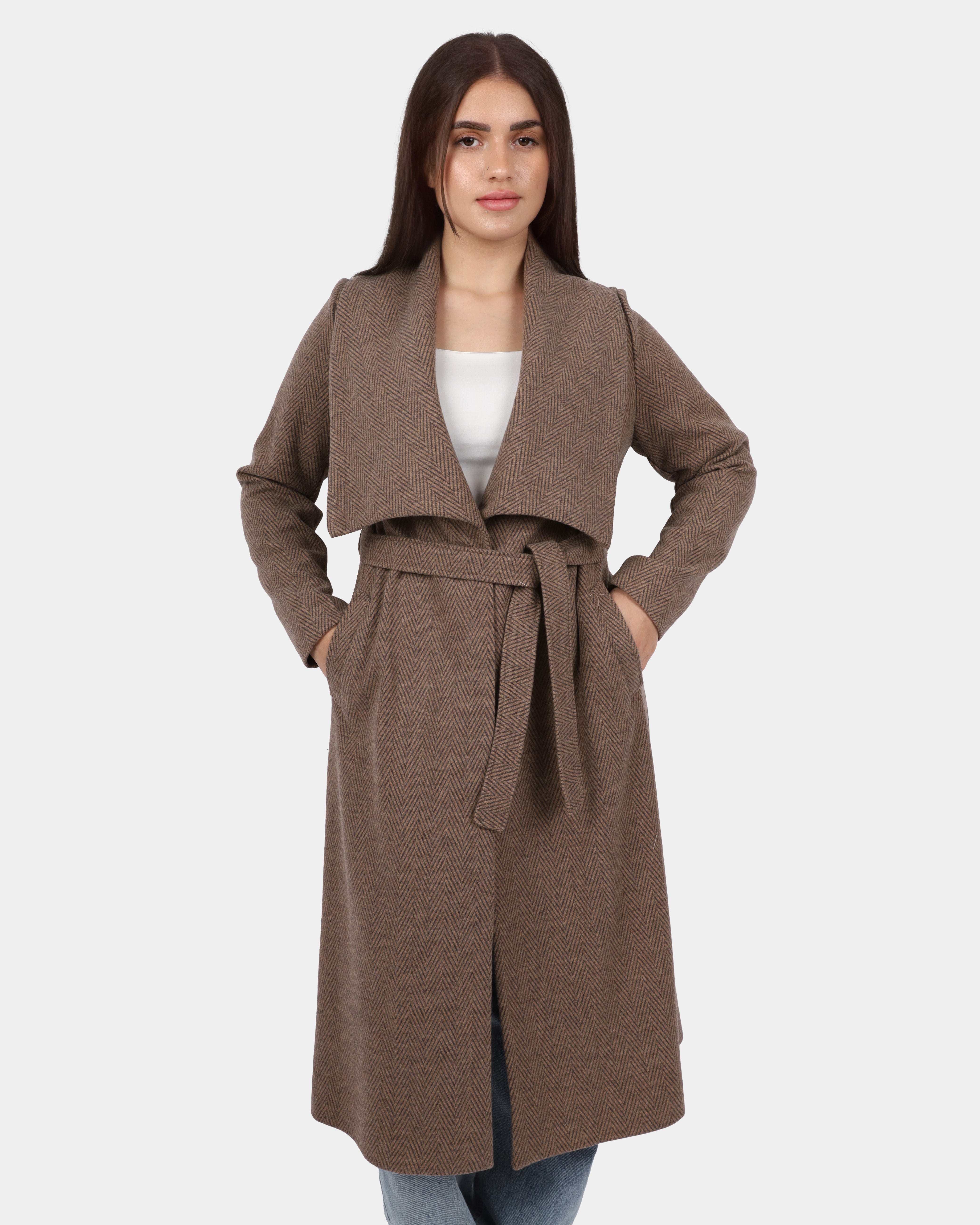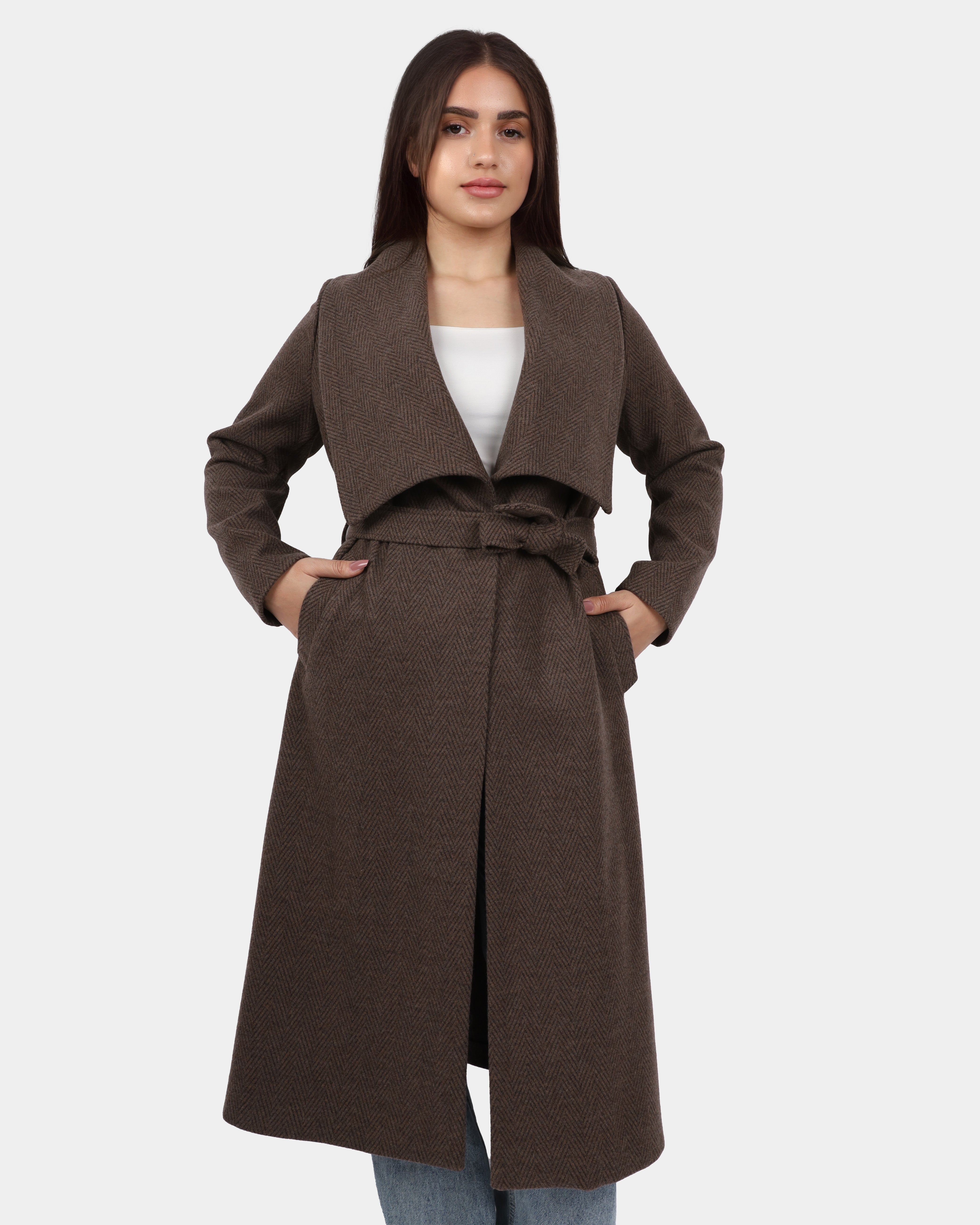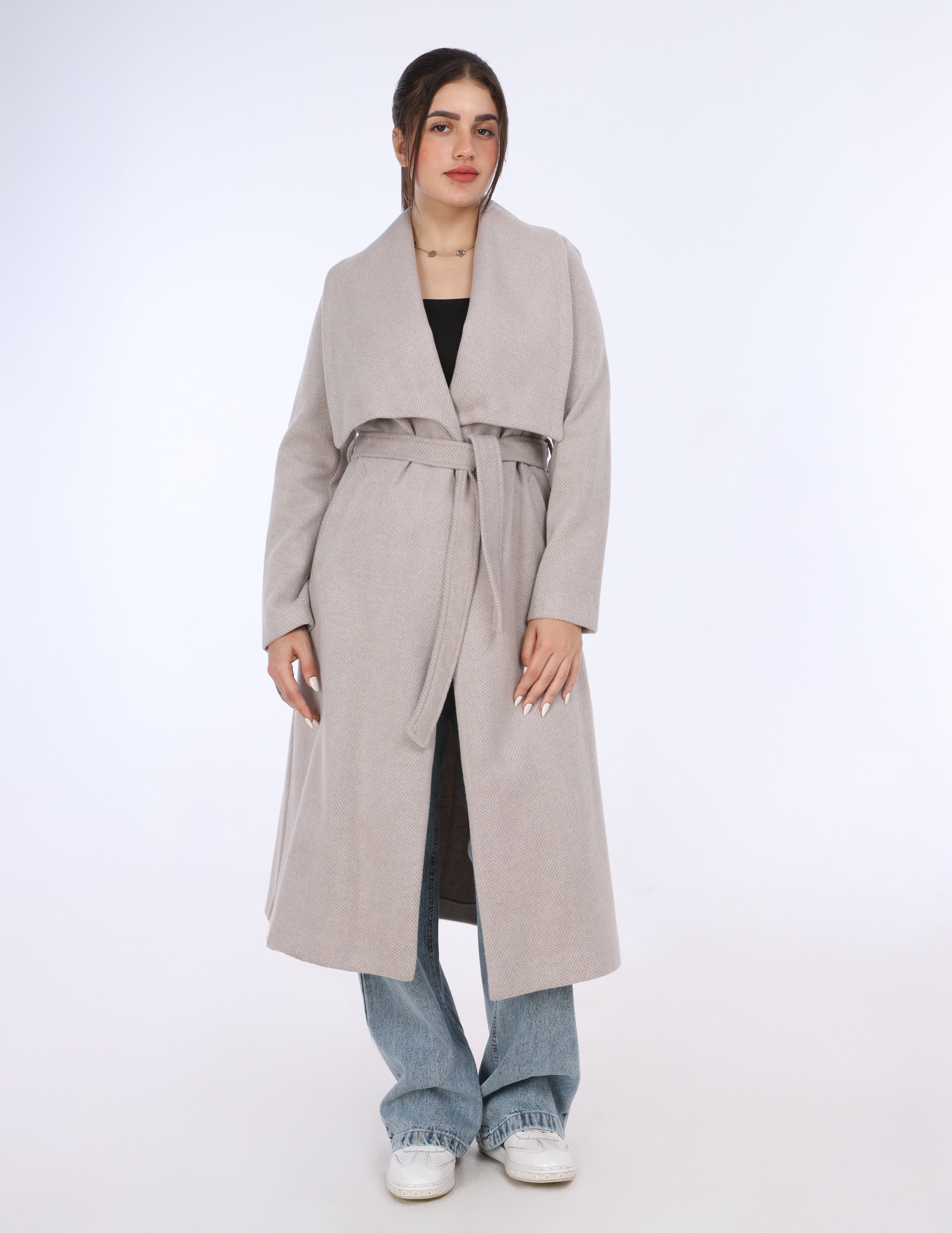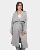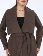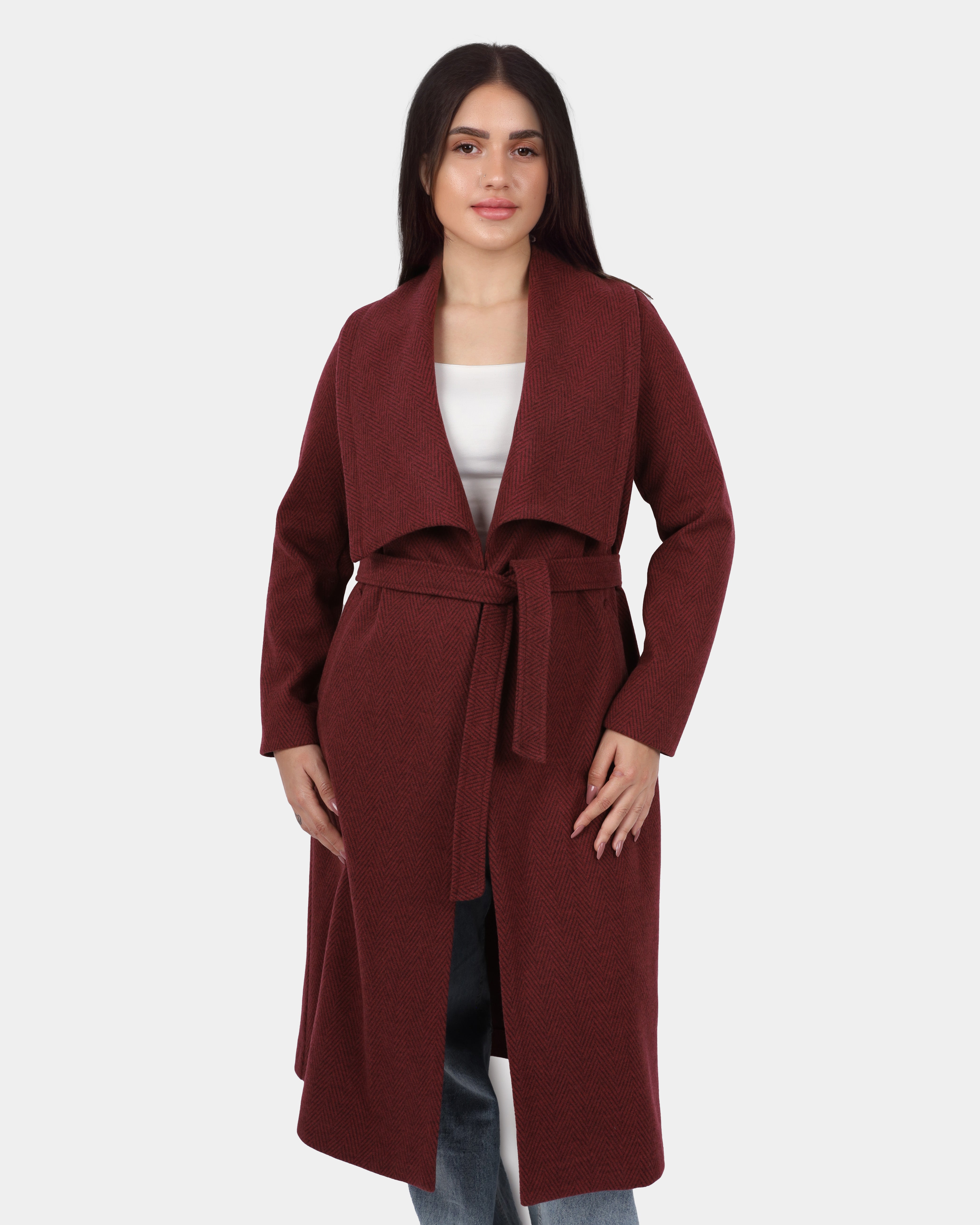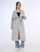 A long coat with a wide shawl collar and a belted waist, offering a cozy, elegant look perfect for layering.
