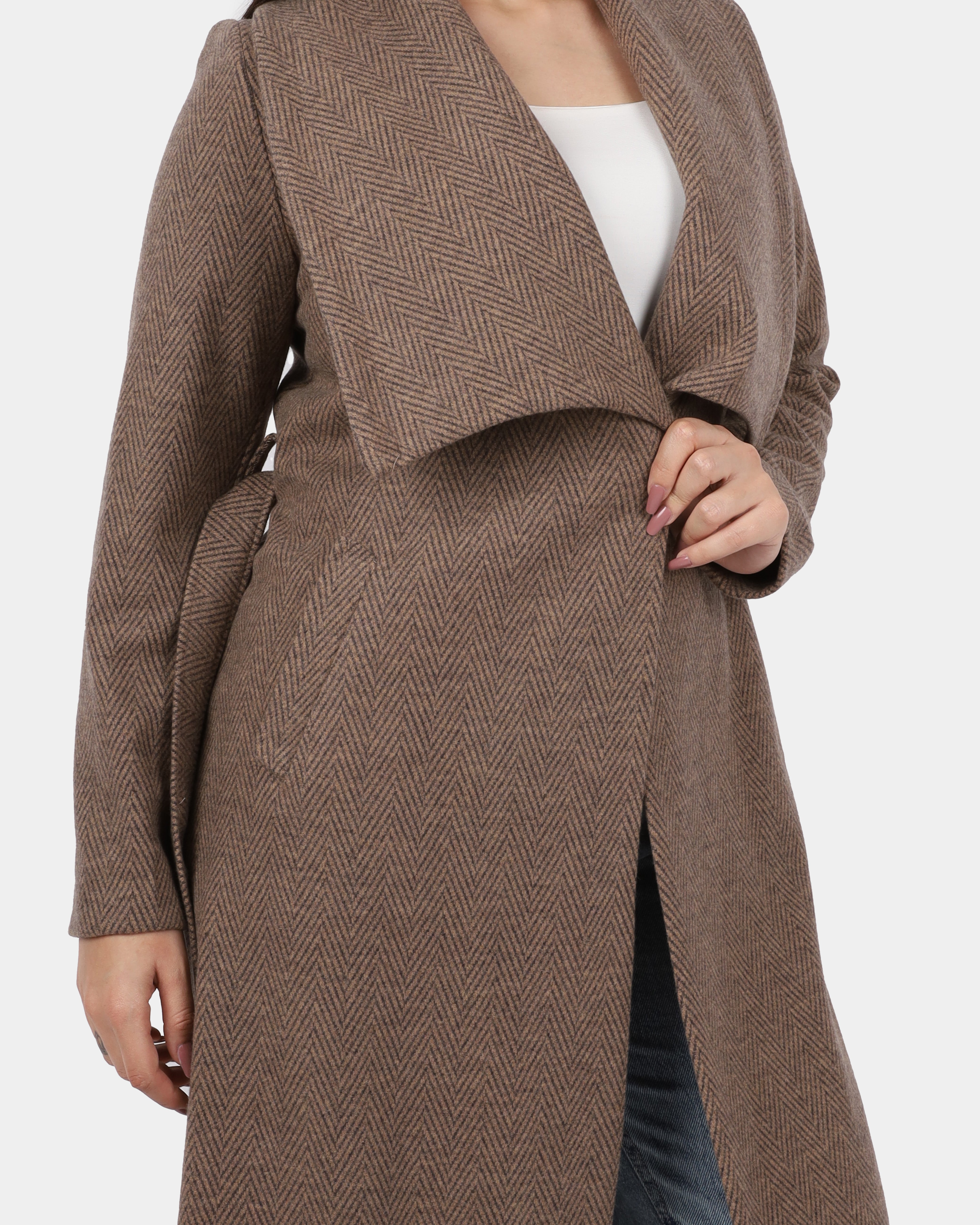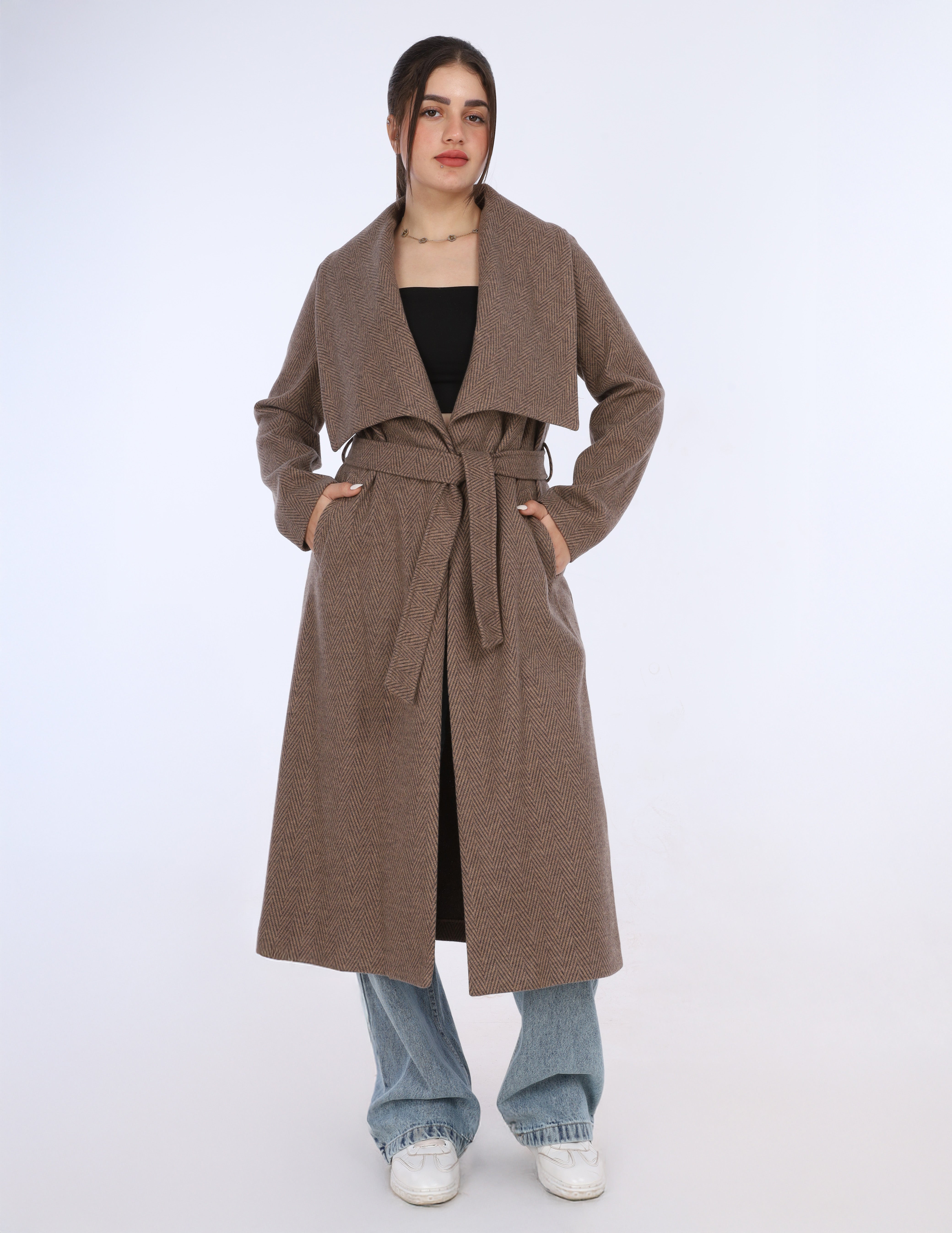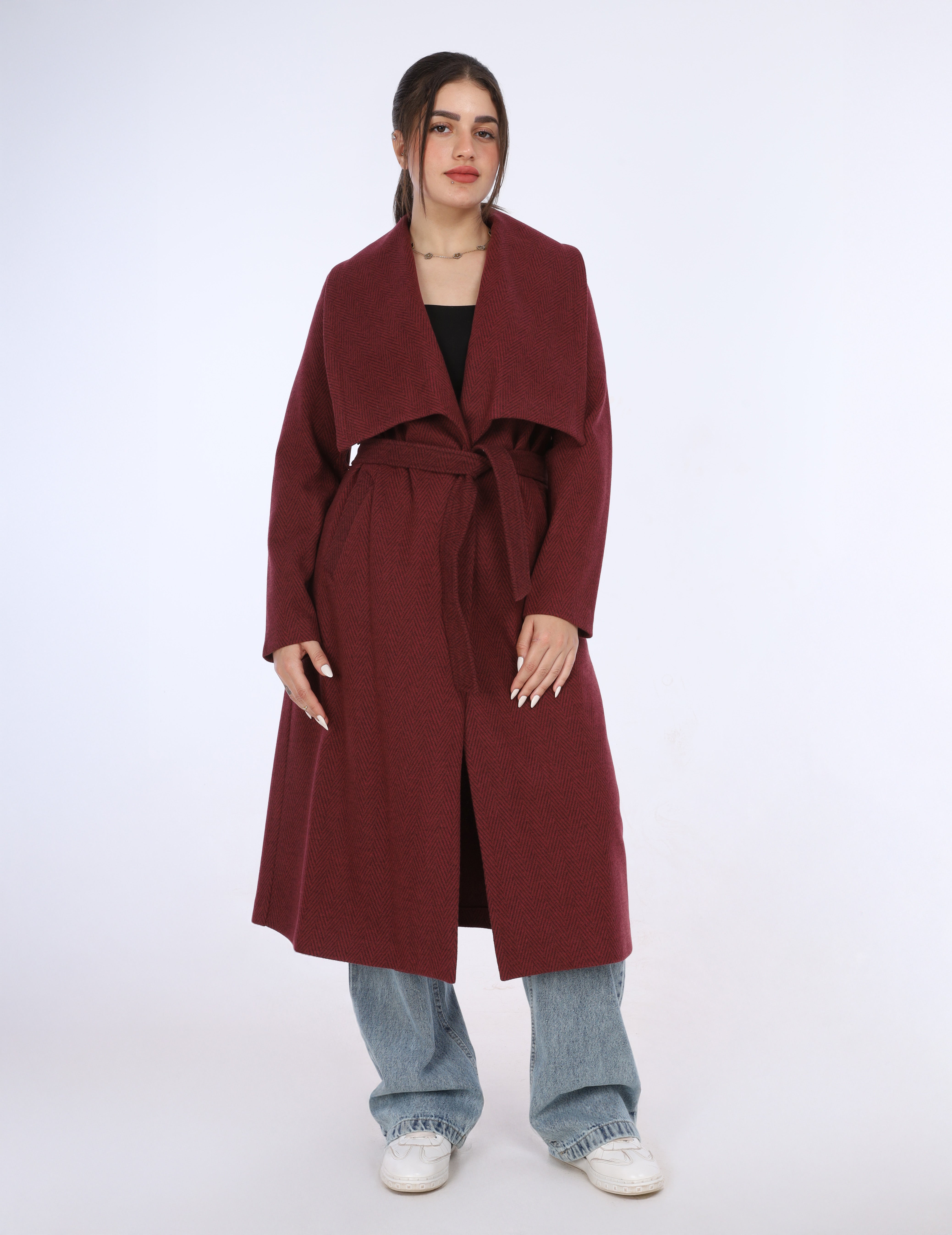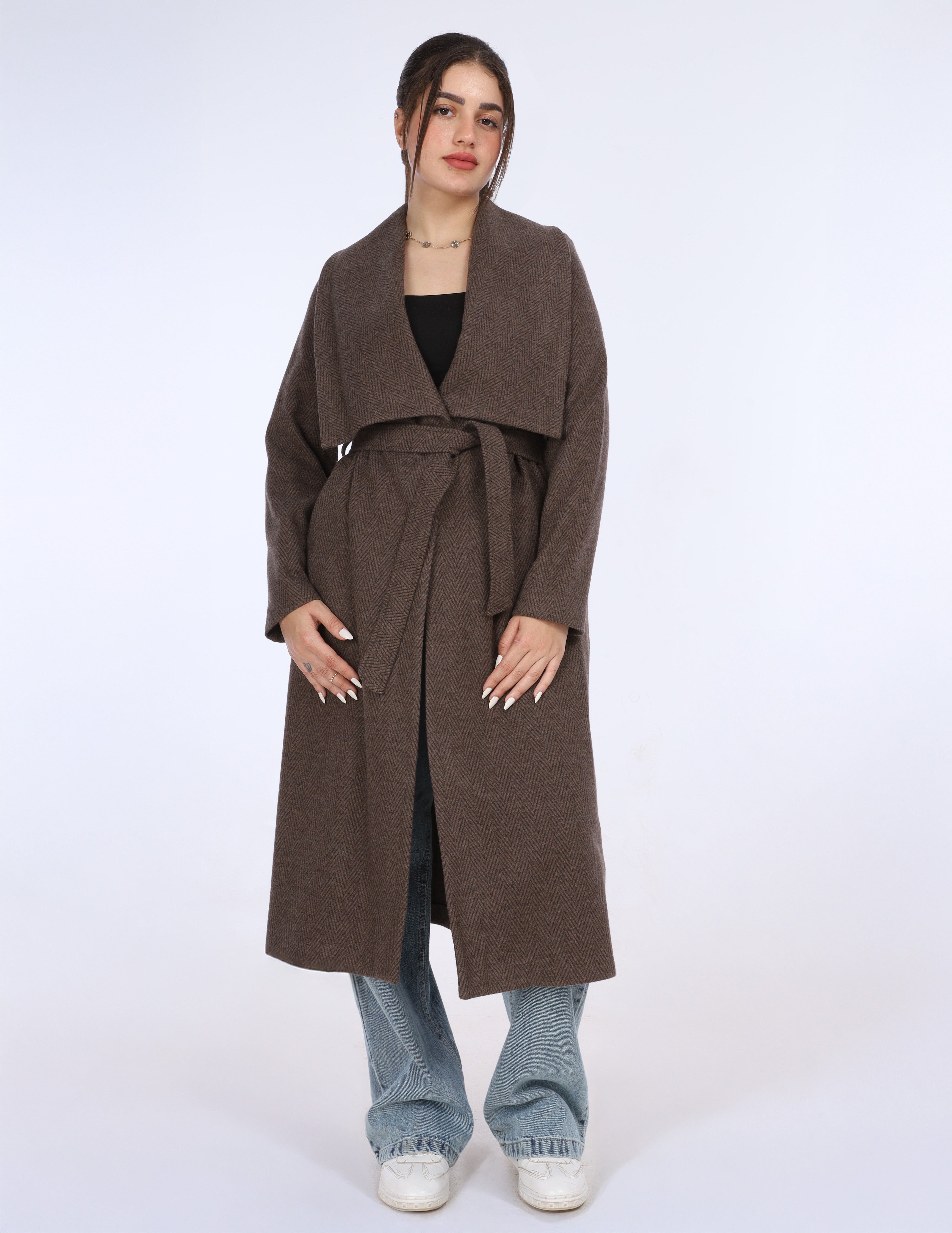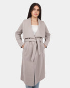 A long coat with a wide shawl collar and a belted waist, offering a cozy, elegant look perfect for layering.
