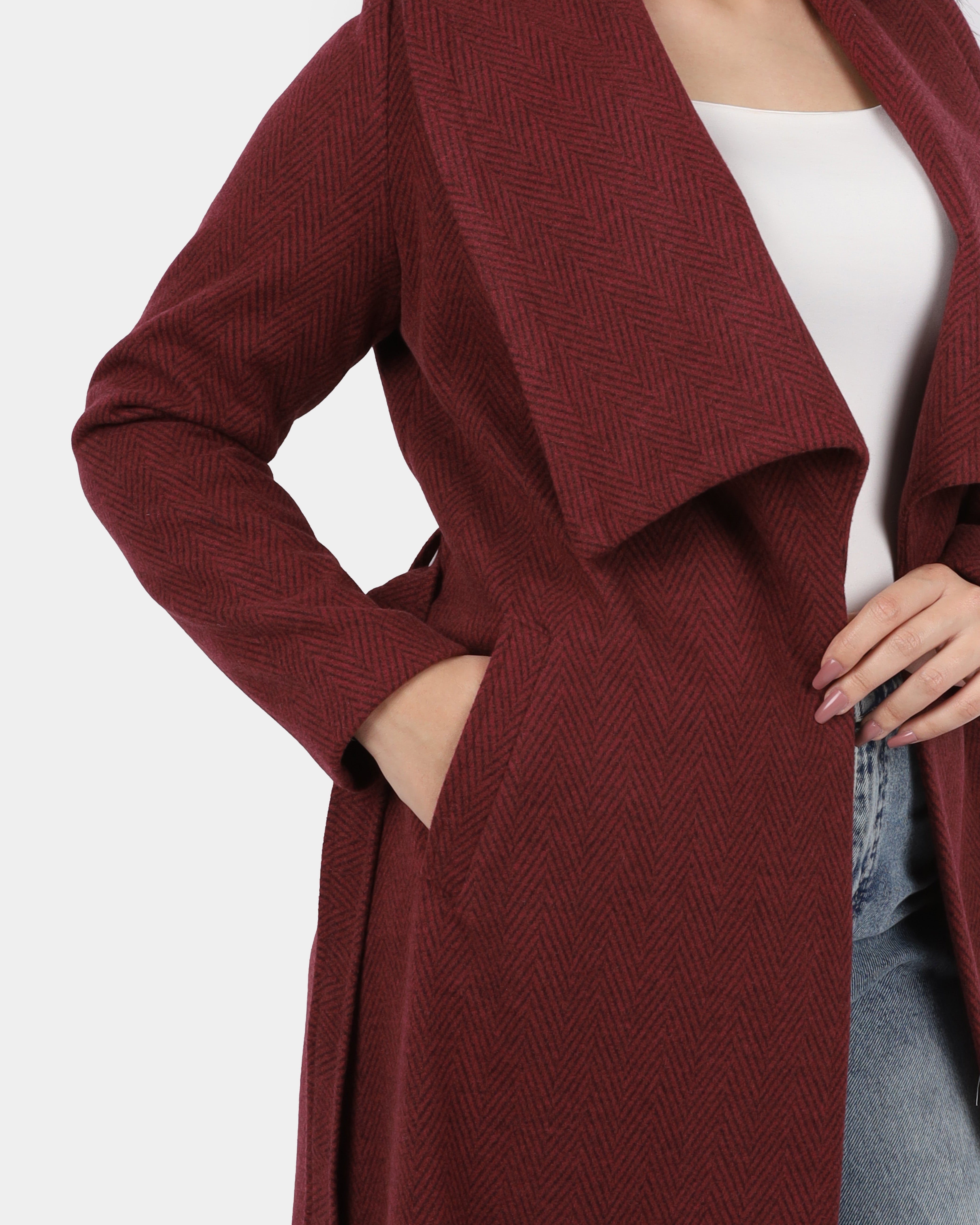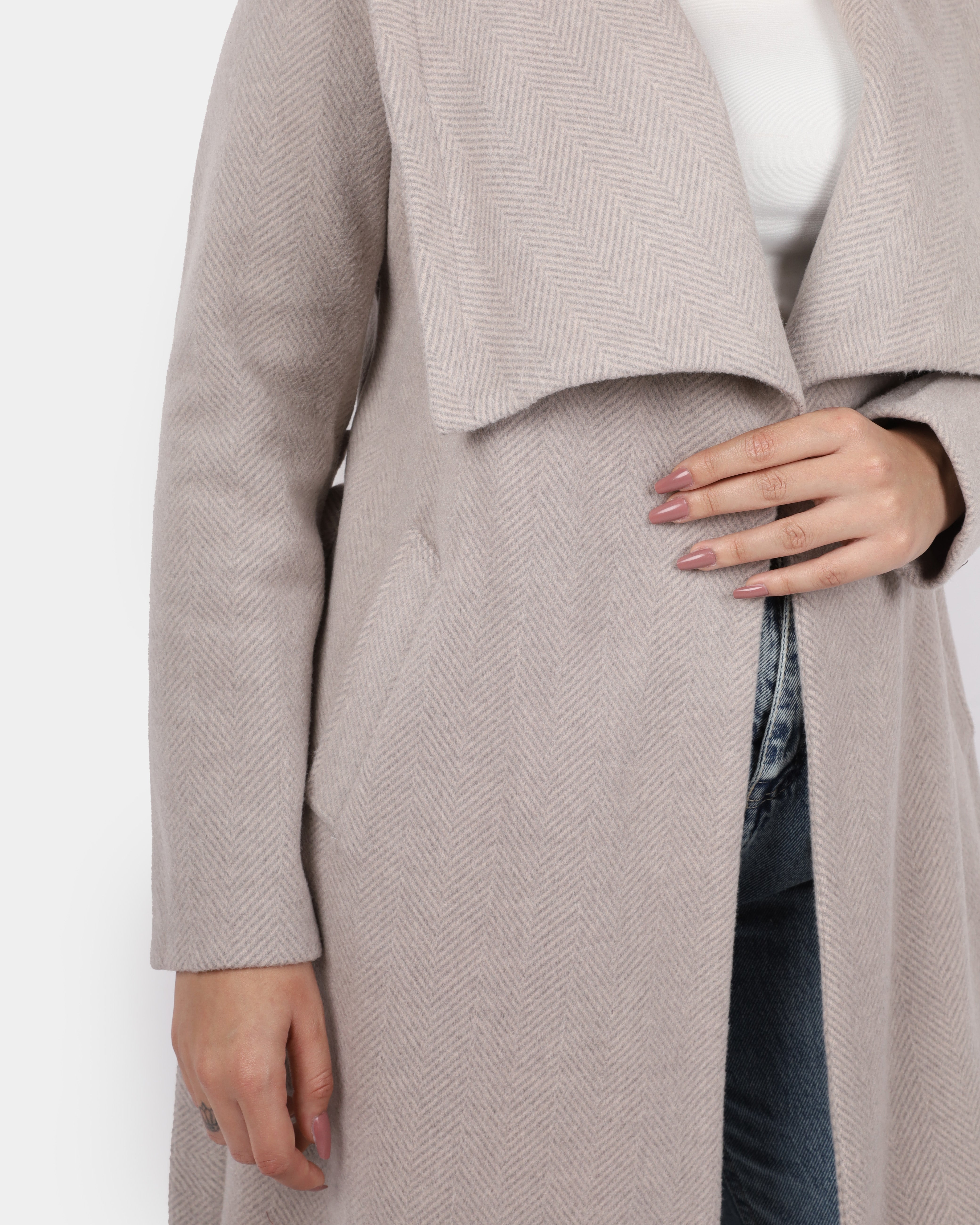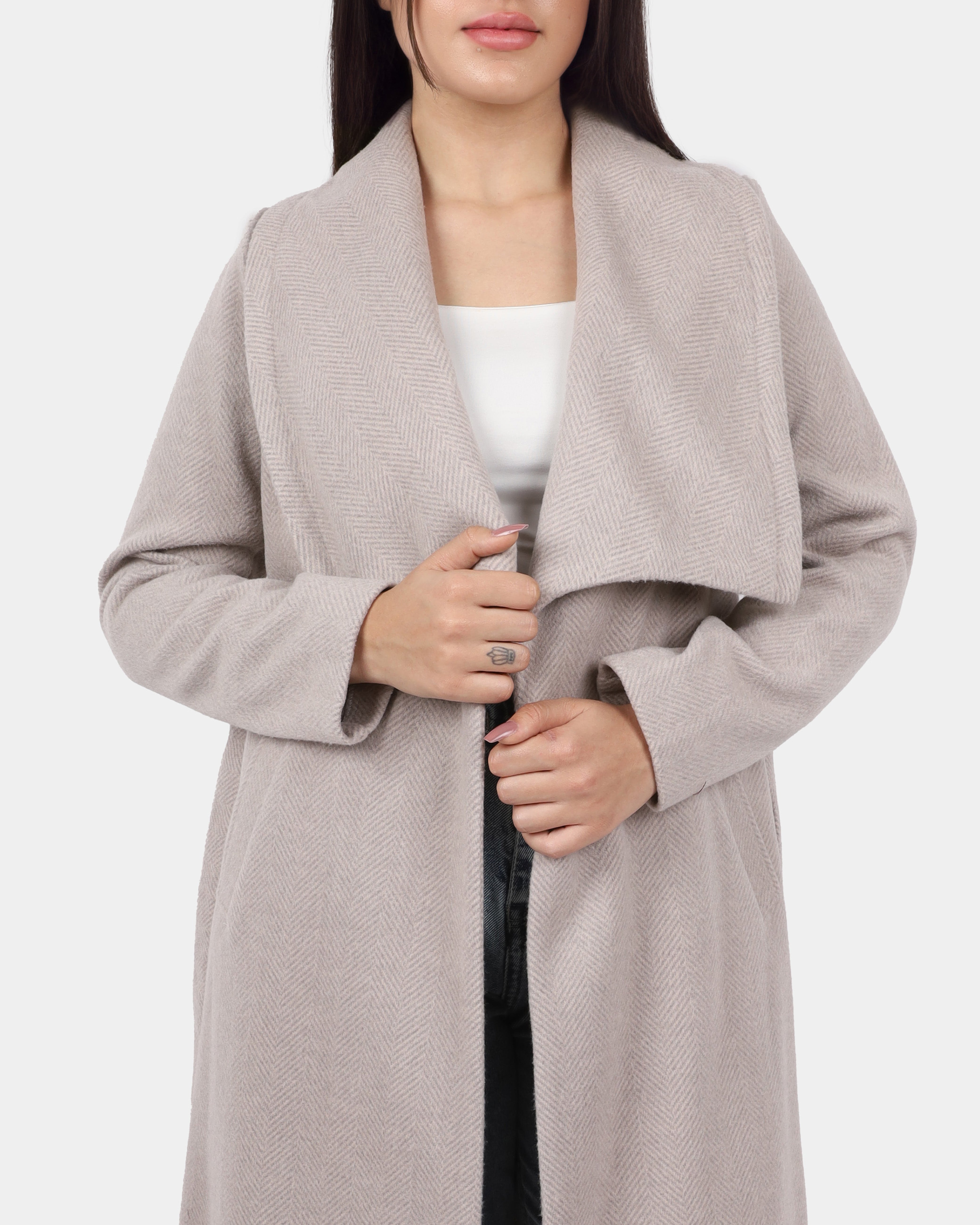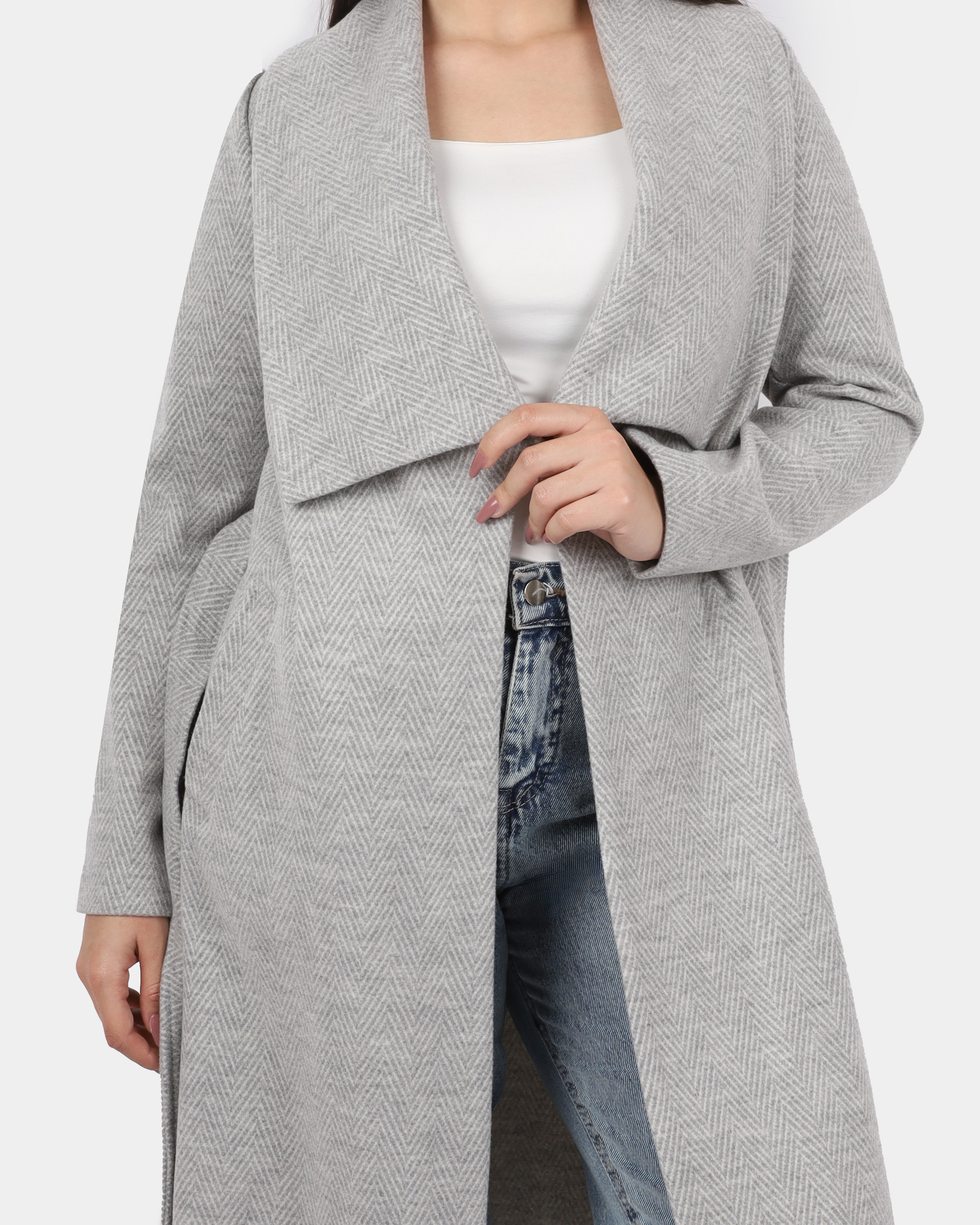 A long coat with a wide shawl collar and a belted waist, offering a cozy, elegant look perfect for layering.