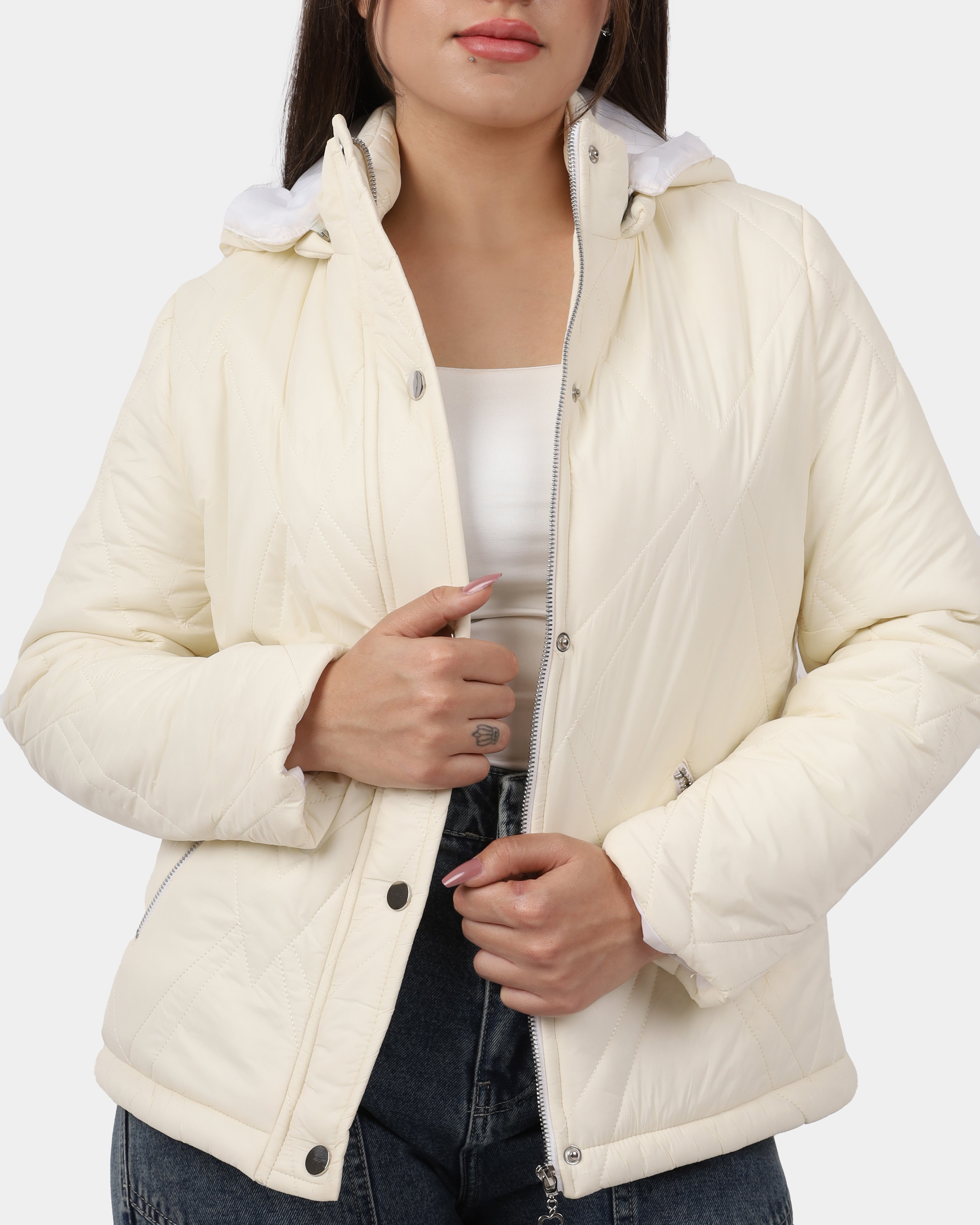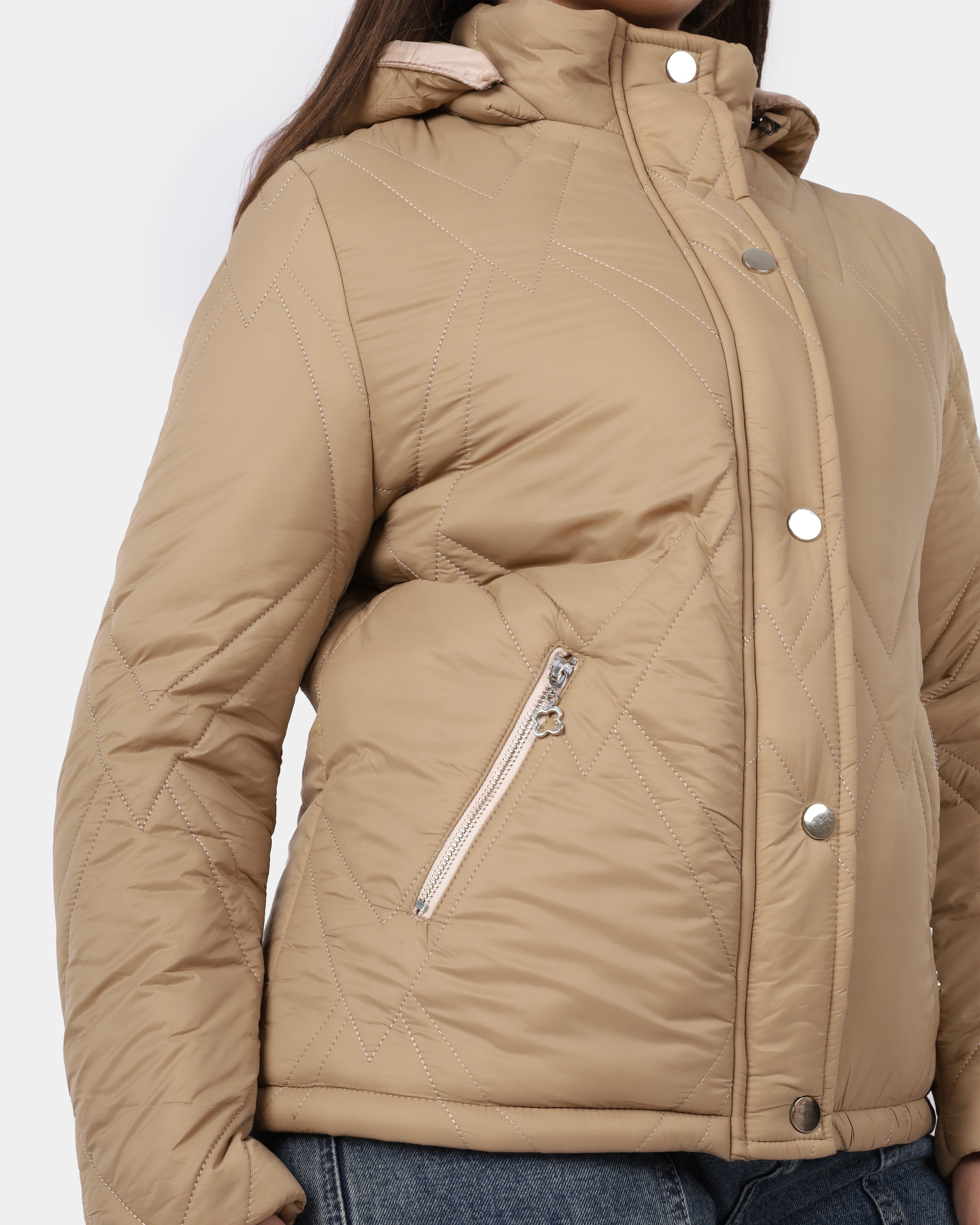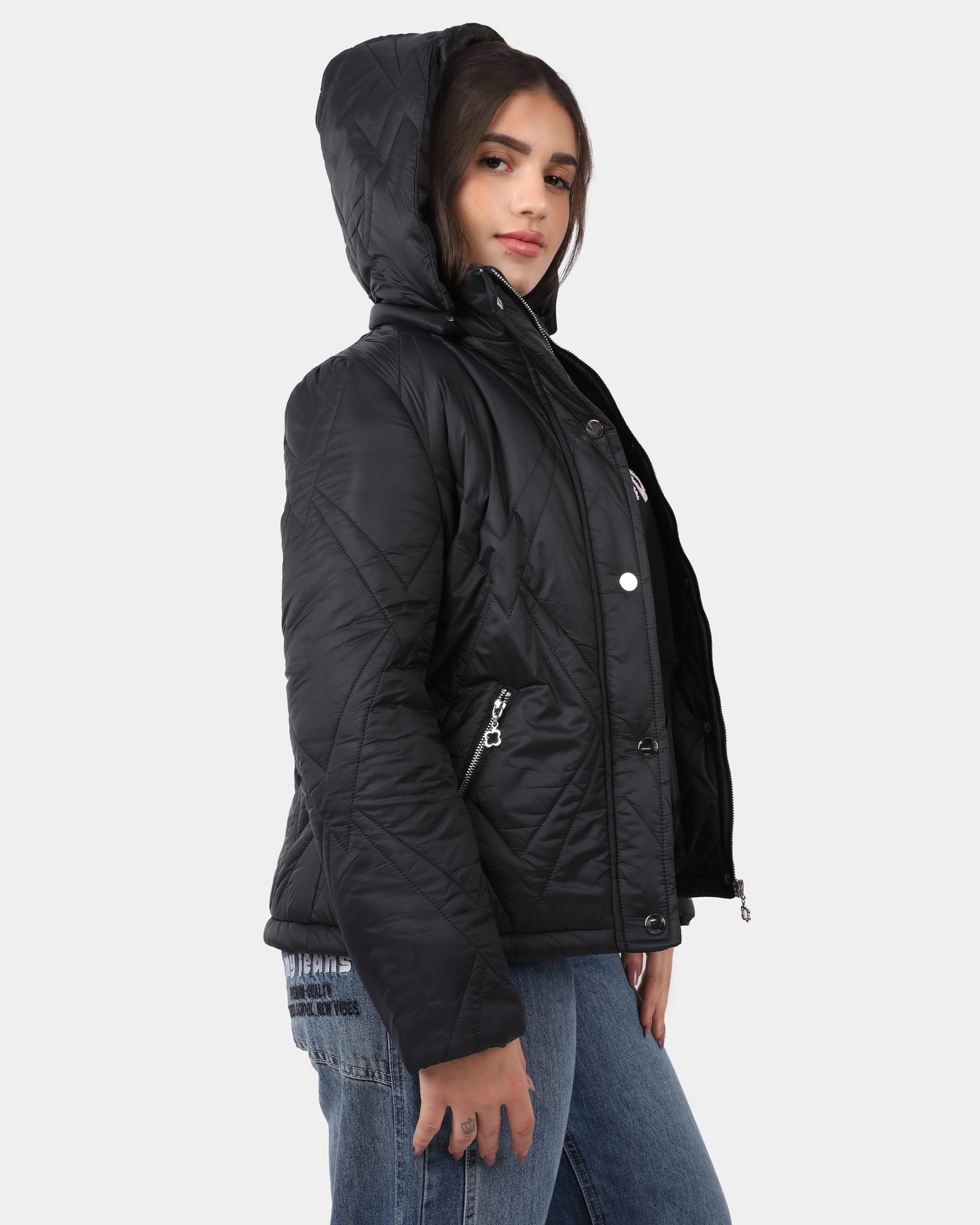 Stay cozy and stylish with this puffer jacket featuring a front zipper closure and convenient snap buttons for added detail.