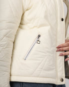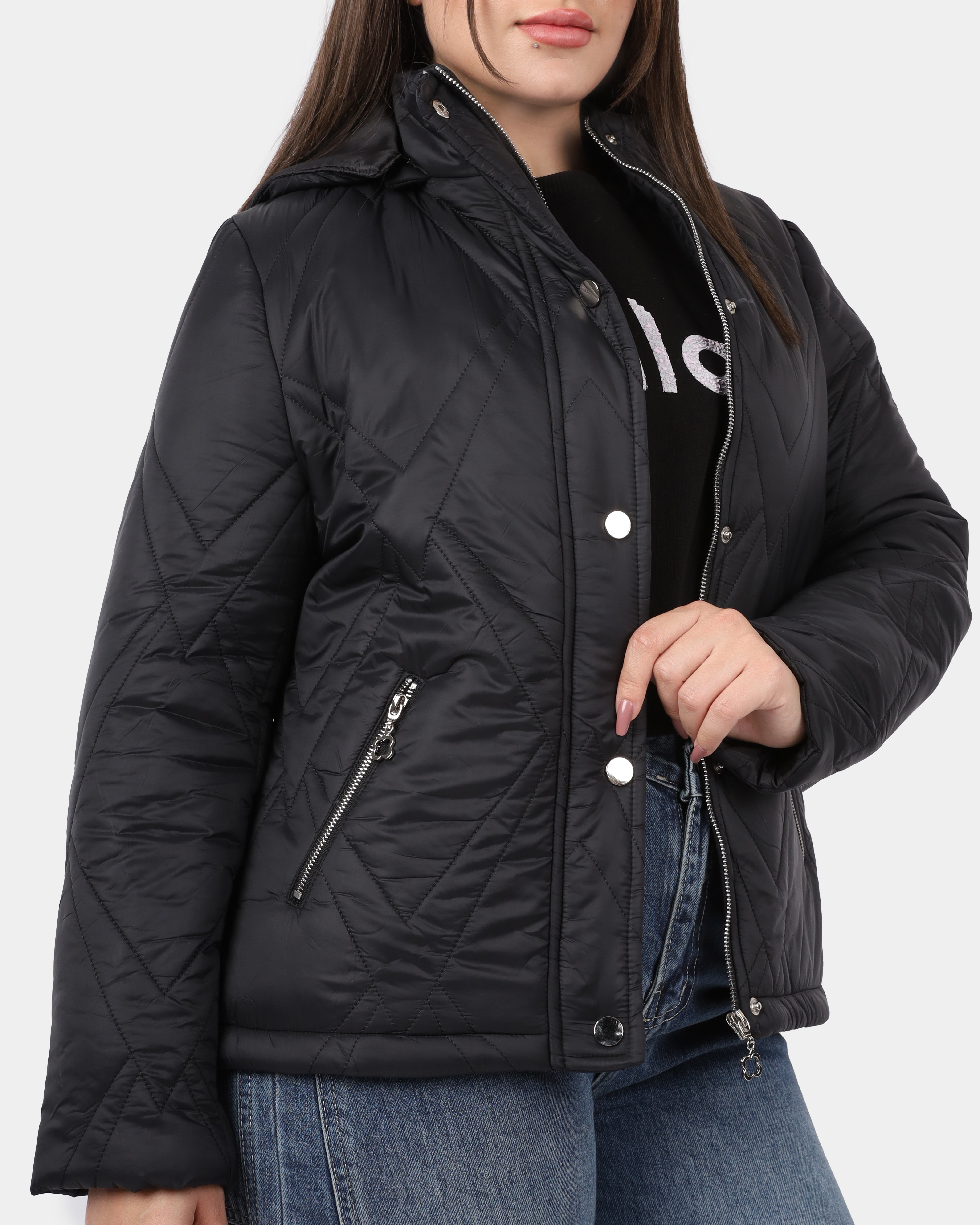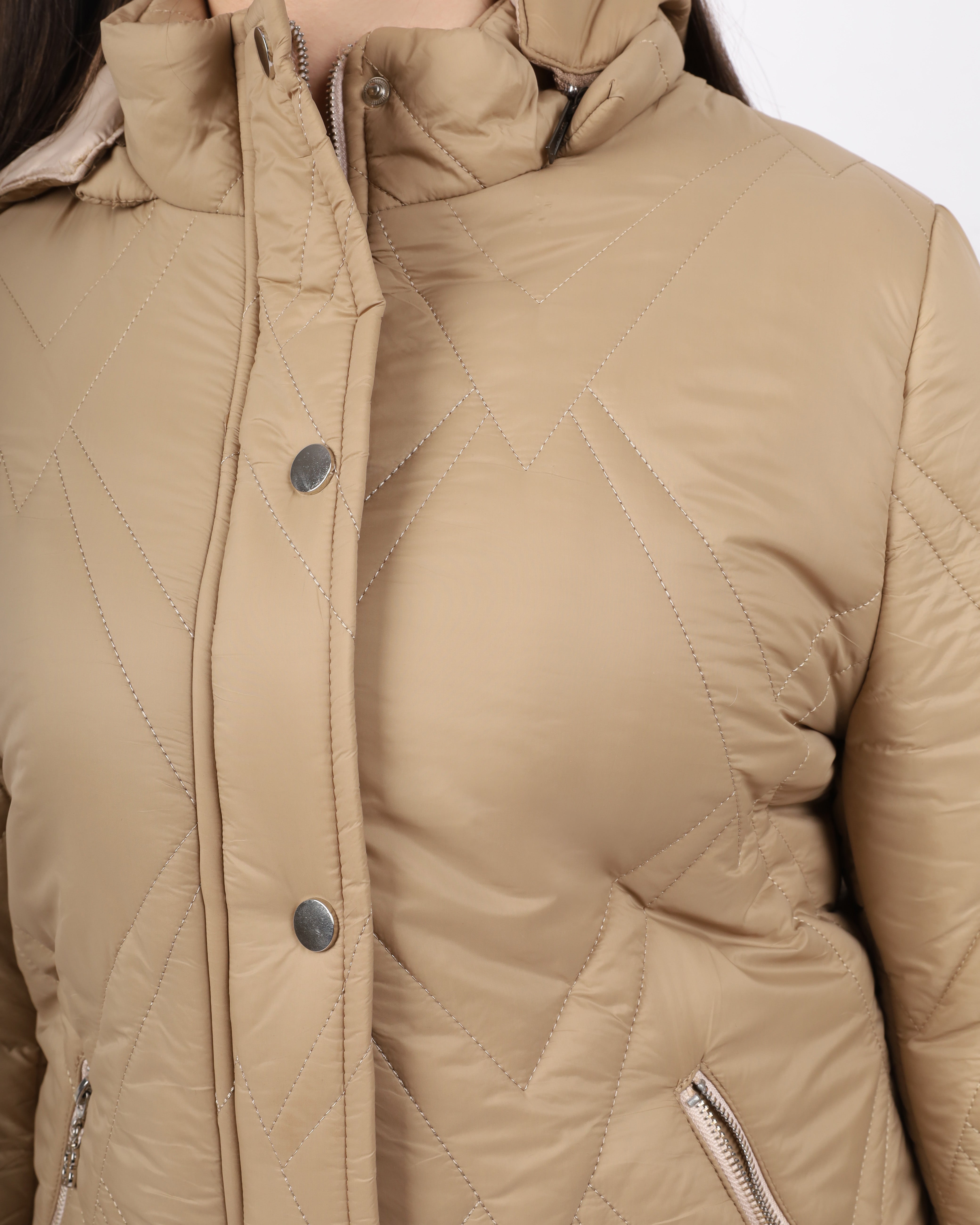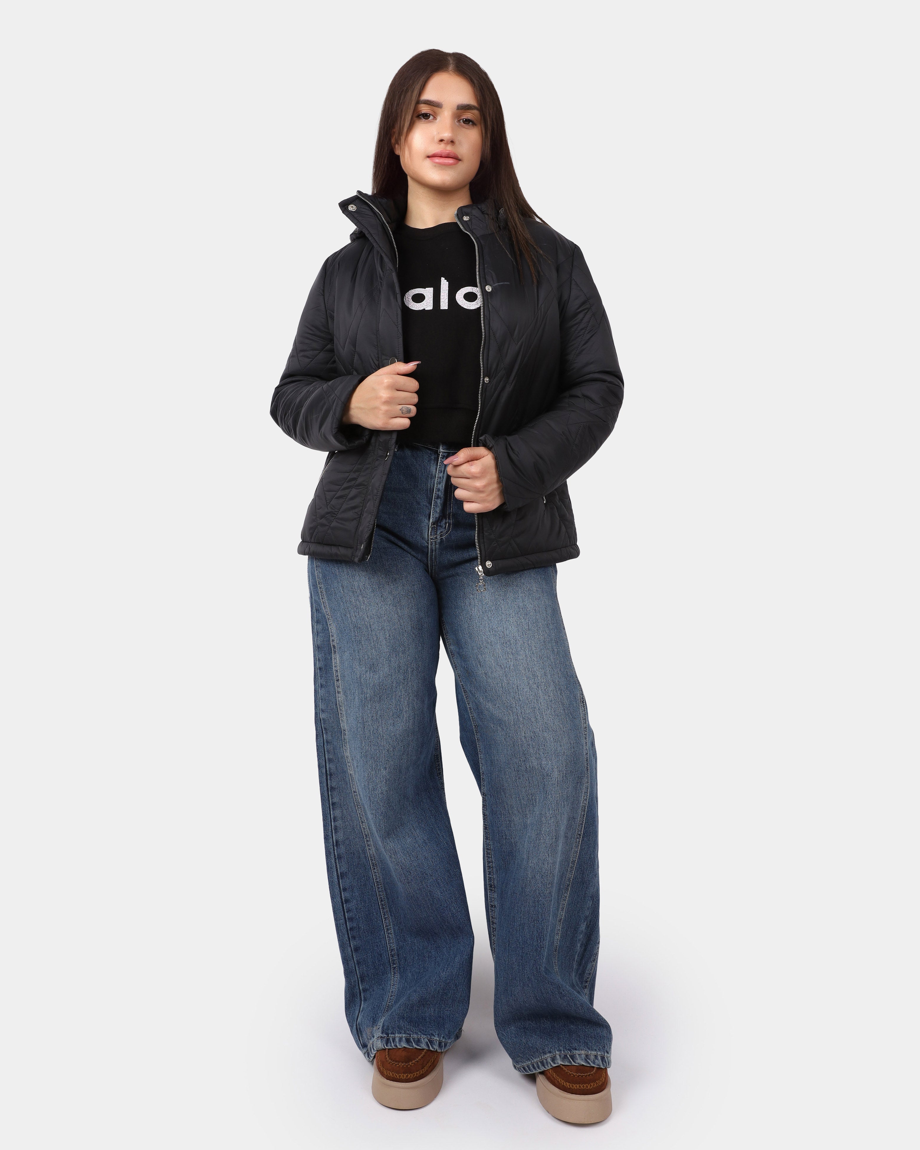 Stay cozy and stylish with this puffer jacket featuring a front zipper closure and convenient snap buttons for added detail.