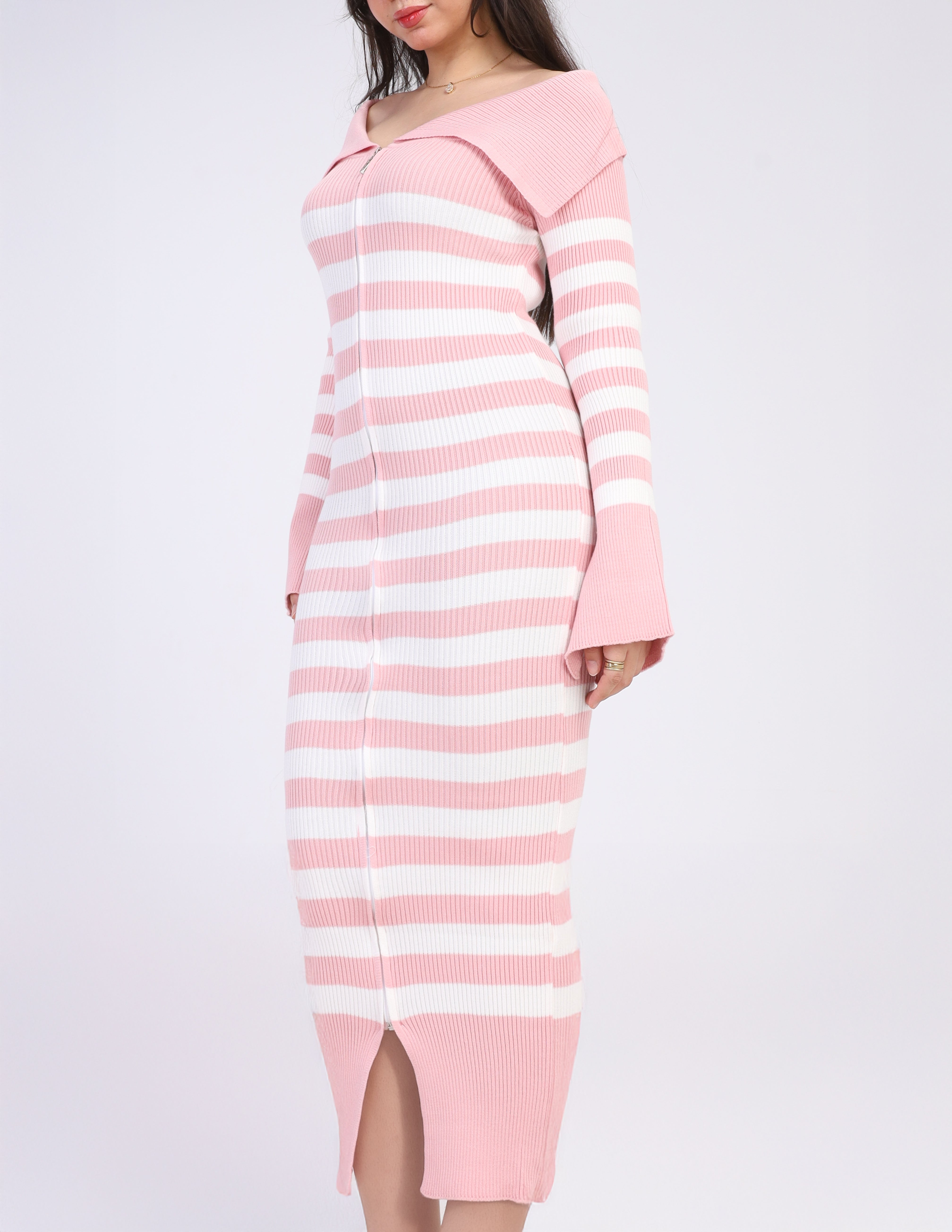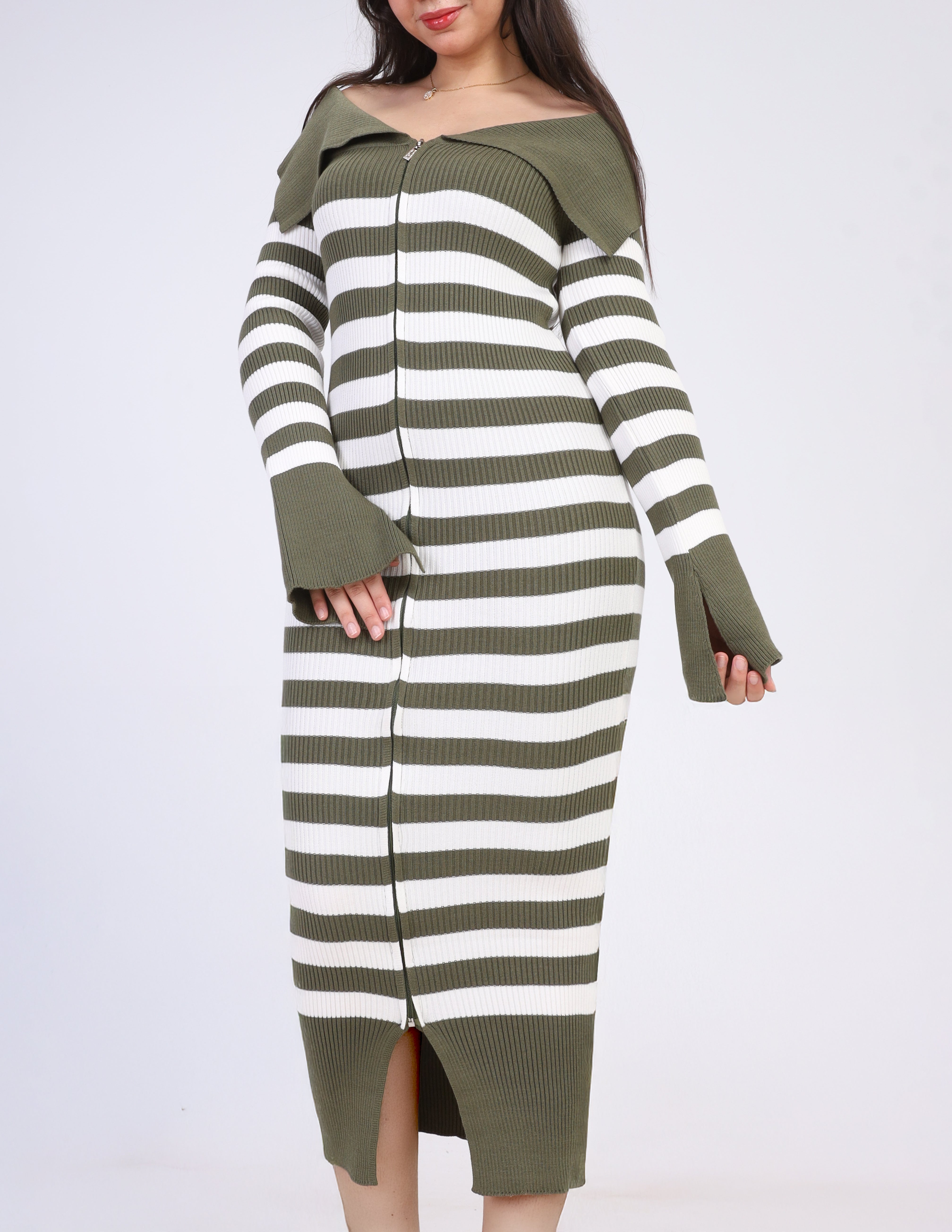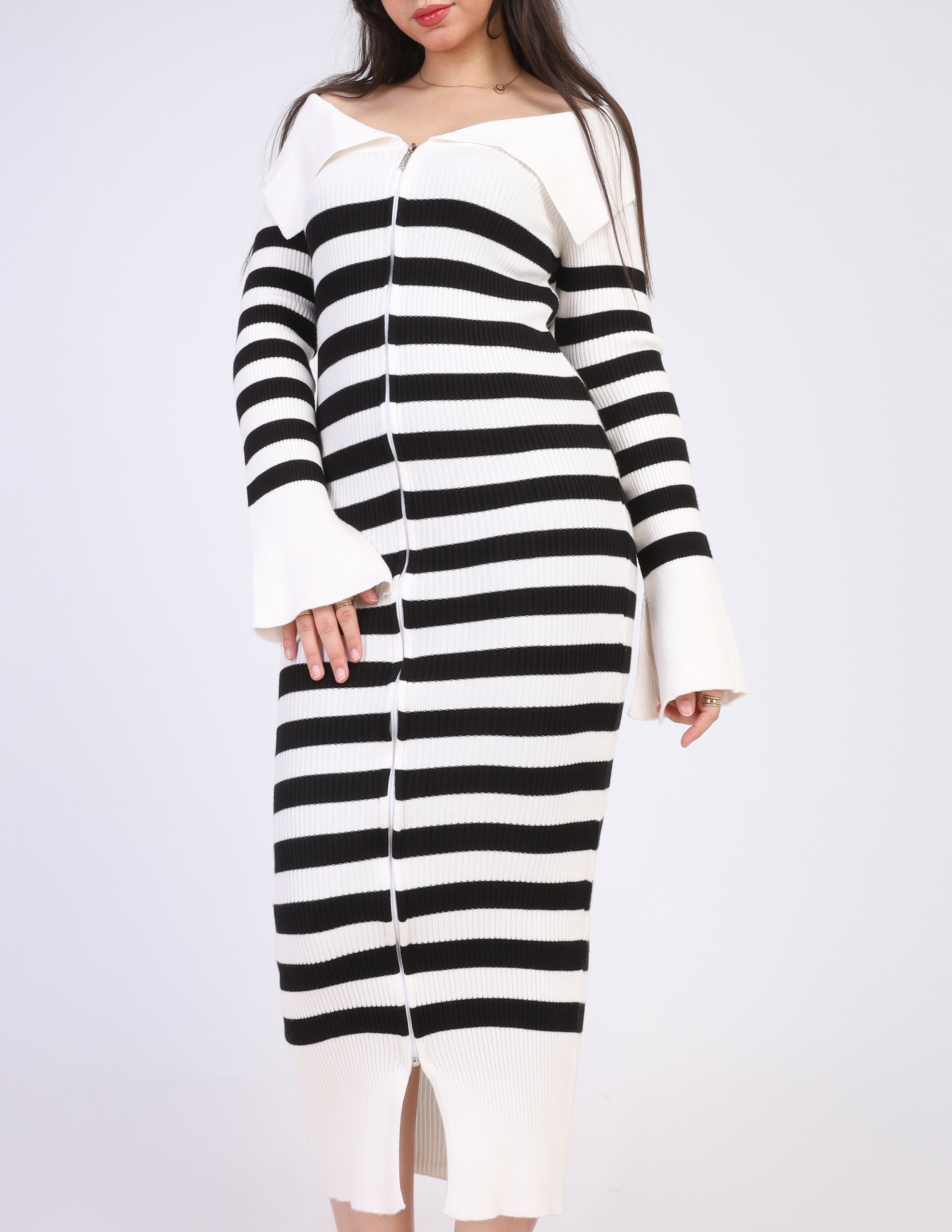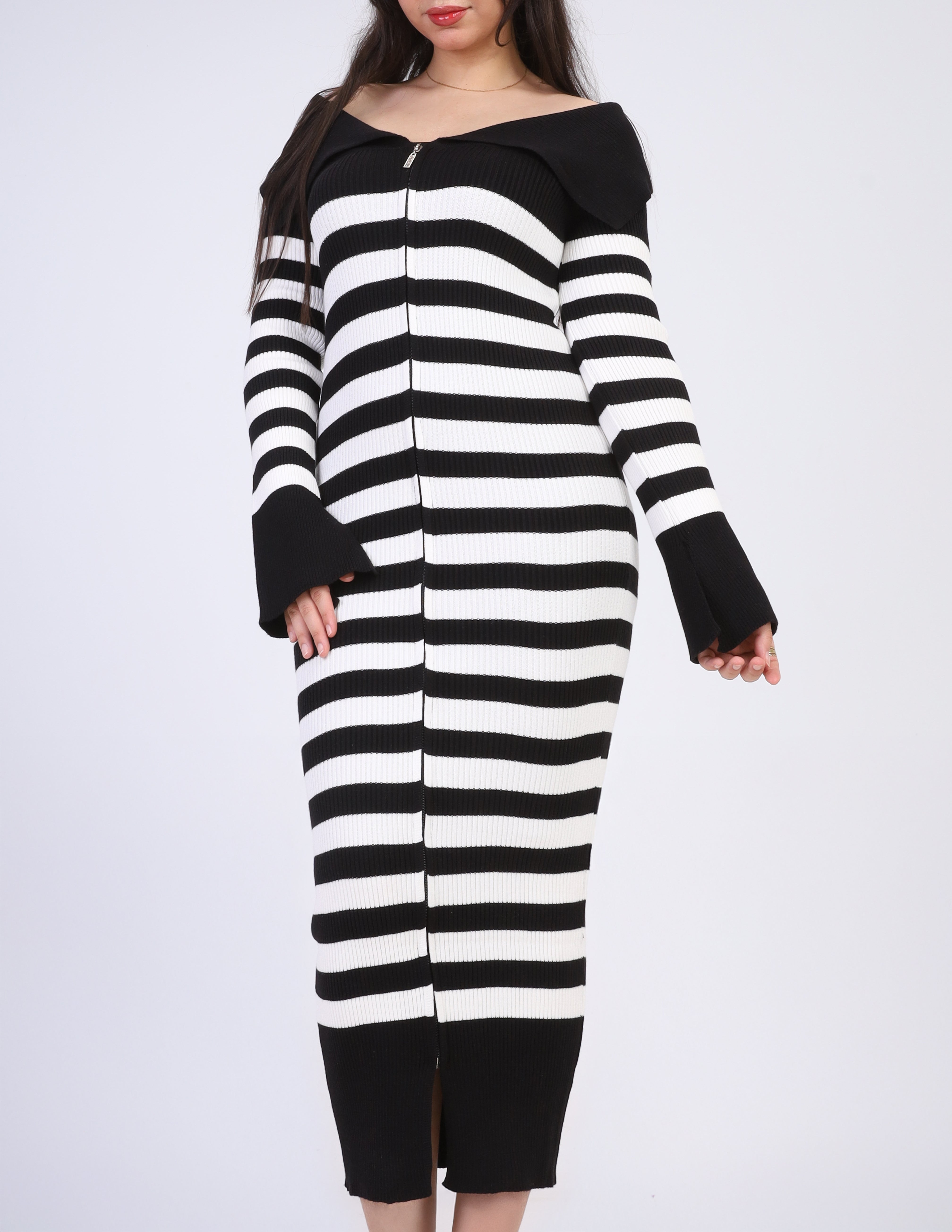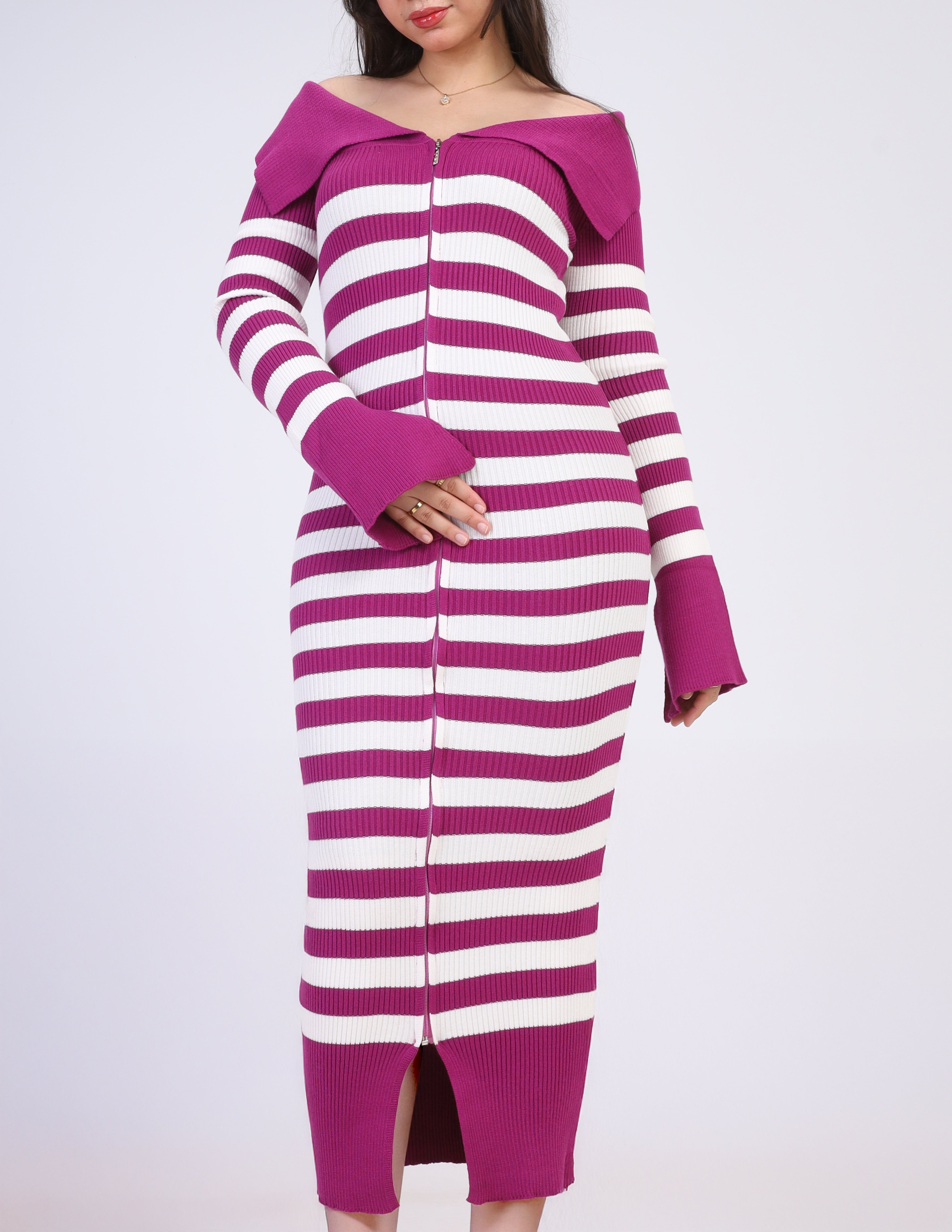 Striped Off-Shoulder Maxi Dress with Front Zipper  w16252634
