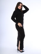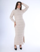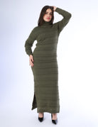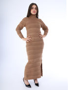 A cozy ribbed maxi dress featuring a high turtleneck, long sleeves, and a flattering straight silhouette.