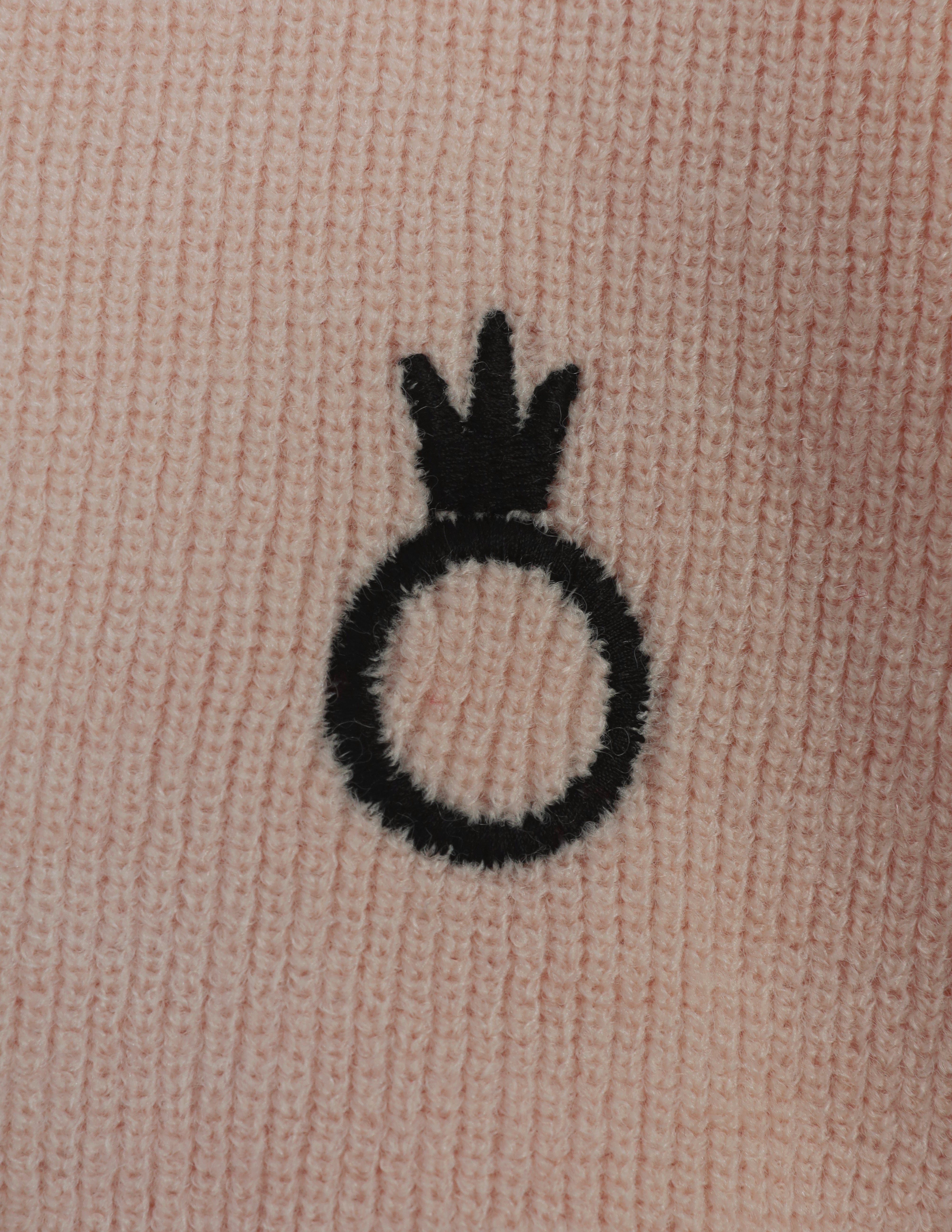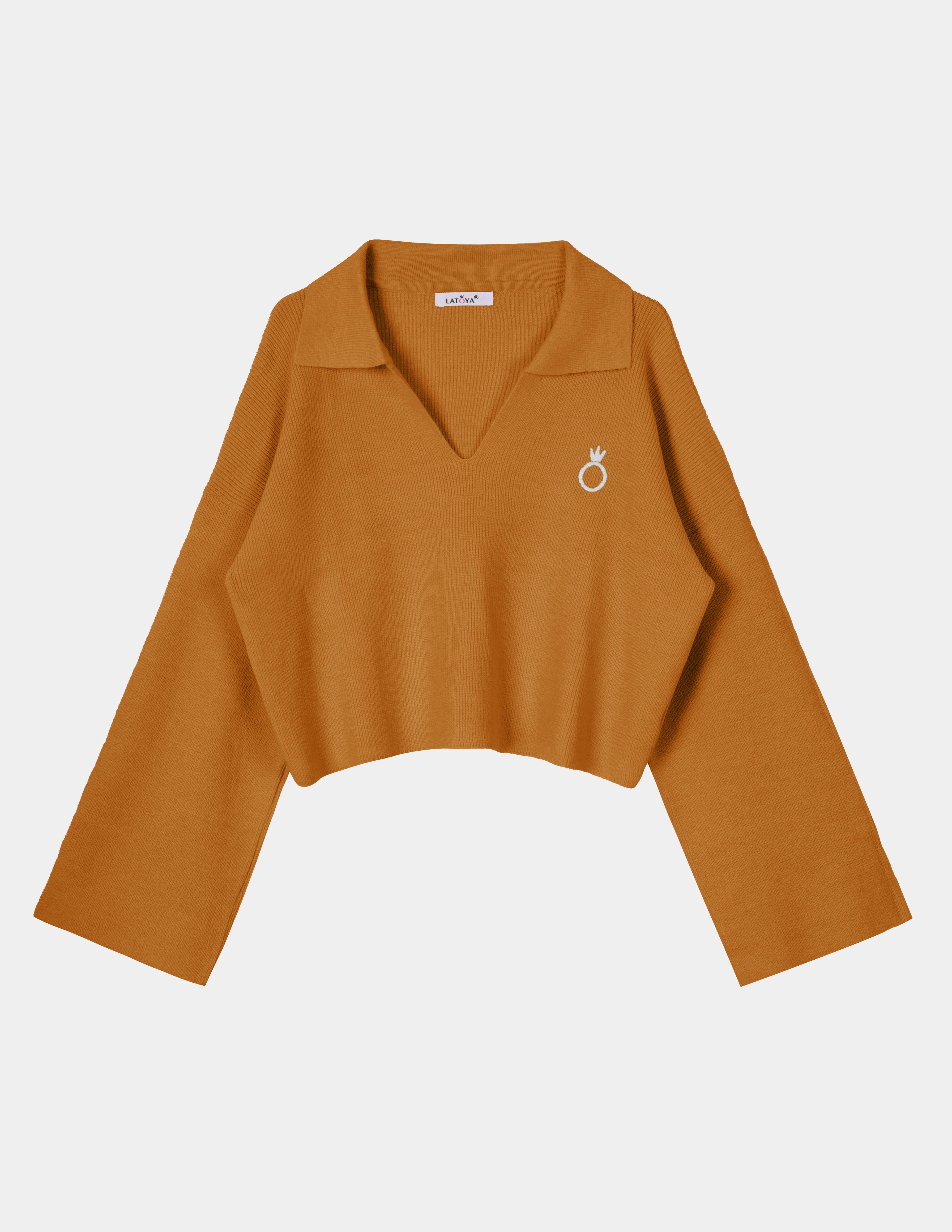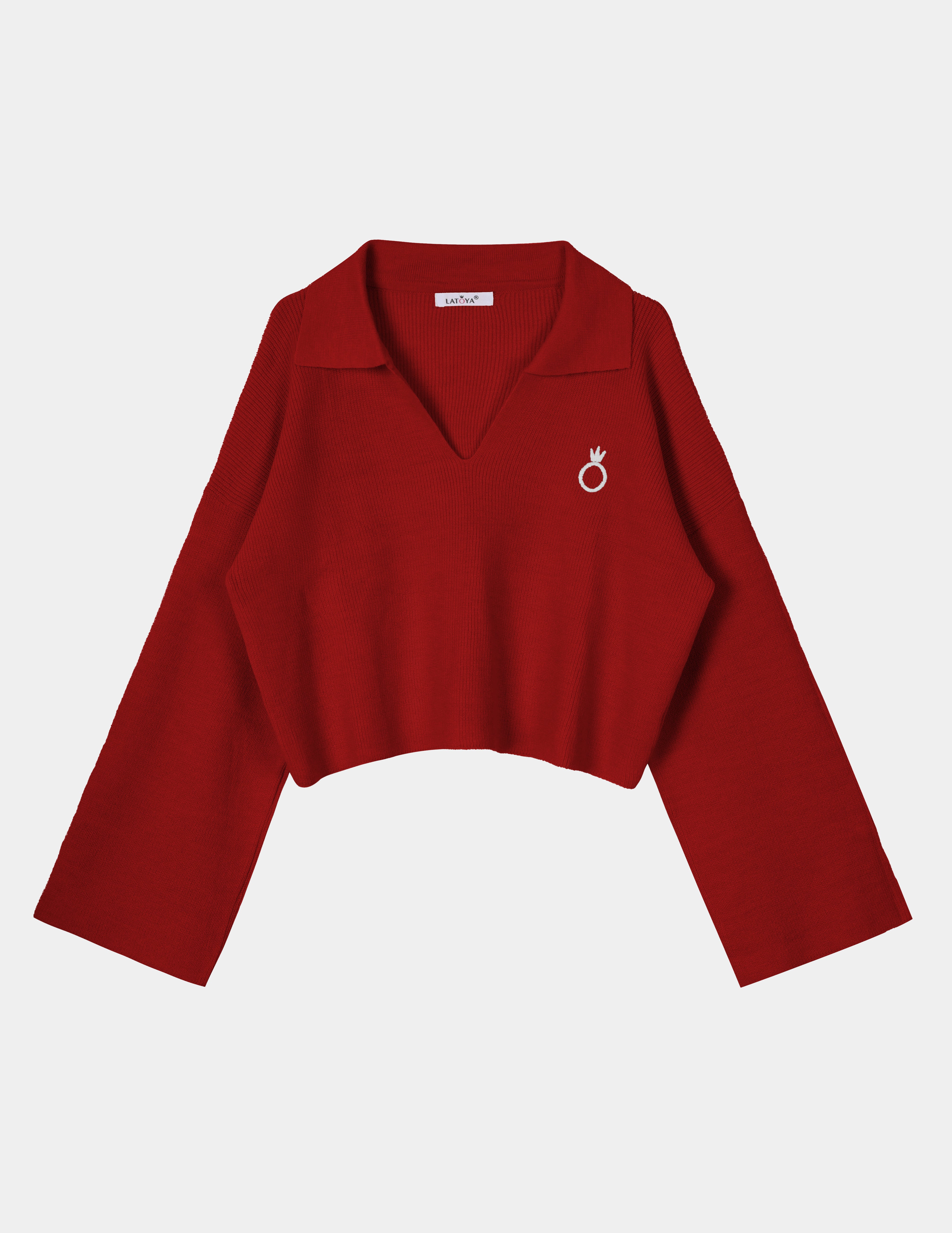 A stylish cropped knit sweater featuring a sharp V-neckline with a flat collar for a modern, preppy look. Designed in a relaxed fit with long sleeves for everyday comfort.