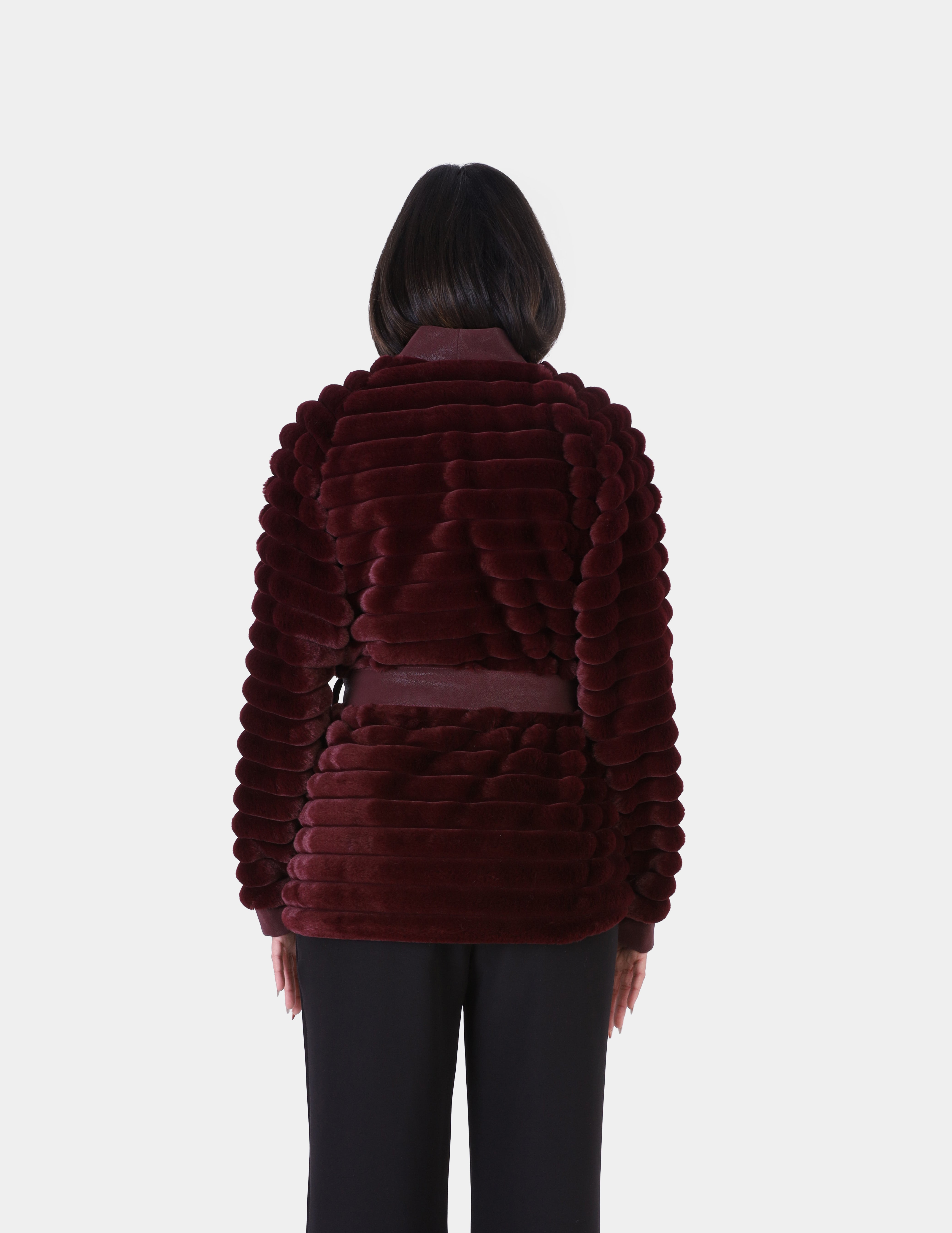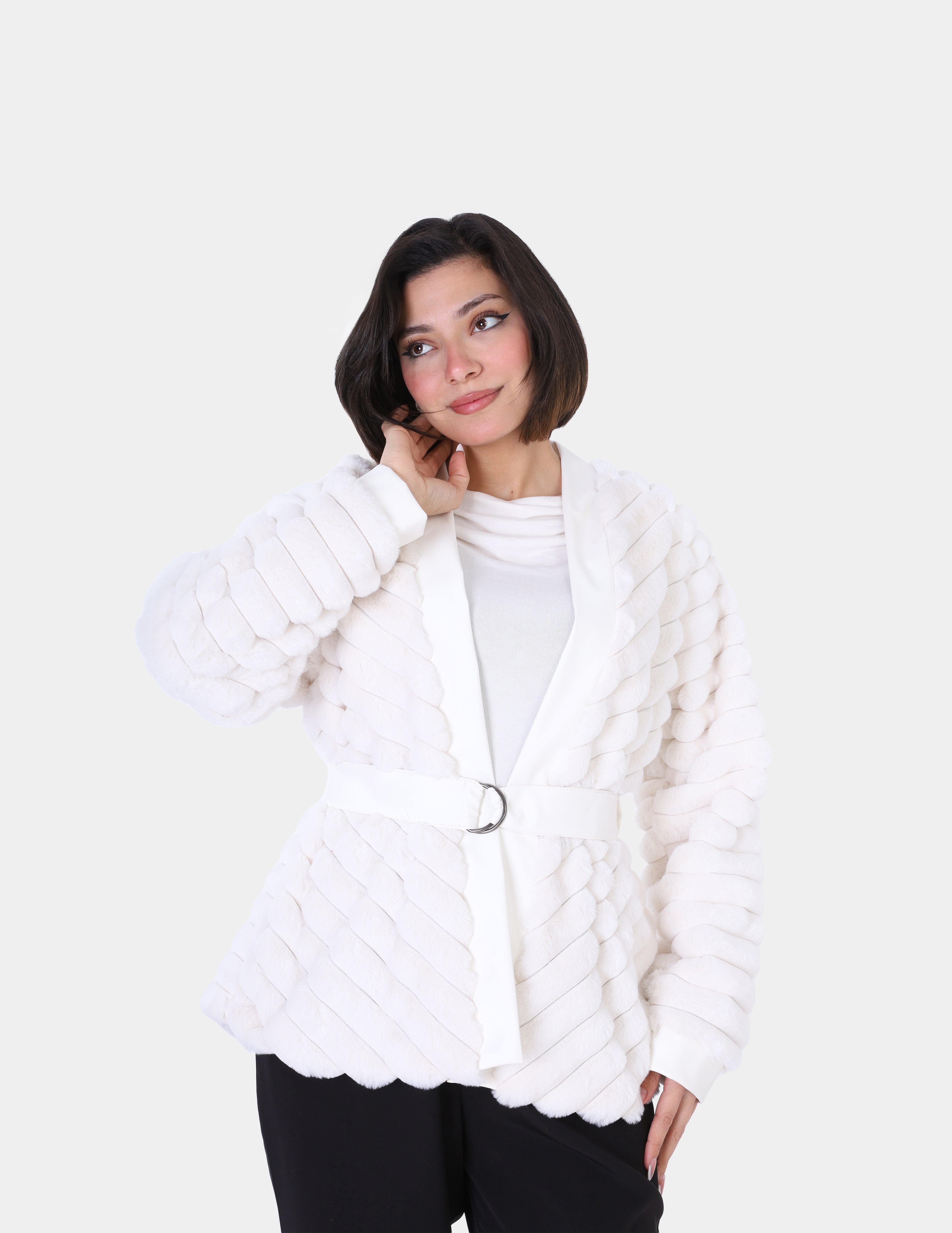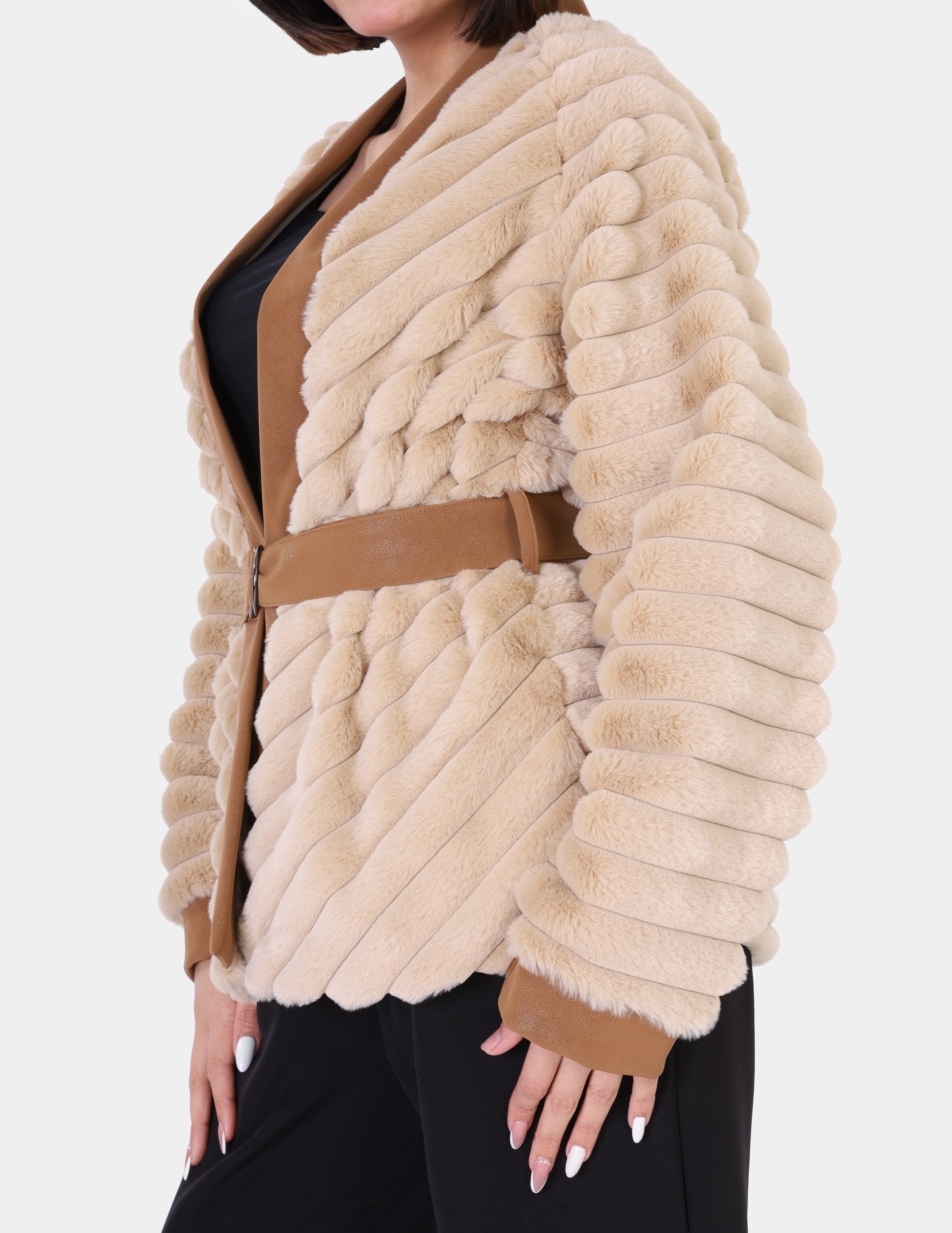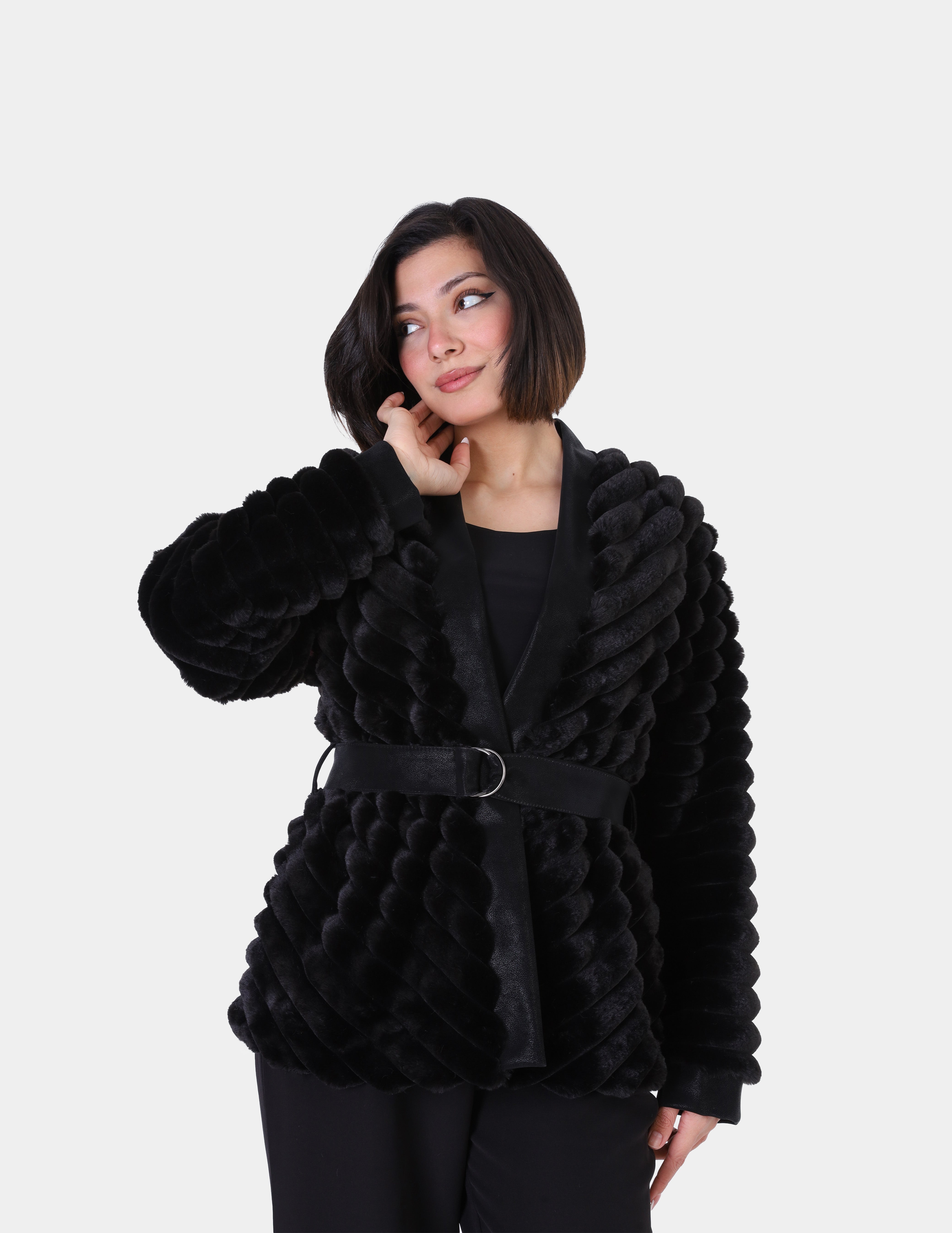 Soft textured faux fur jacket with a waist belt and cozy fit for a stylish winter look