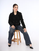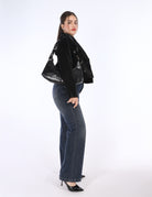 Cropped faux leather jacket with a front belt that defines the waist, offering a chic and modern look