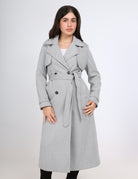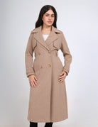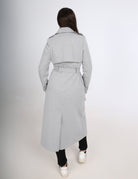 A long herringbone trench coat with a double-breasted front and a tie belt for a classic, polished look.