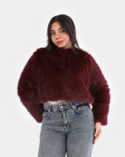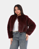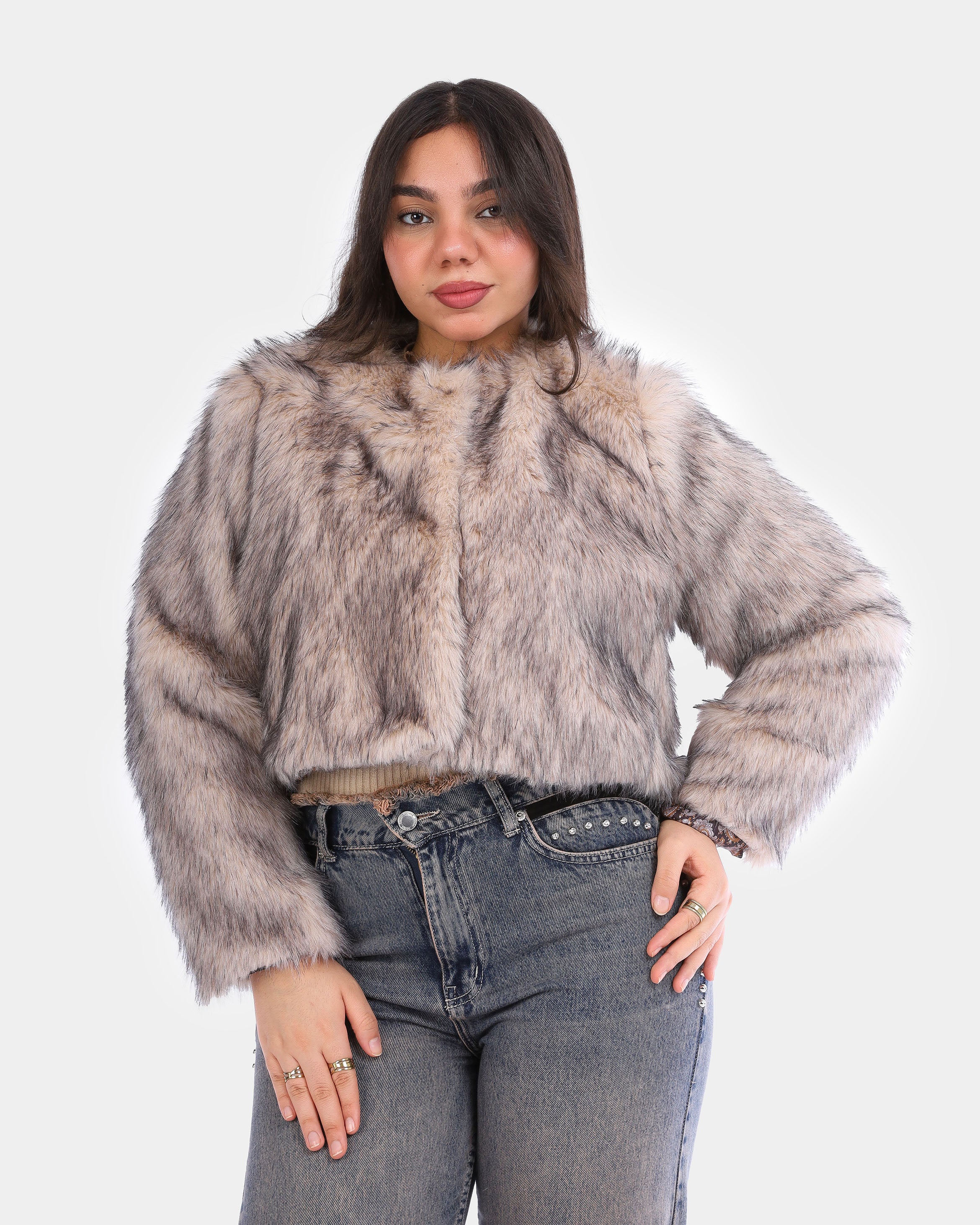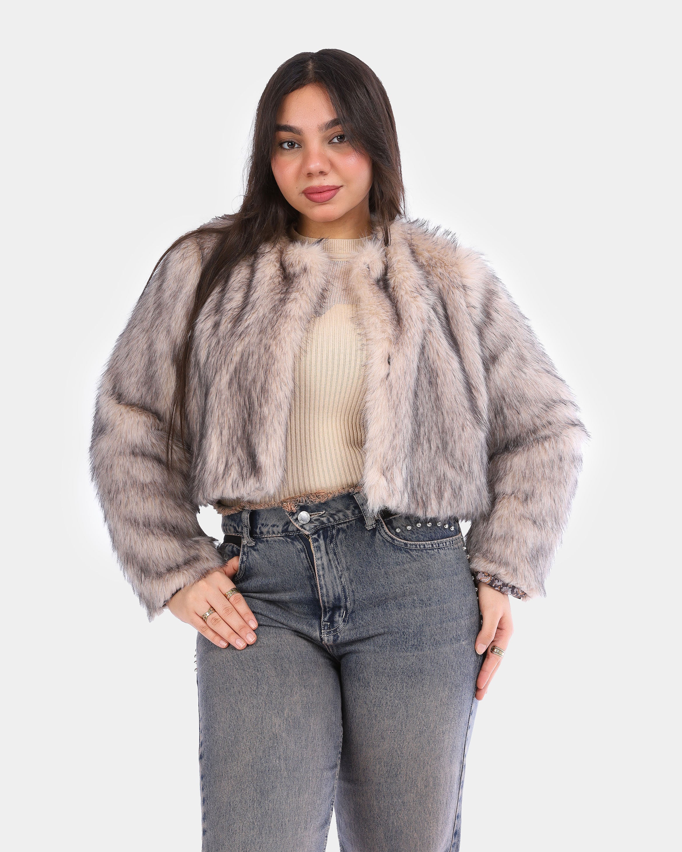 Warm and stylish luxurious cropped faux fur jacket, textured multi-tone fur design in soft hues.