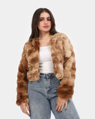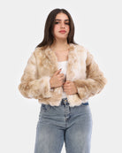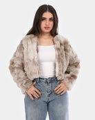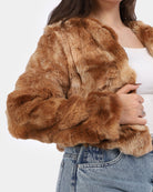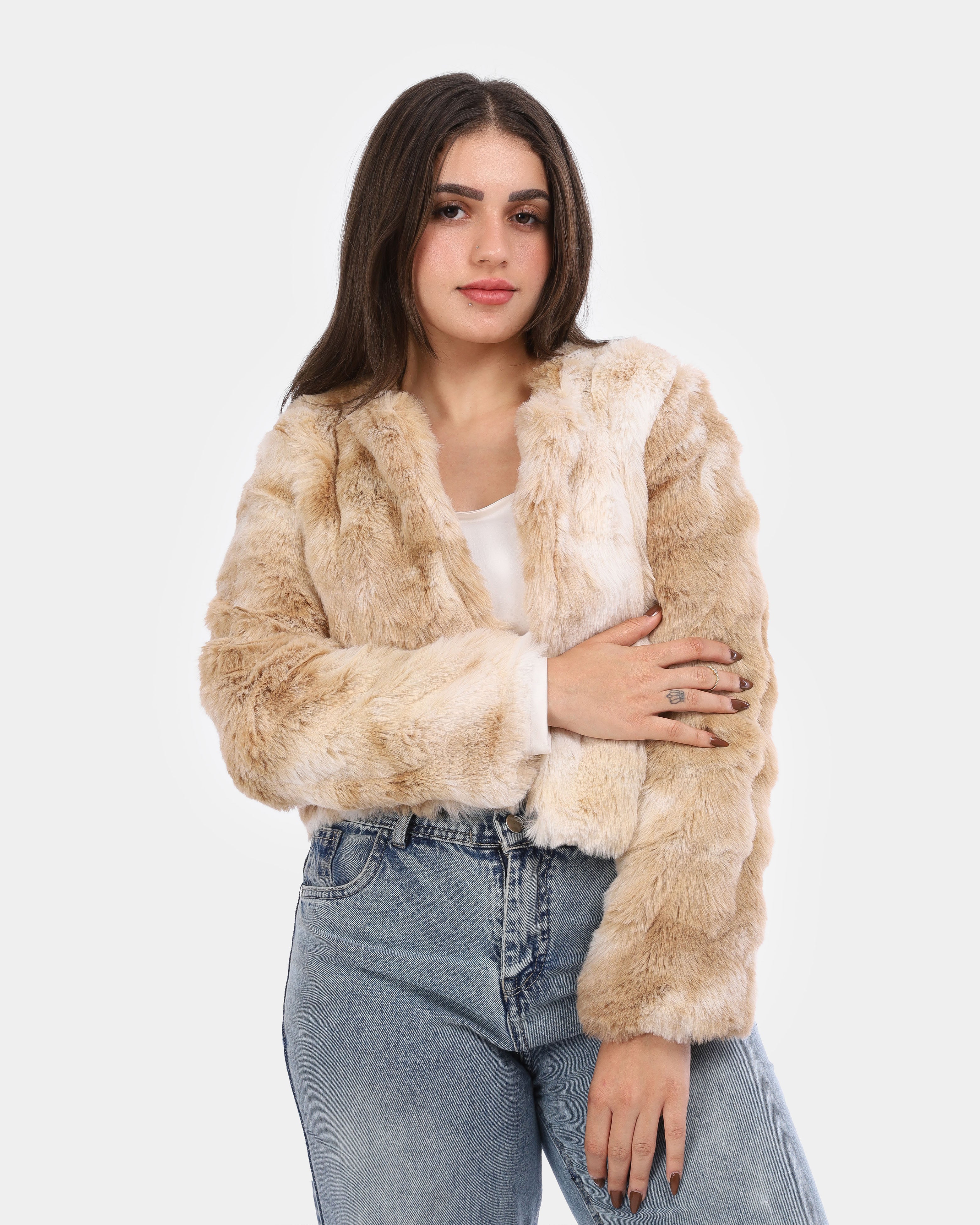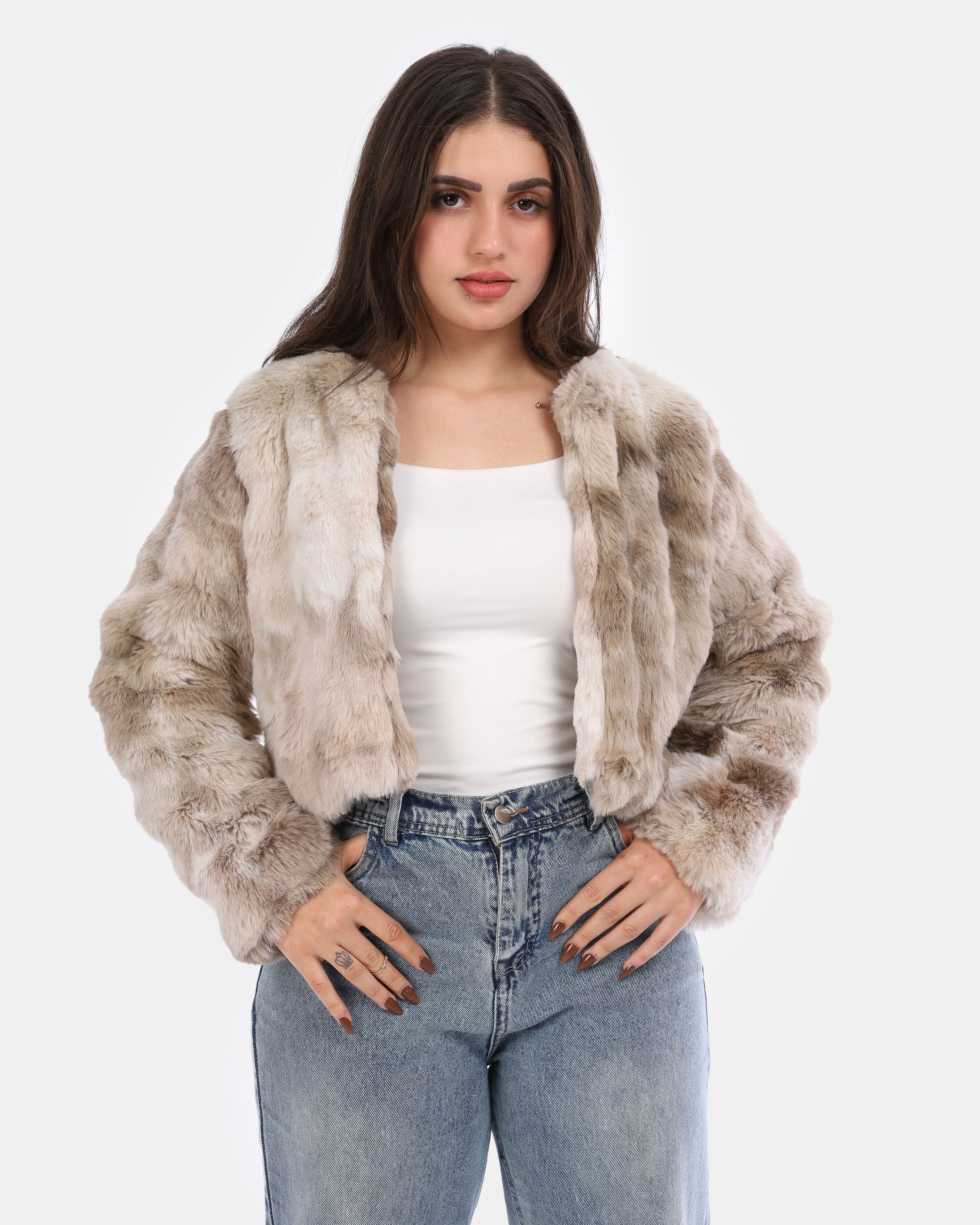 A chic cropped faux fur jacket with long sleeves and a comfortable open front style, adds instant elegance and warmth.