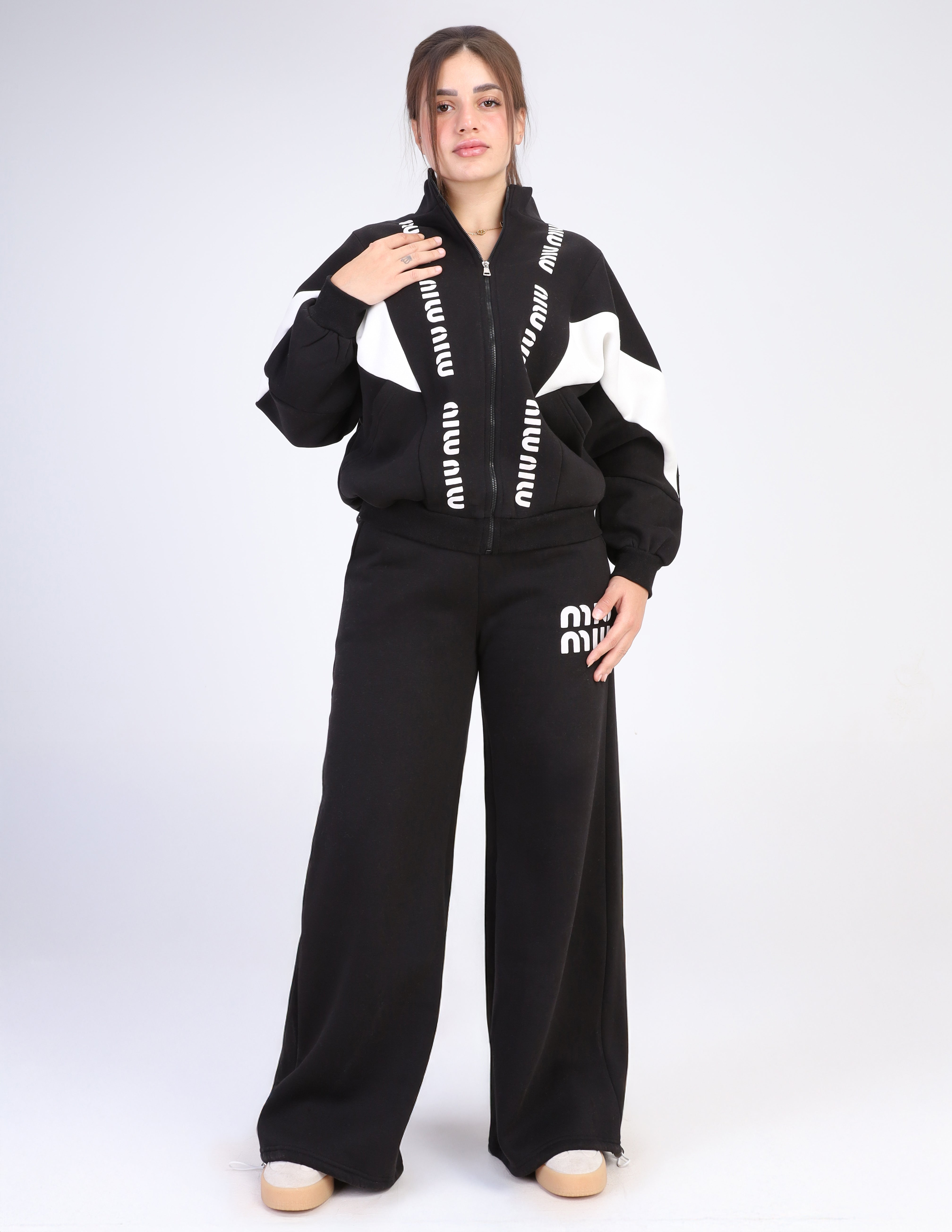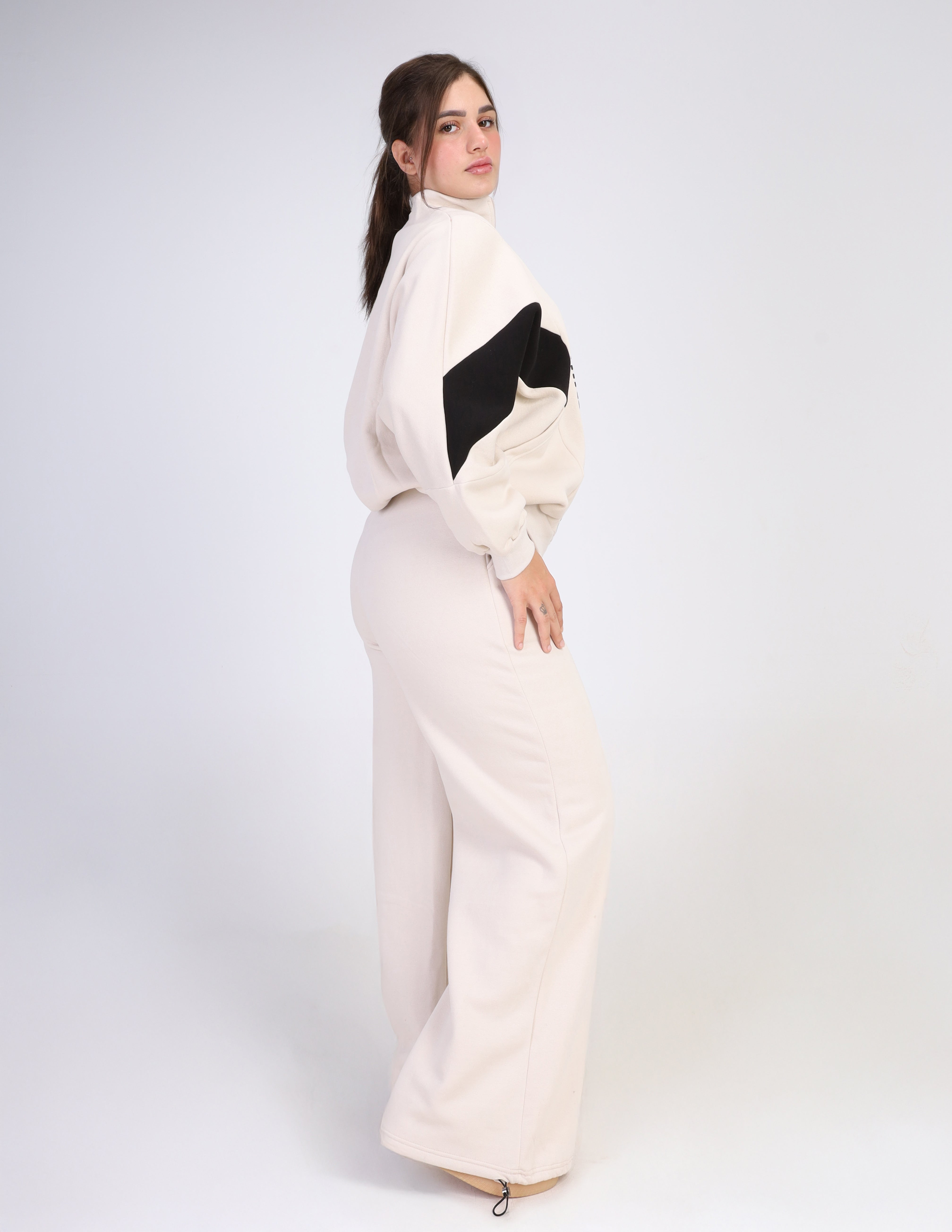 Trendy two-piece jogger set featuring a zip-up sweatshirt with bold color block panels and matching wide-leg pants.