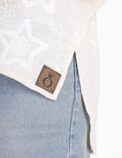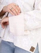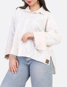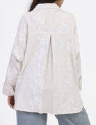 Oversized shirt featuring delicate embroidery and contrasting striped cuffs for a stylish, modern touch