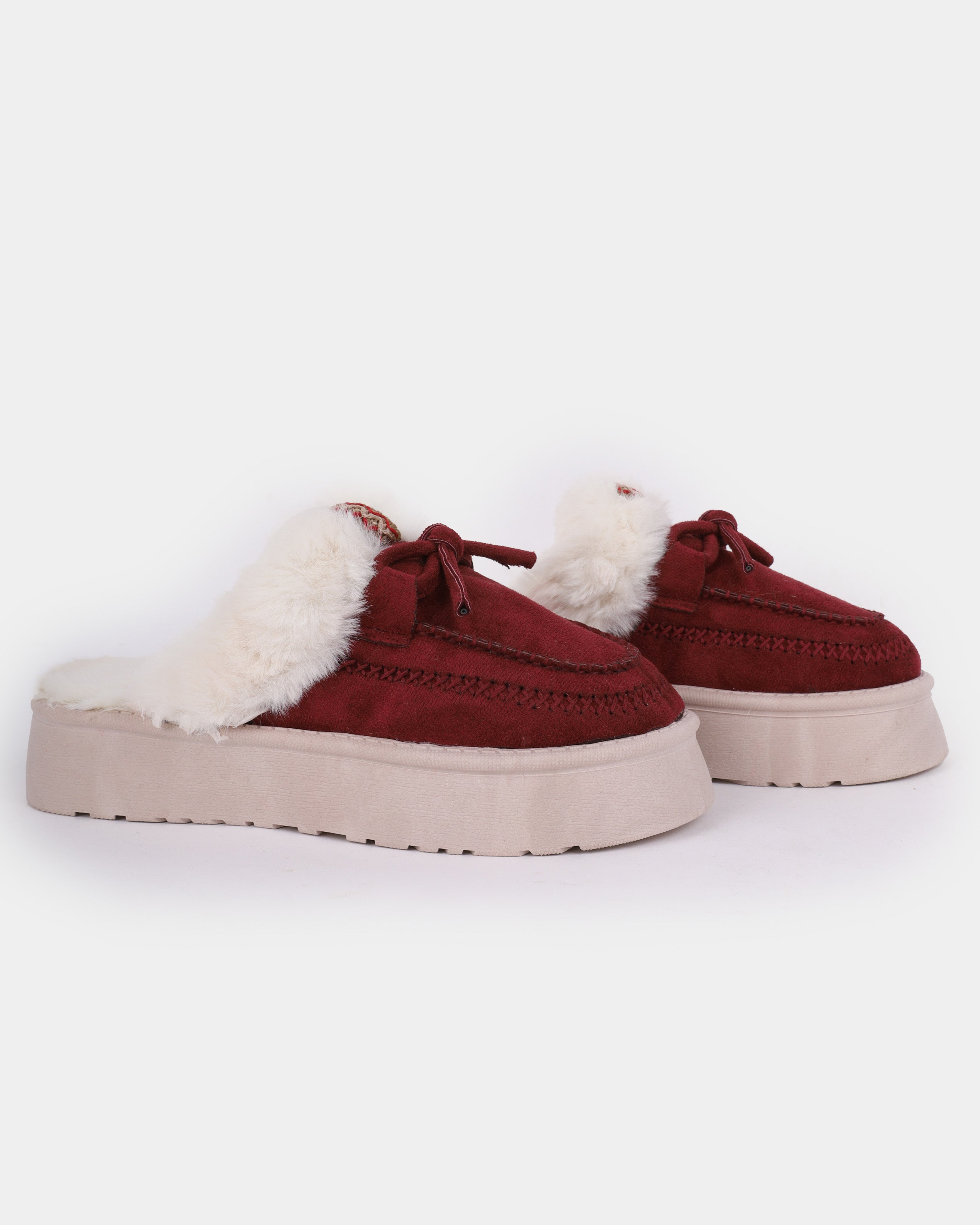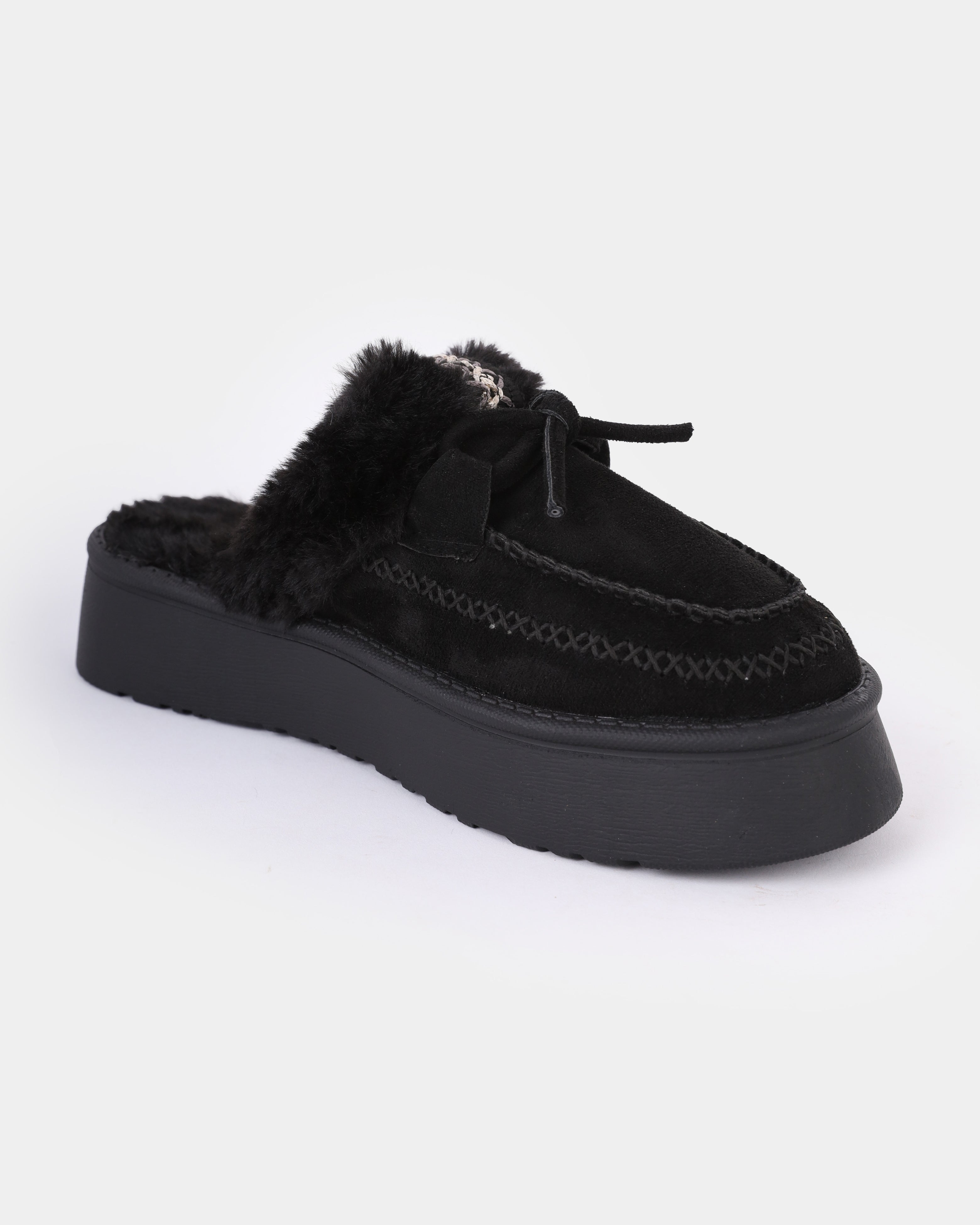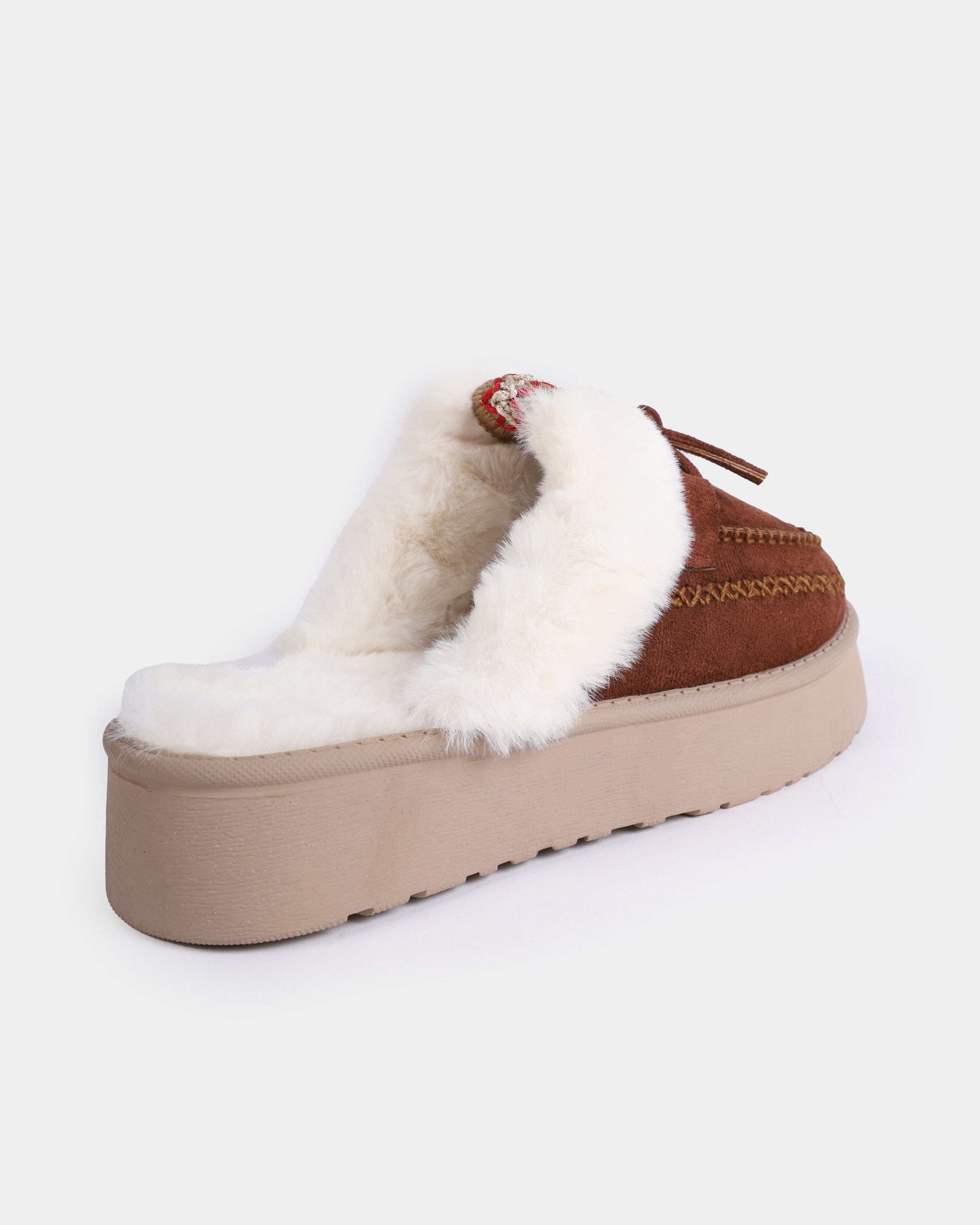 Stylish suede slippers featuring a chunky platform sole and soft faux fur lining for extra warmth and comfort.