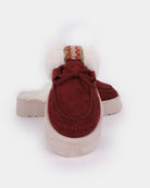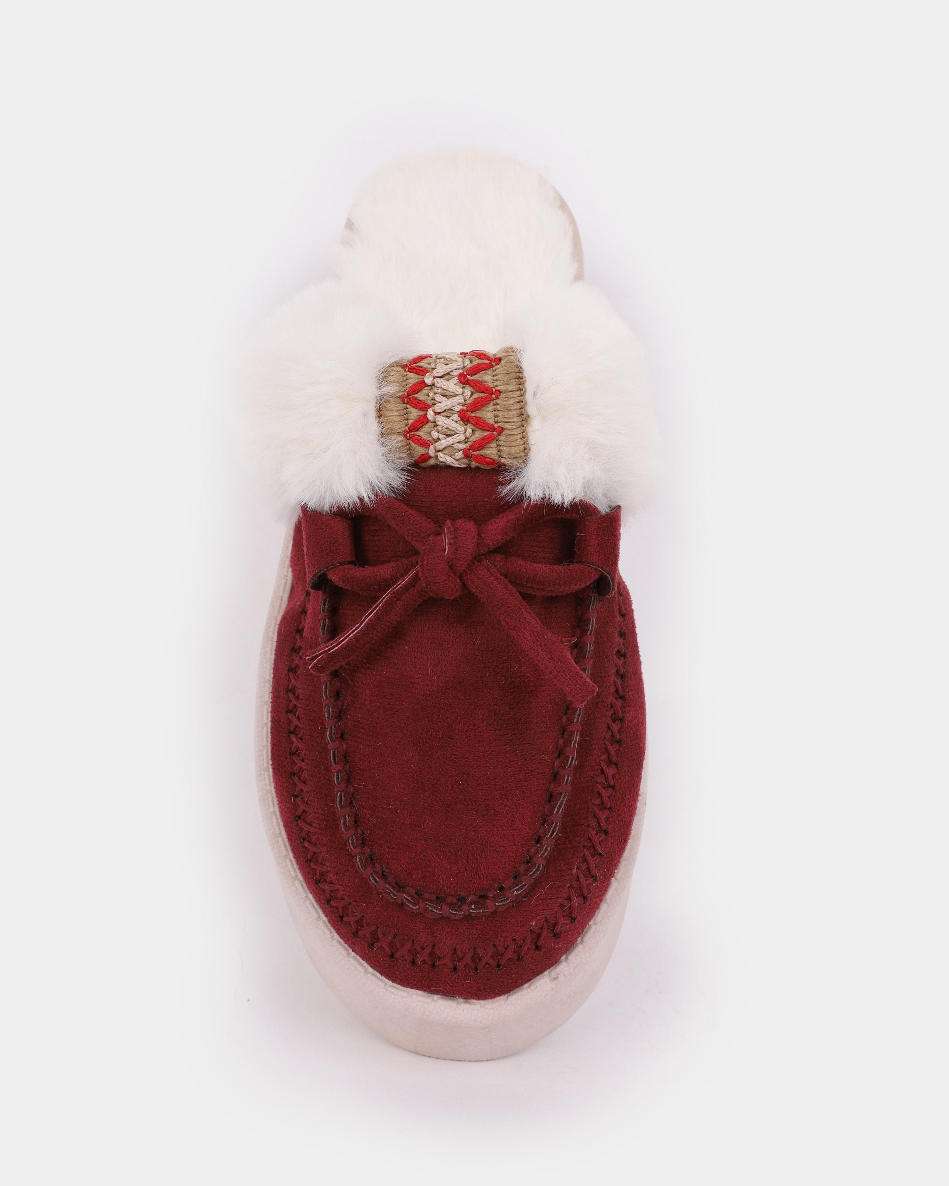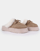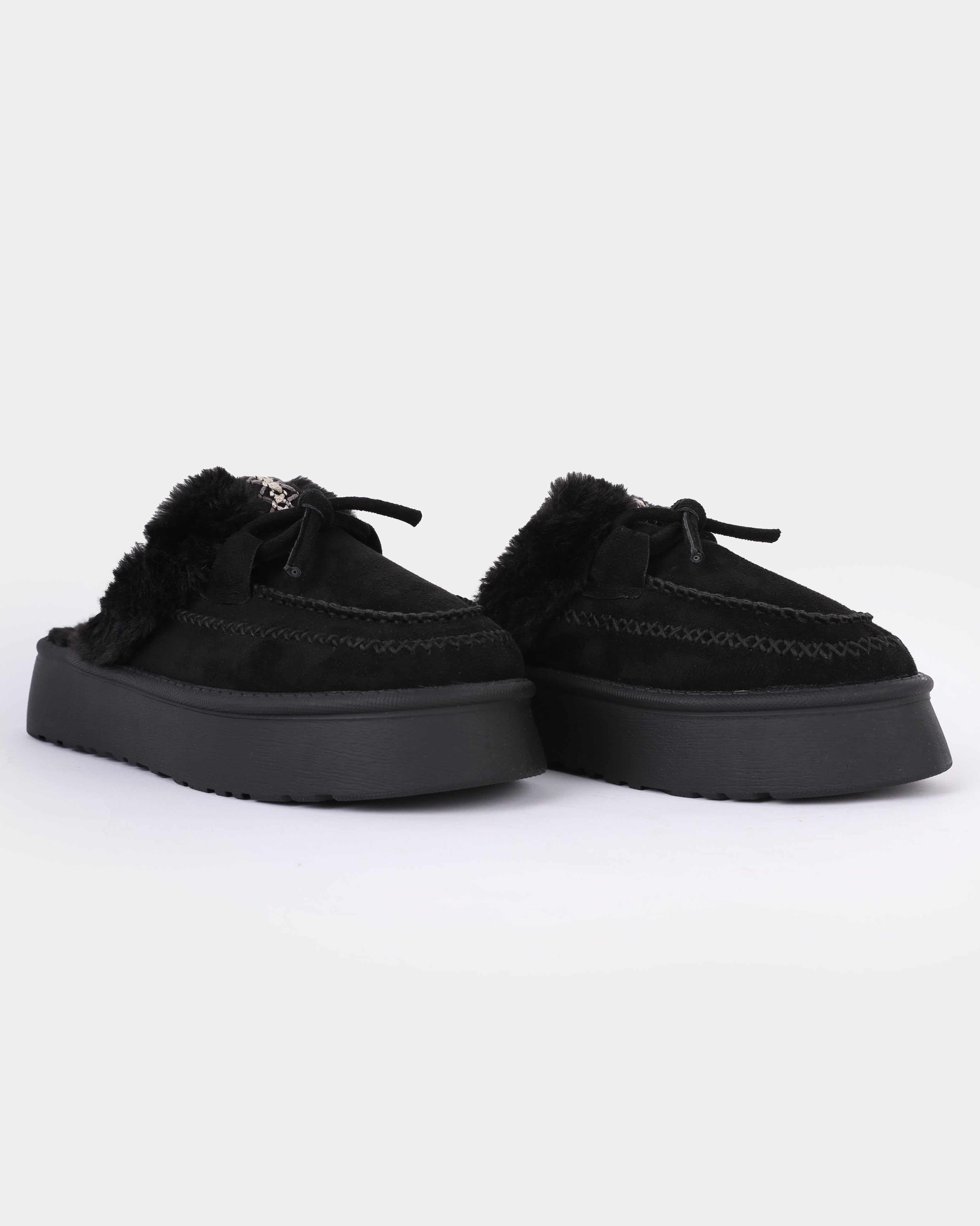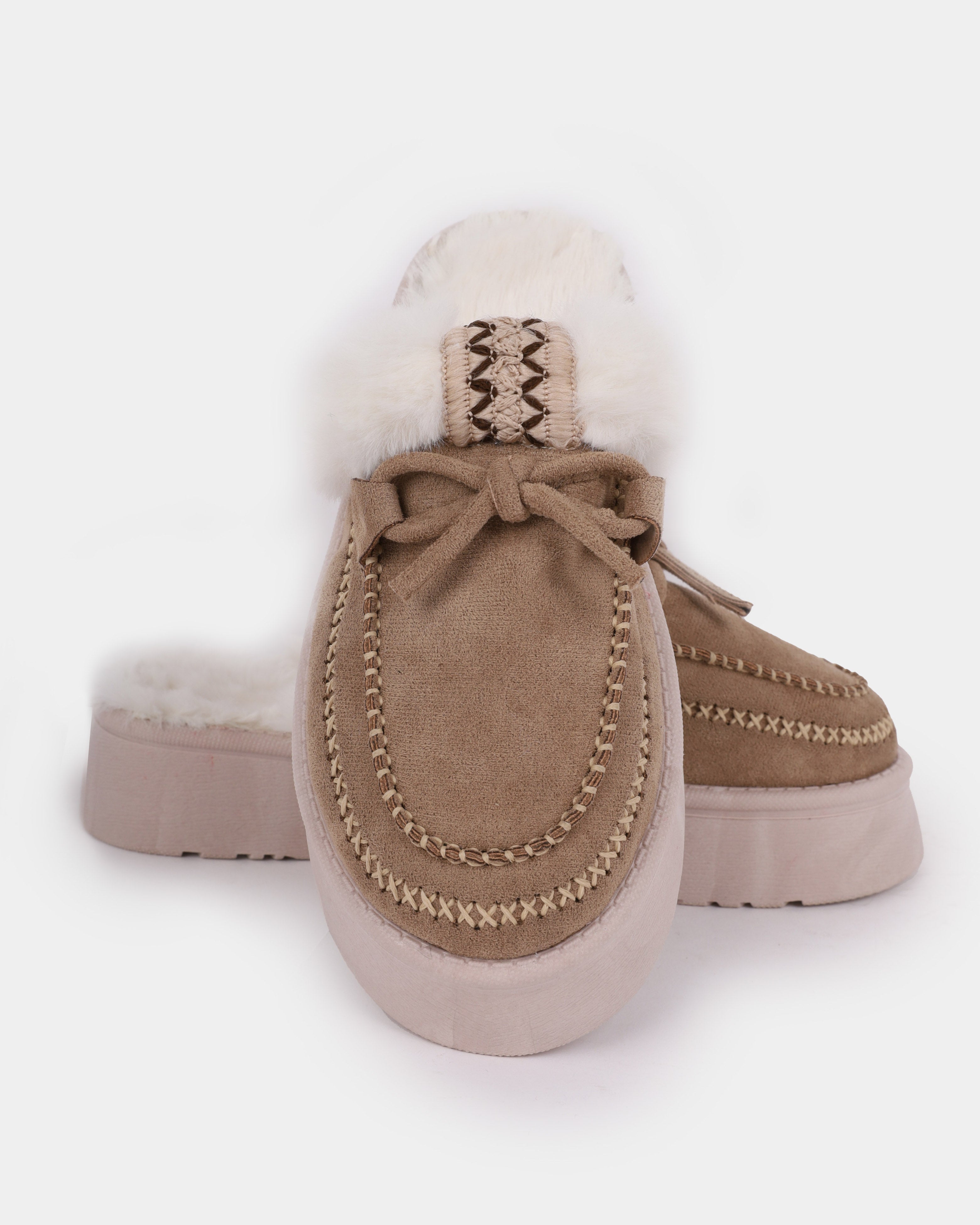 Stylish suede slippers featuring a chunky platform sole and soft faux fur lining for extra warmth and comfort.