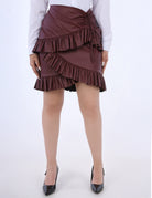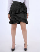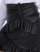 A stylish short faux leather skirt designed with elegant ruffle details for a feminine and modern look. Perfect for creating bold.