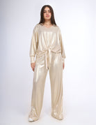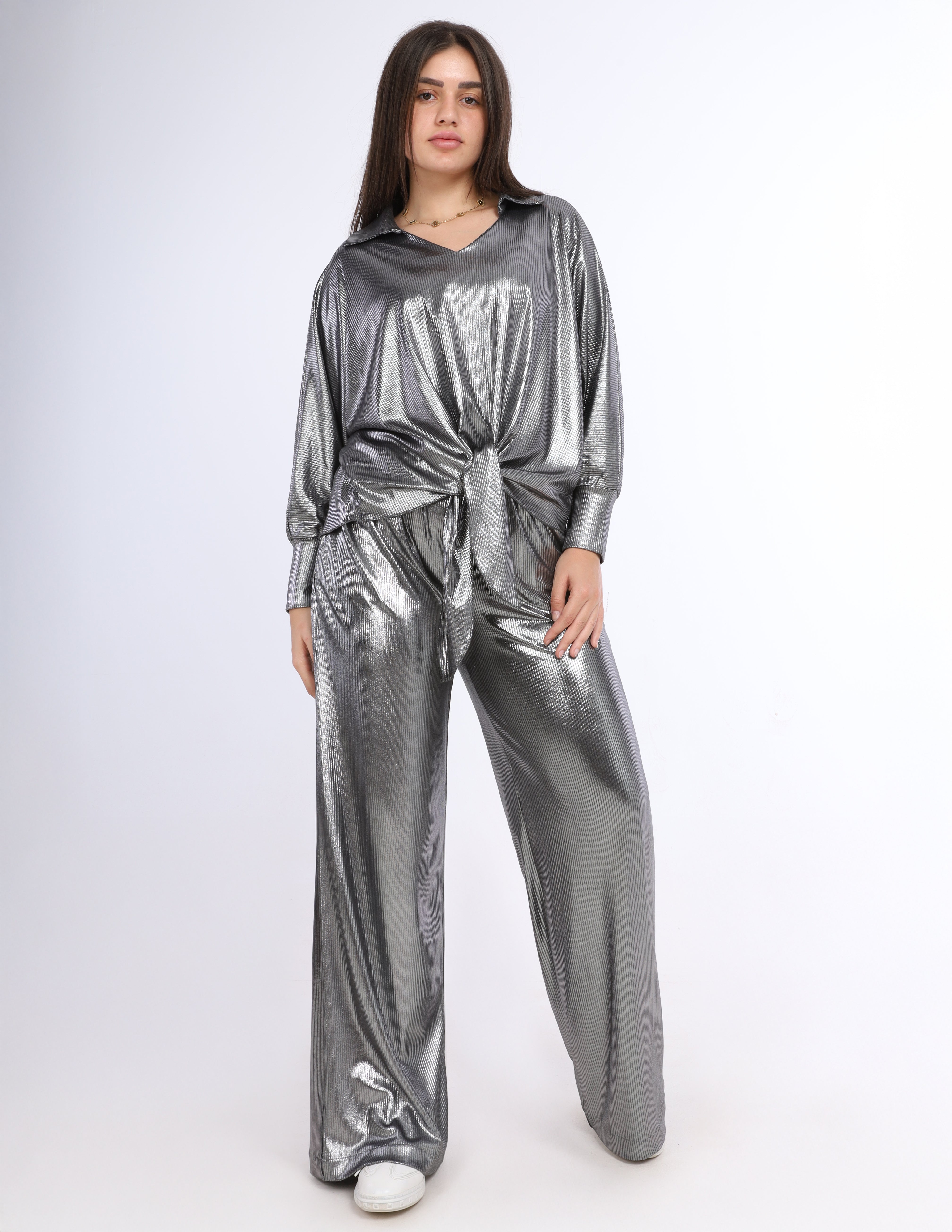 Shine with confidence in this two-piece loungewear set, featuring a tie-front top and wide-leg pants.