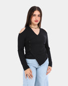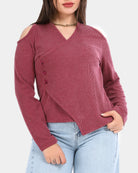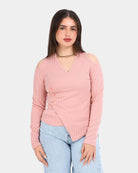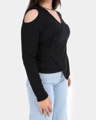 Stylish ribbed top designed with cold shoulder cutouts and a wrap-style front for a flattering, feminine look.
