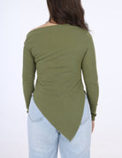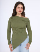 Chic one-shoulder top with an asymmetric hem and long sleeve design.