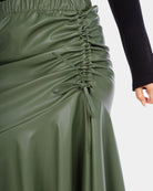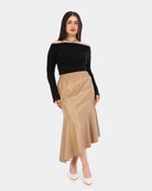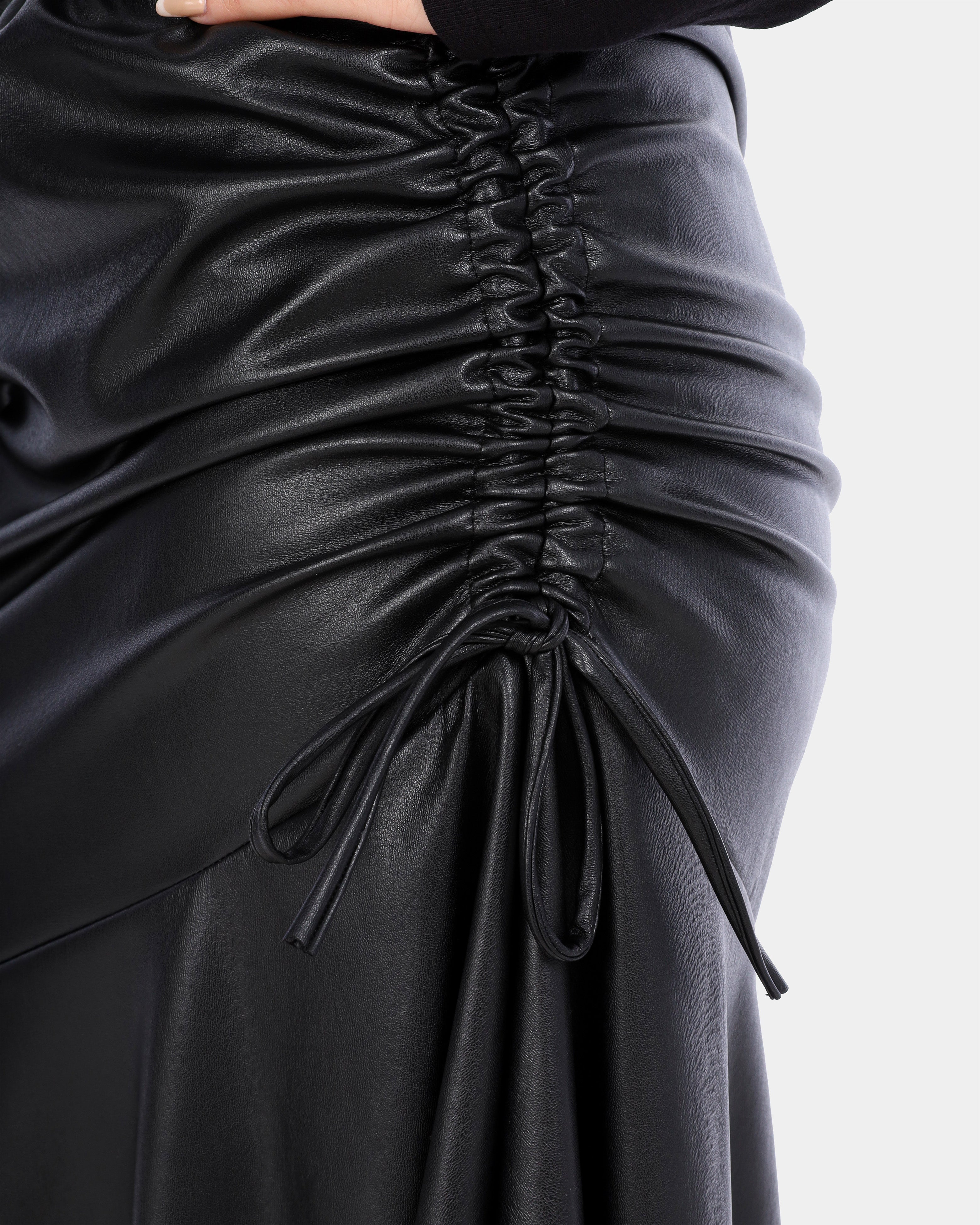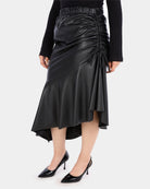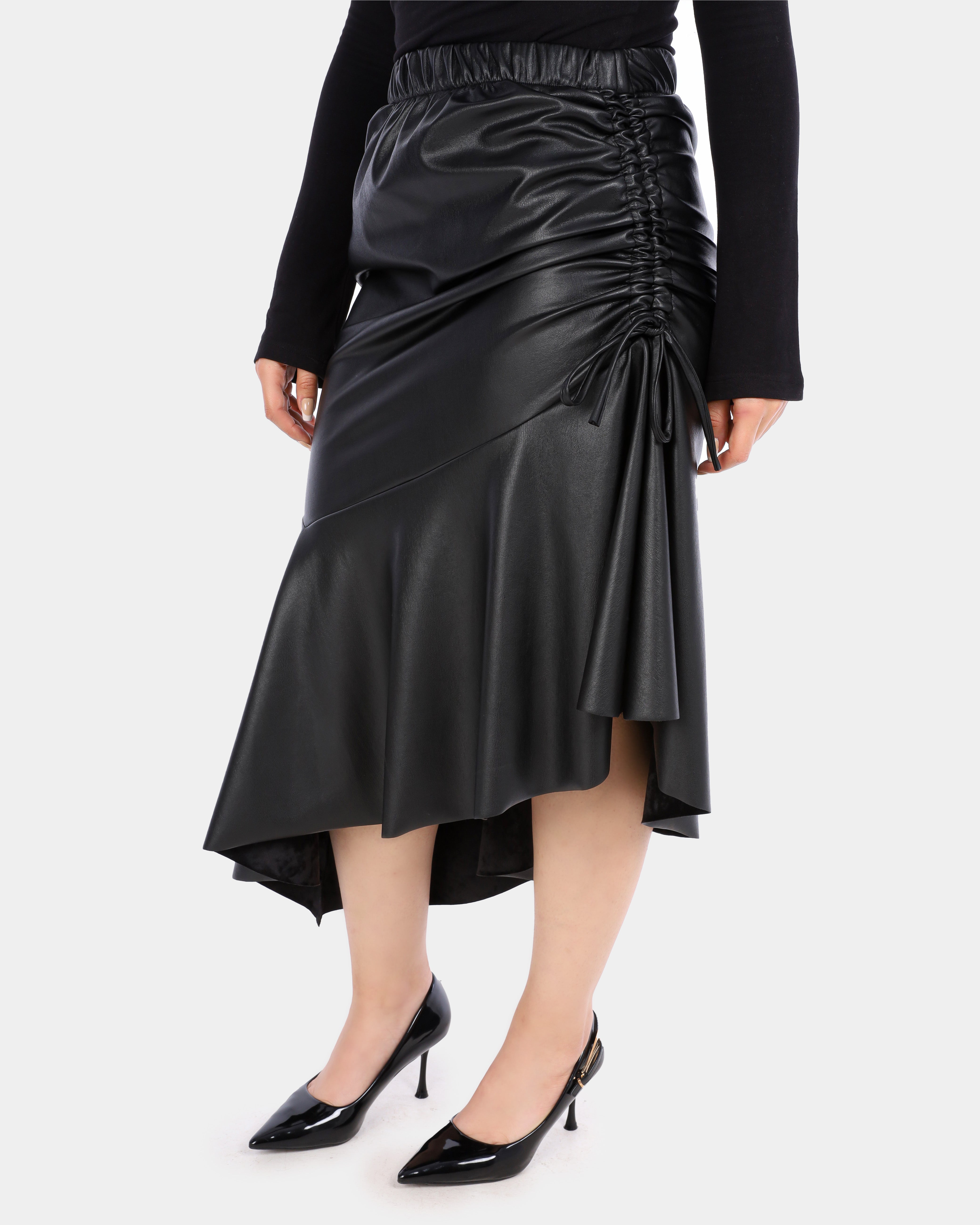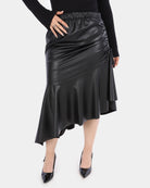 A stylish faux leather skirt featuring an asymmetrical hem and side elastic for a comfortable, flattering fit. Perfect for a modern, edgy look.