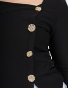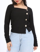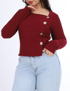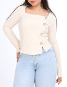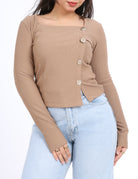 Asymmetric Button Detail Ribbed Top , this fitted long-sleeve top features a unique diagonal button design that adds a modern, chic twist to your everyday style.