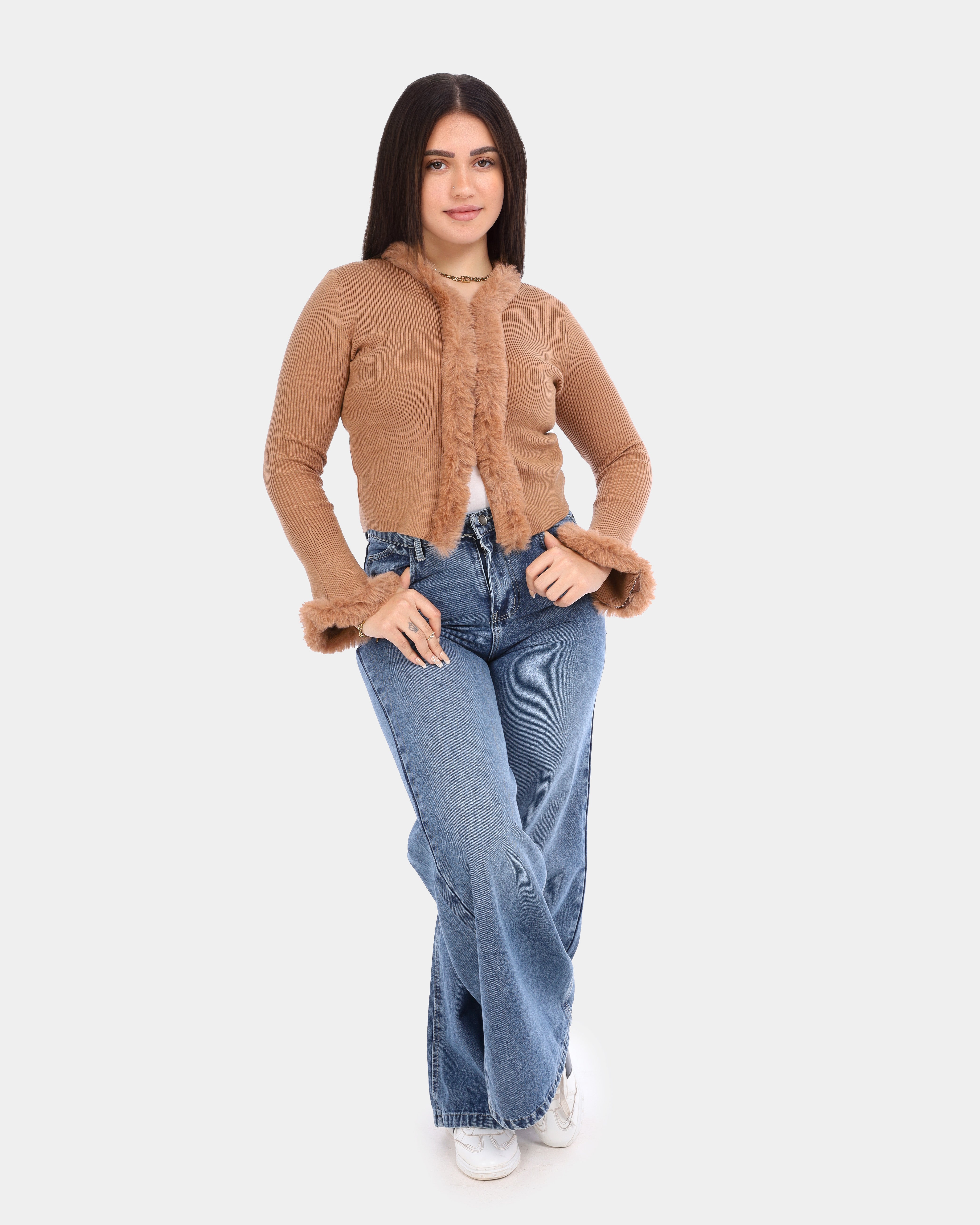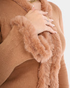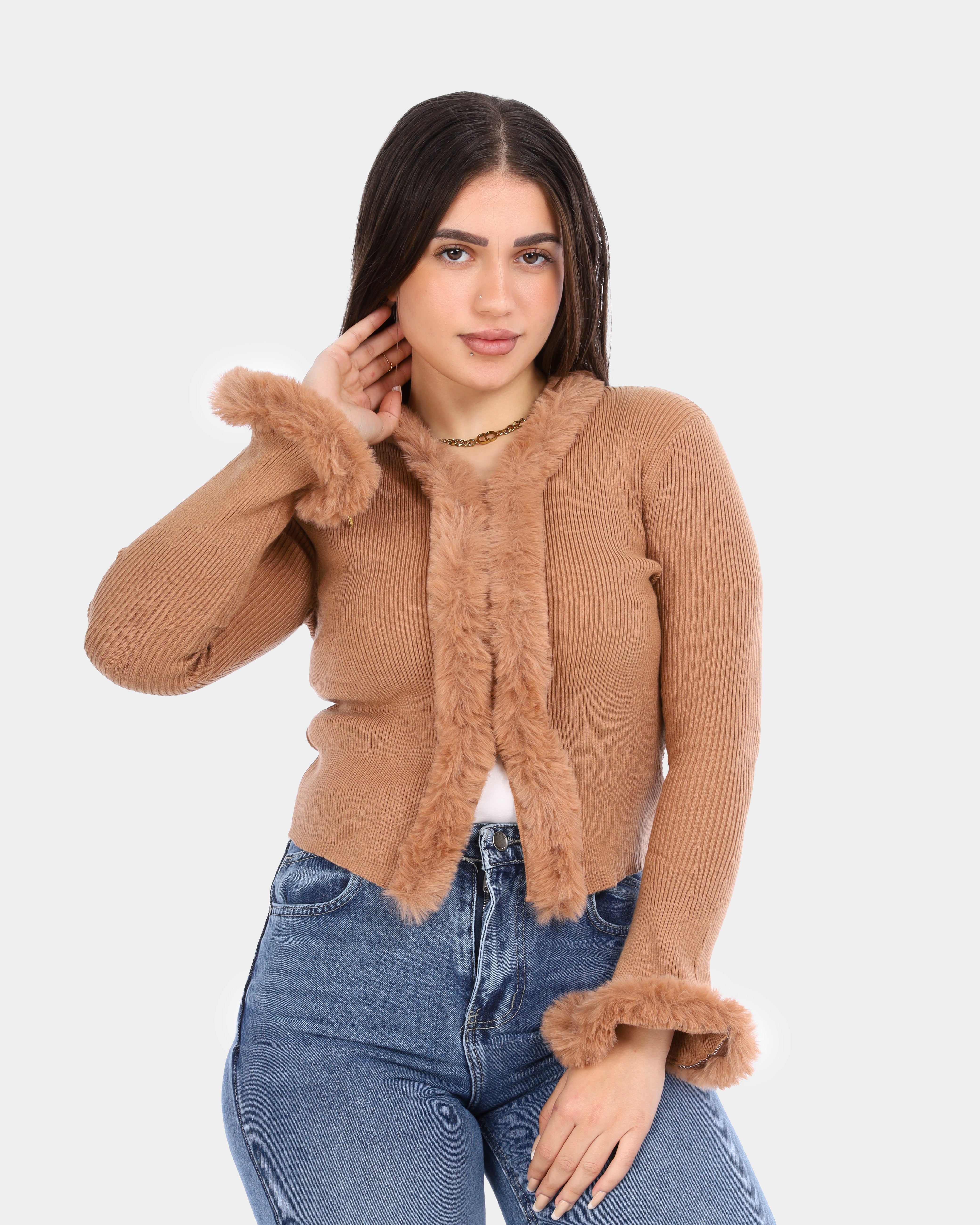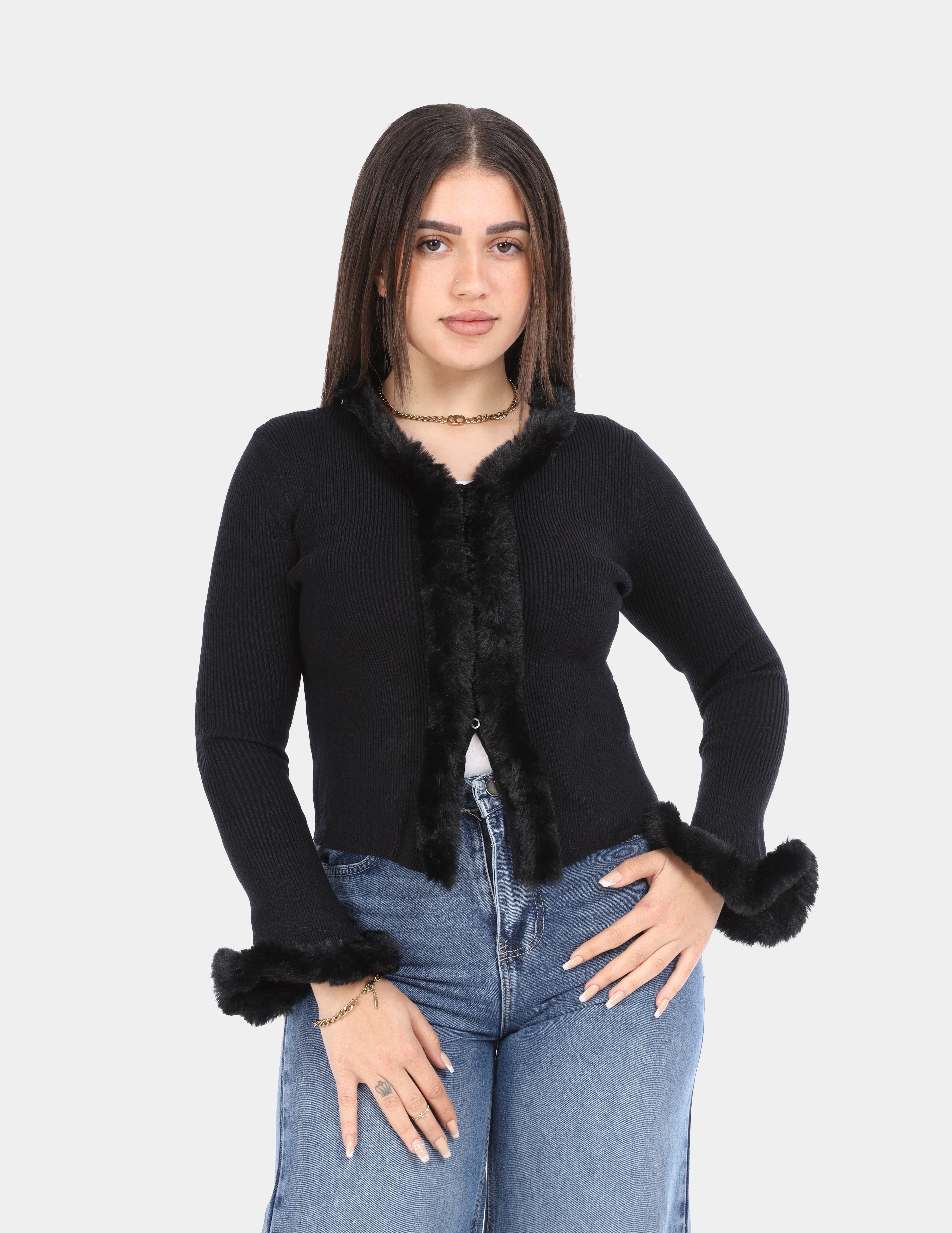 A cozy knit blouse designed with elegant faux fur trim for a chic winter look.