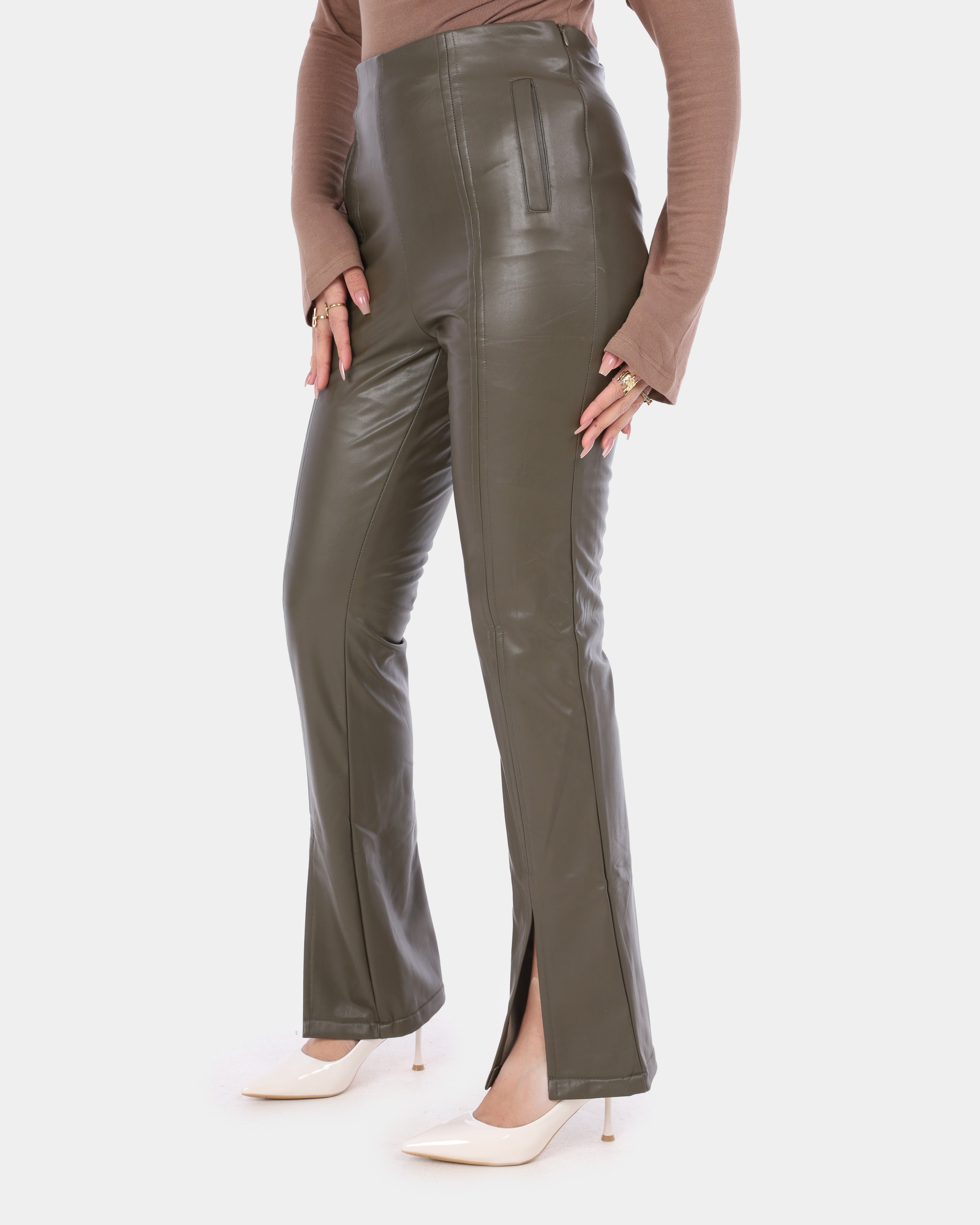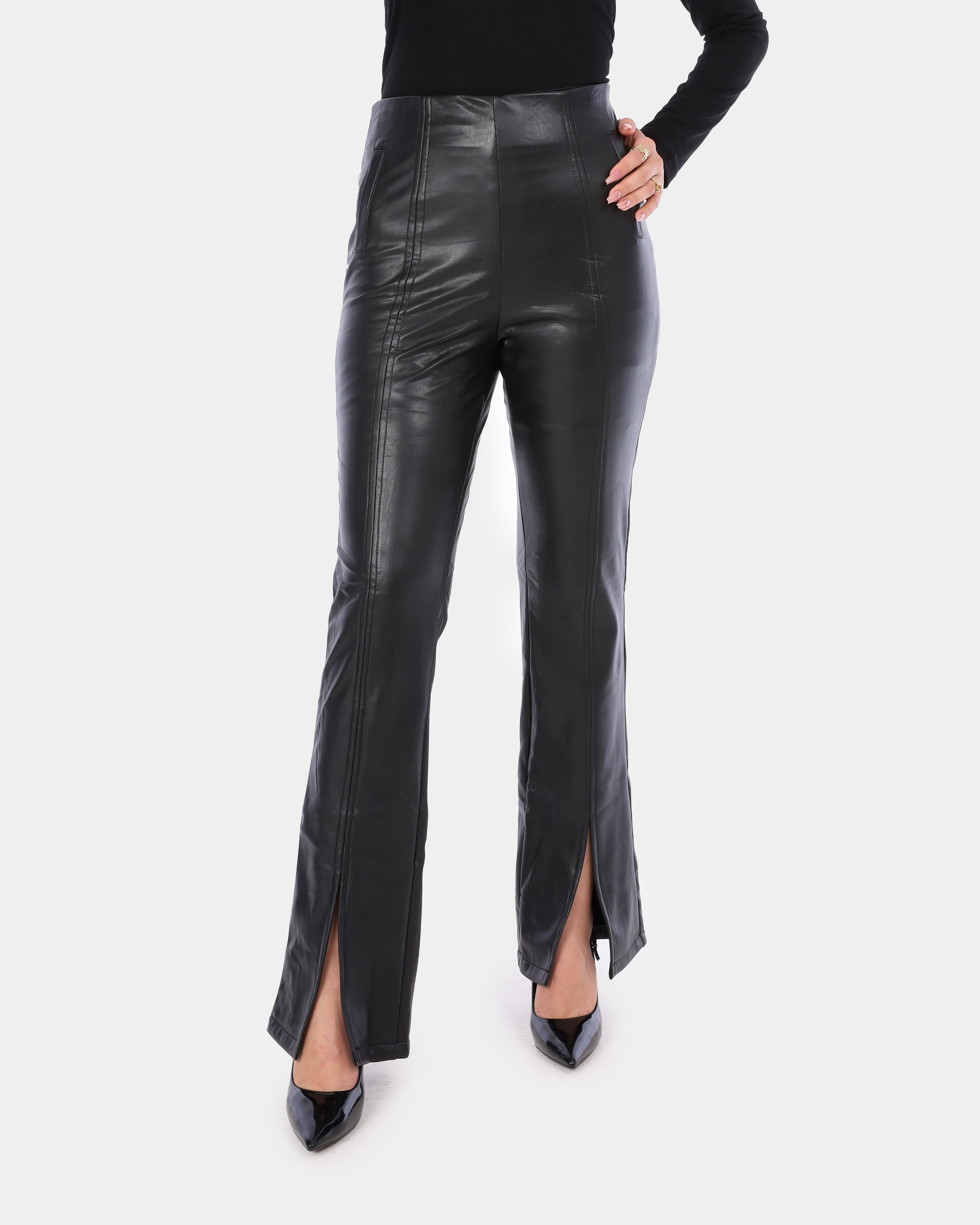 Flared Faux Leather Pants with Front Slit w17204001