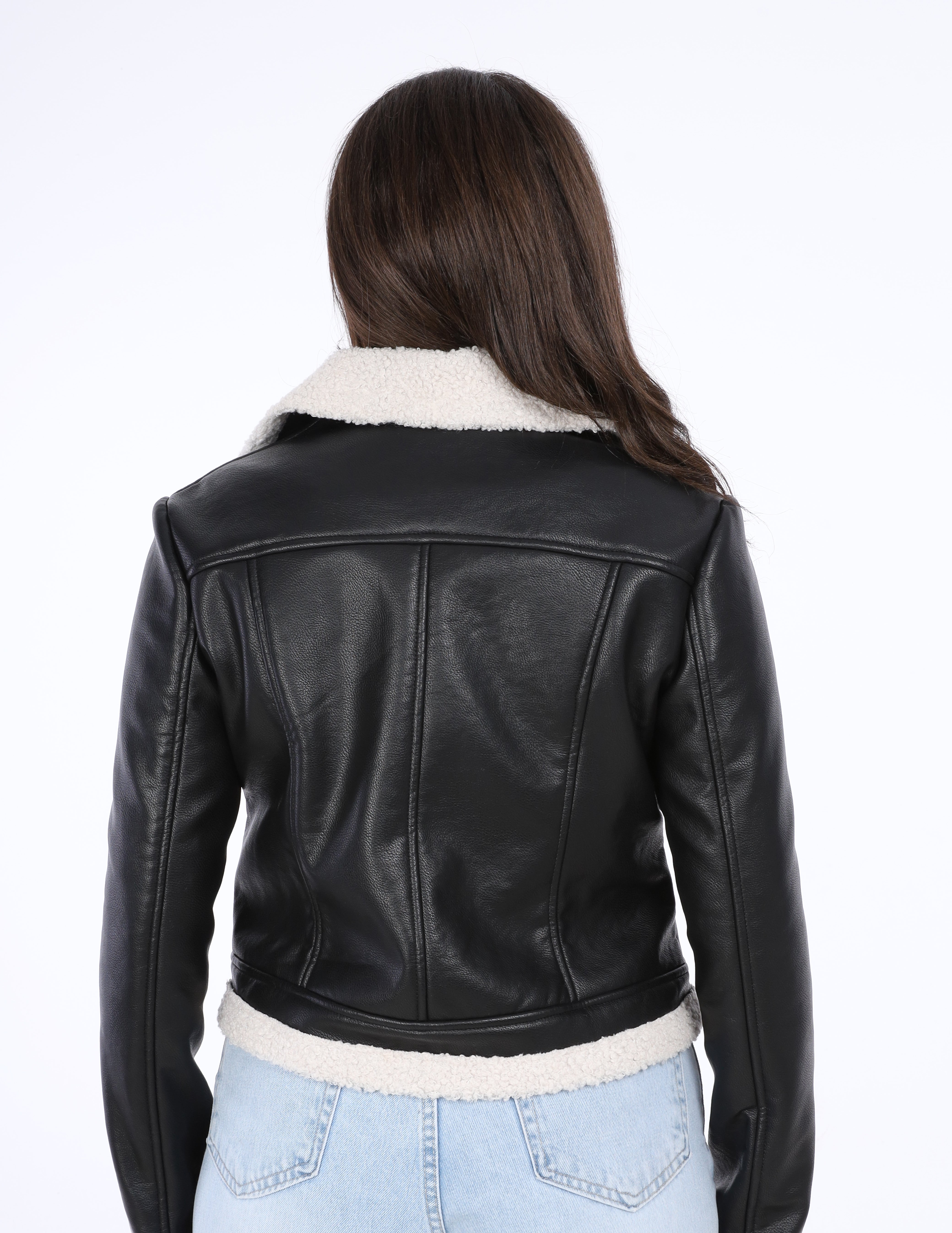 Trendy winter jacket combining soft faux fur with sleek leather details for a bold