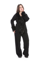 Two-piece set features a soft velvet long-sleeve top with a flattering waist tie and matching wide-leg pants.