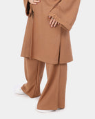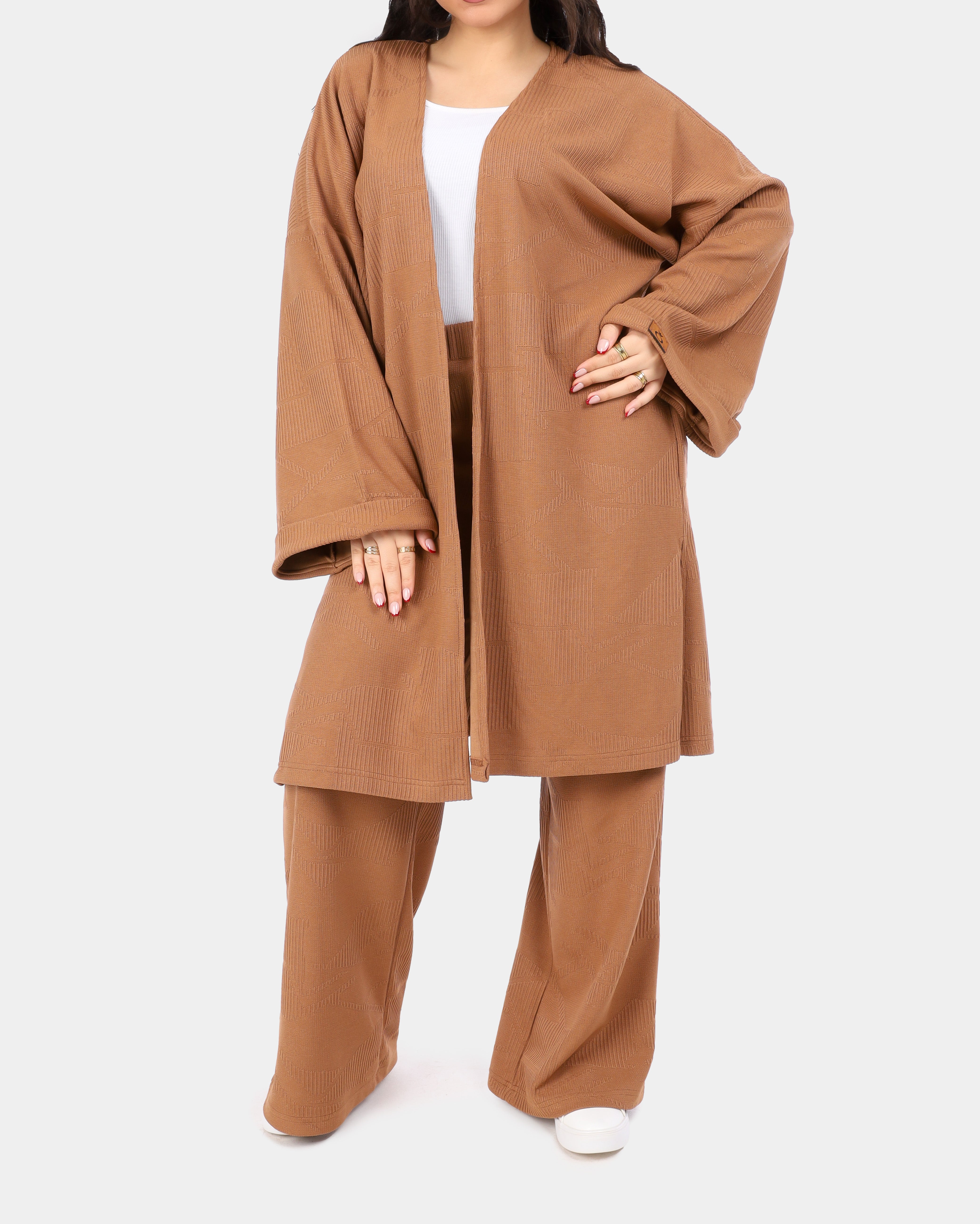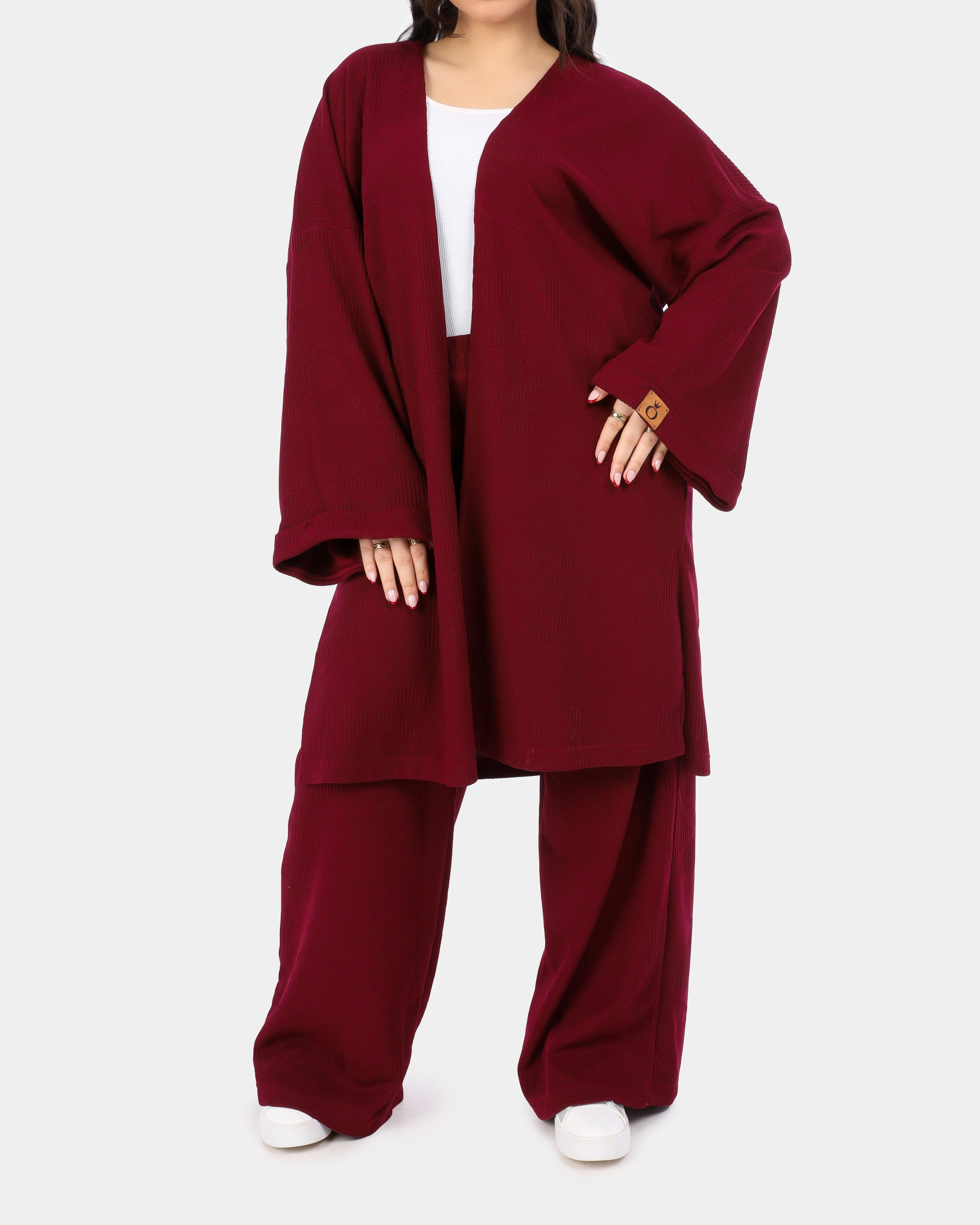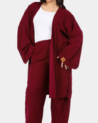 A matching ribbed set featuring a long cardigan and wide-leg pants, offering comfort and effortless style.