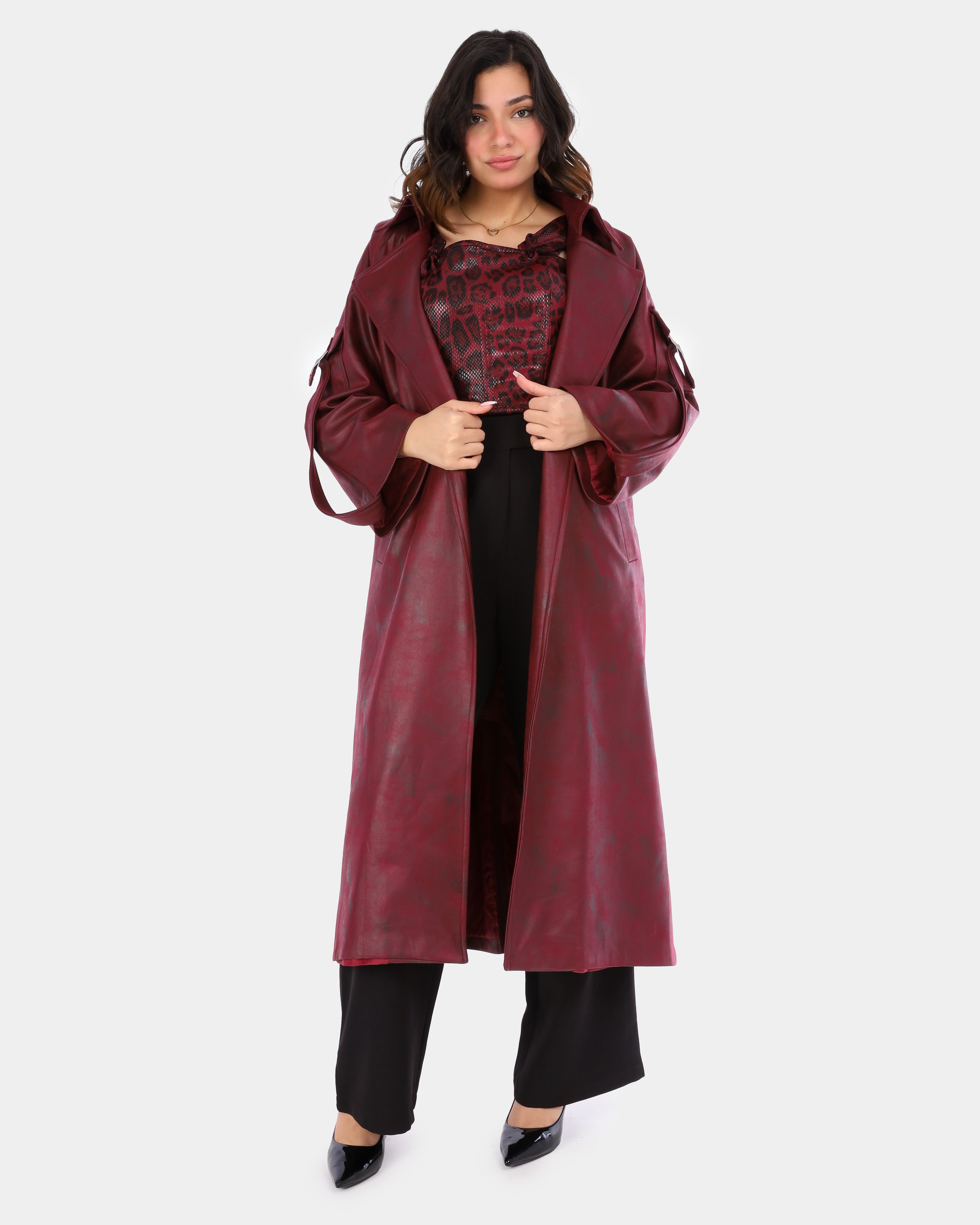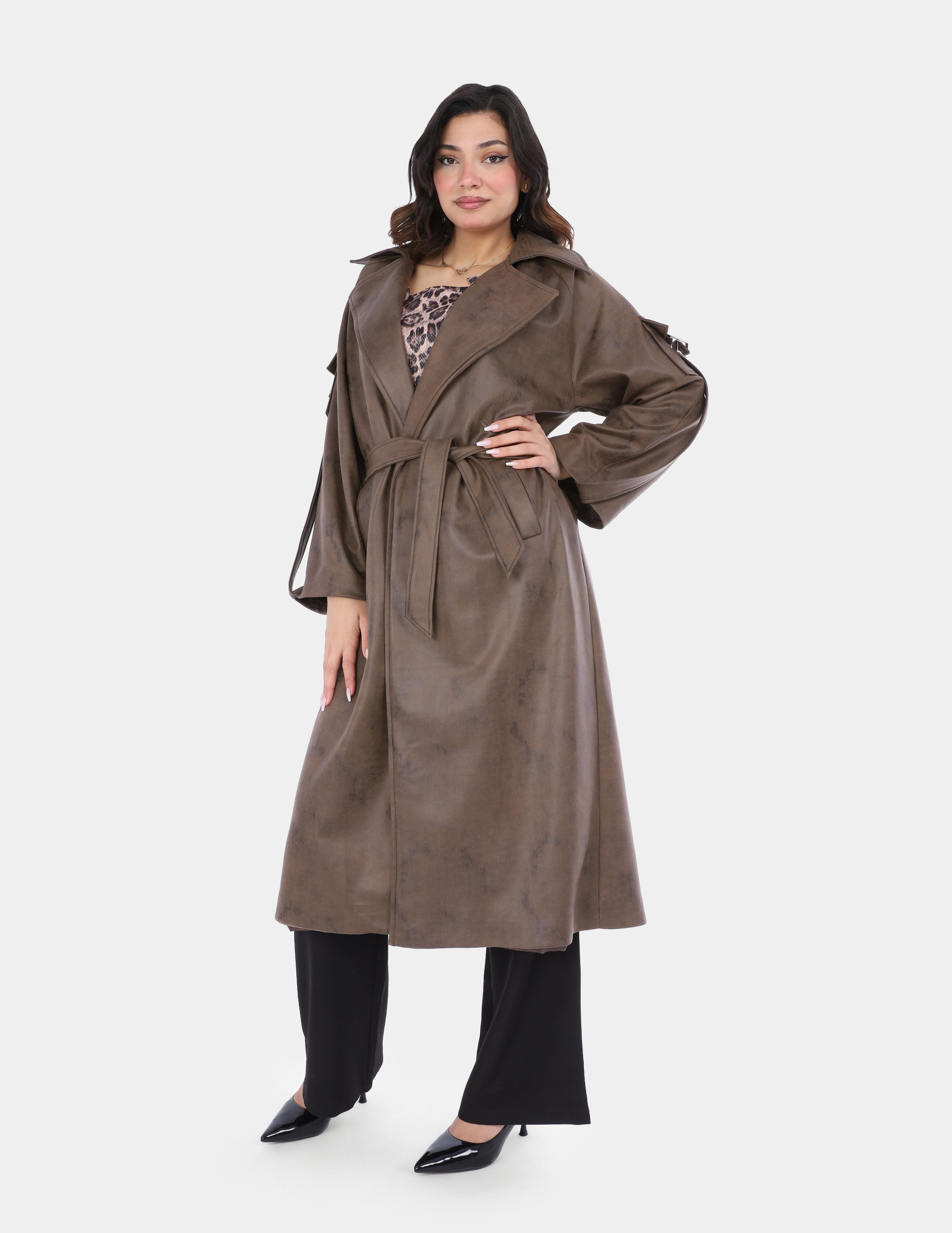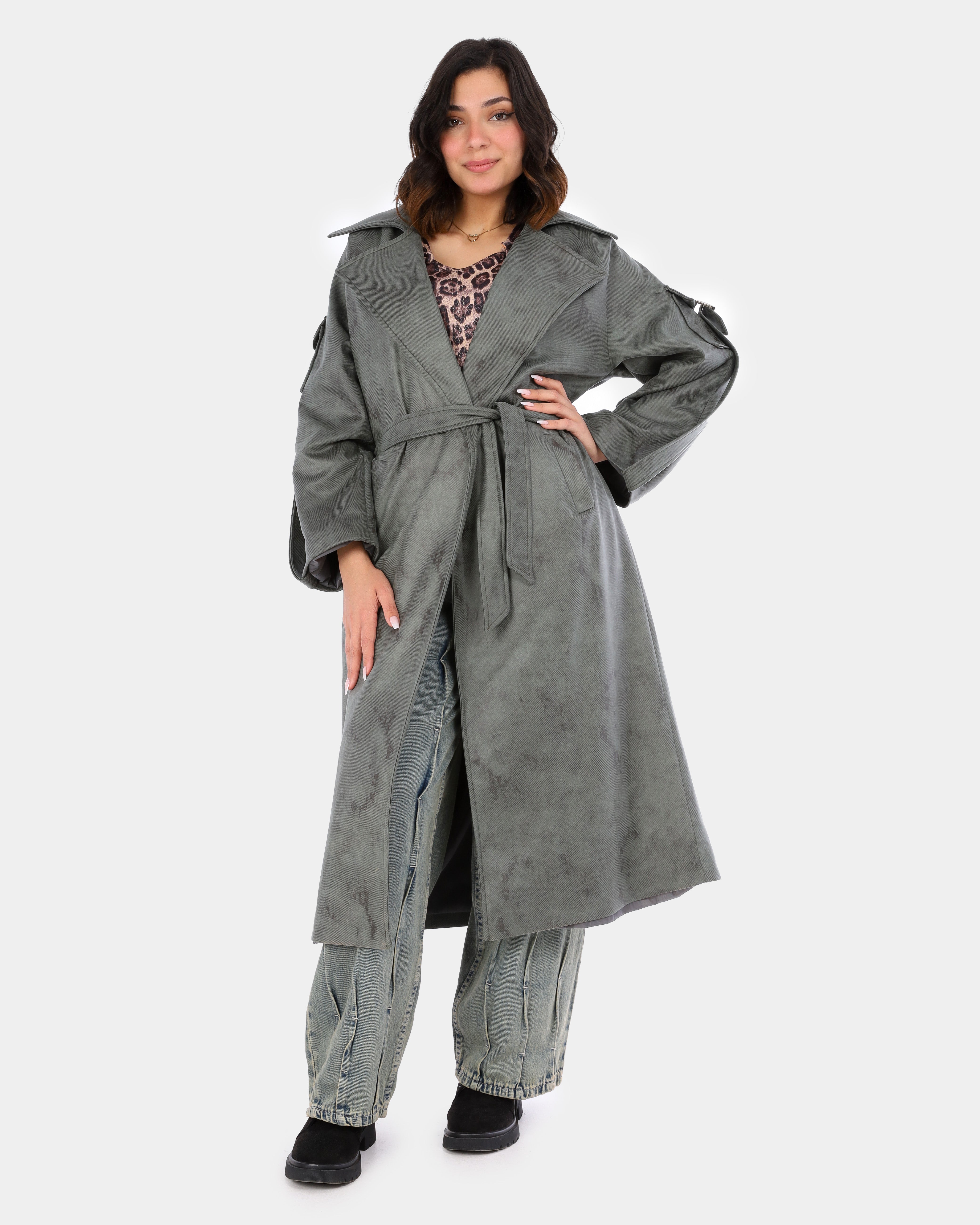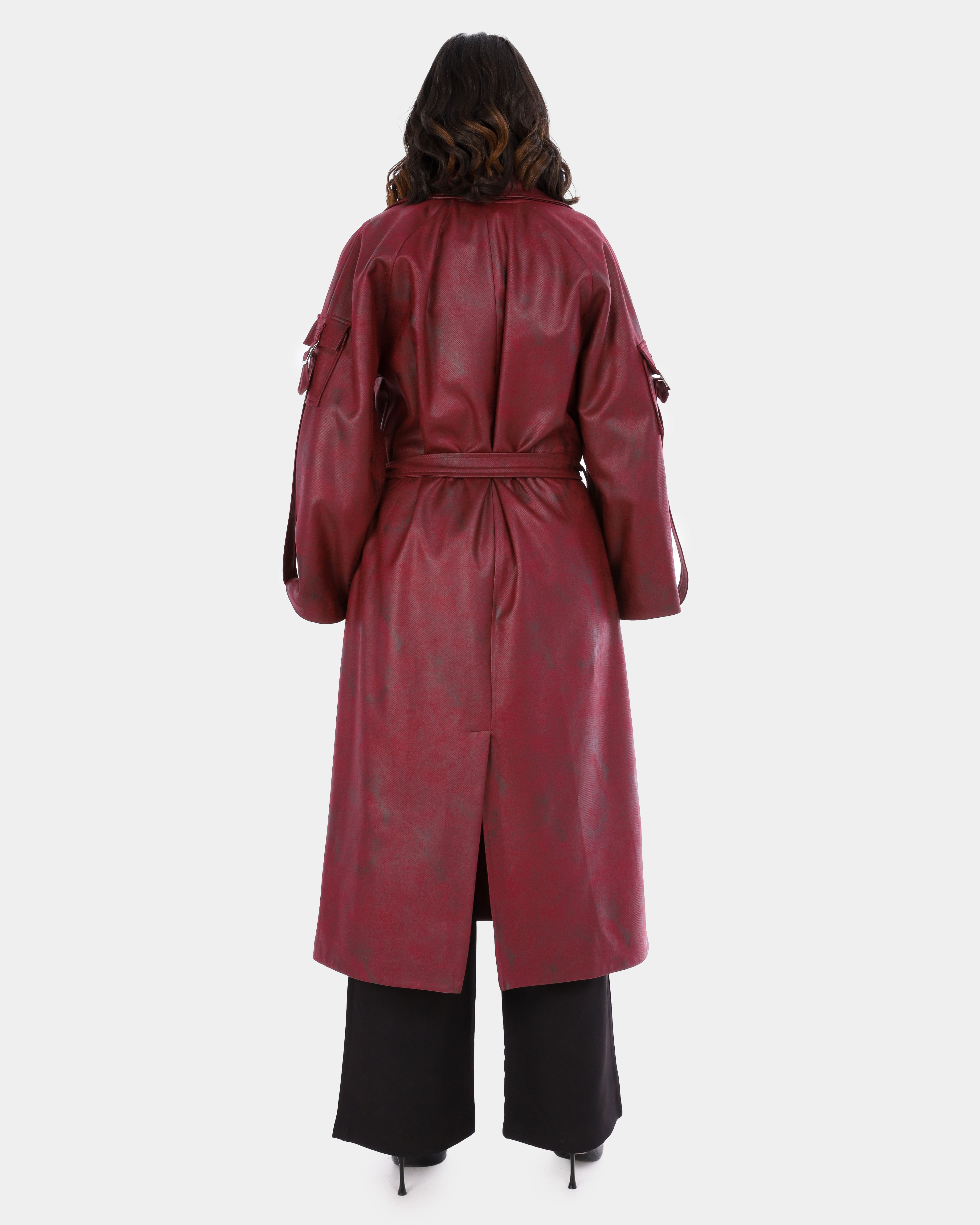 A long trench coat designed with a modern utility touch, featuring unique sleeve pockets and a belt-inspired detail for a bold, contemporary look.