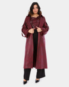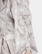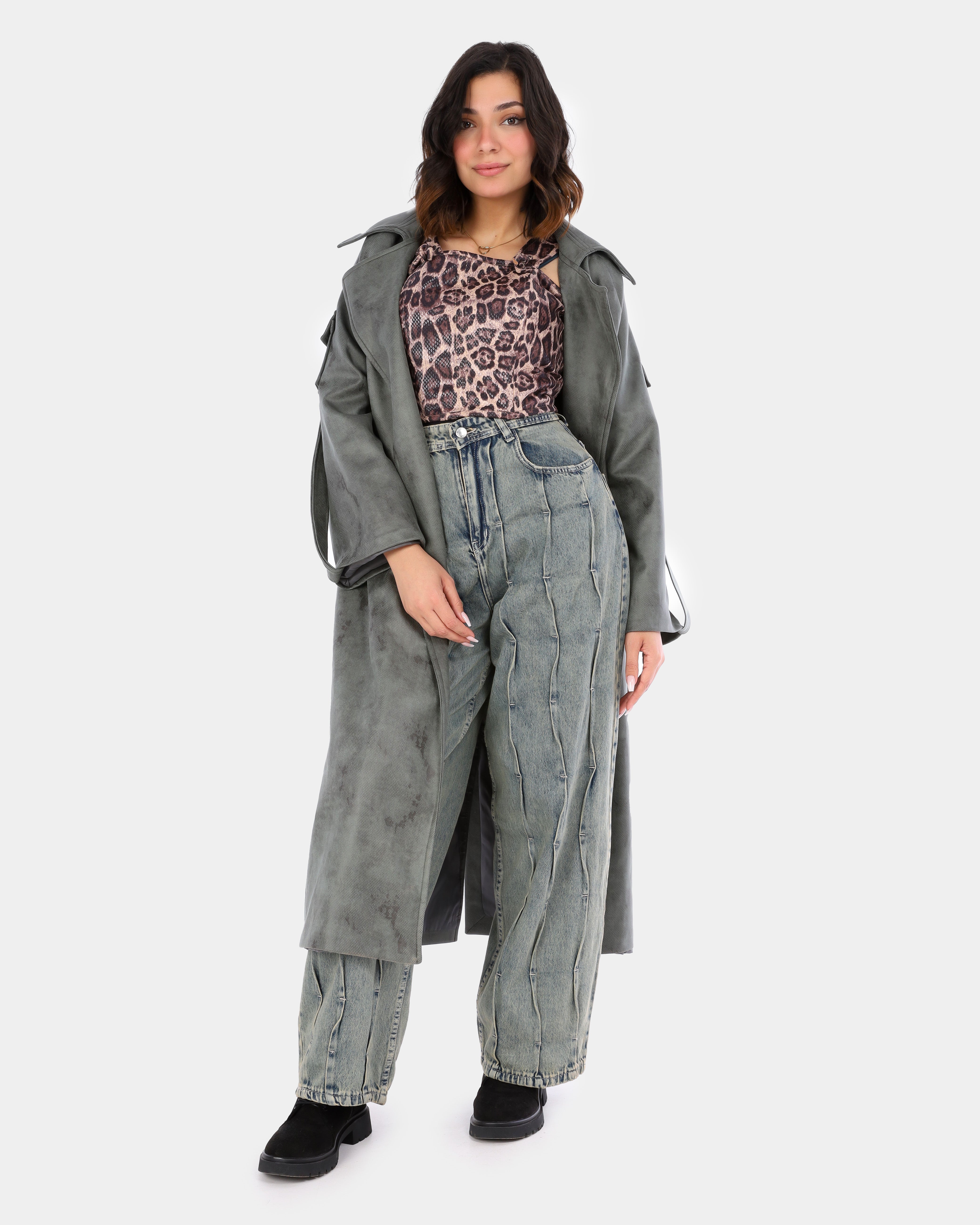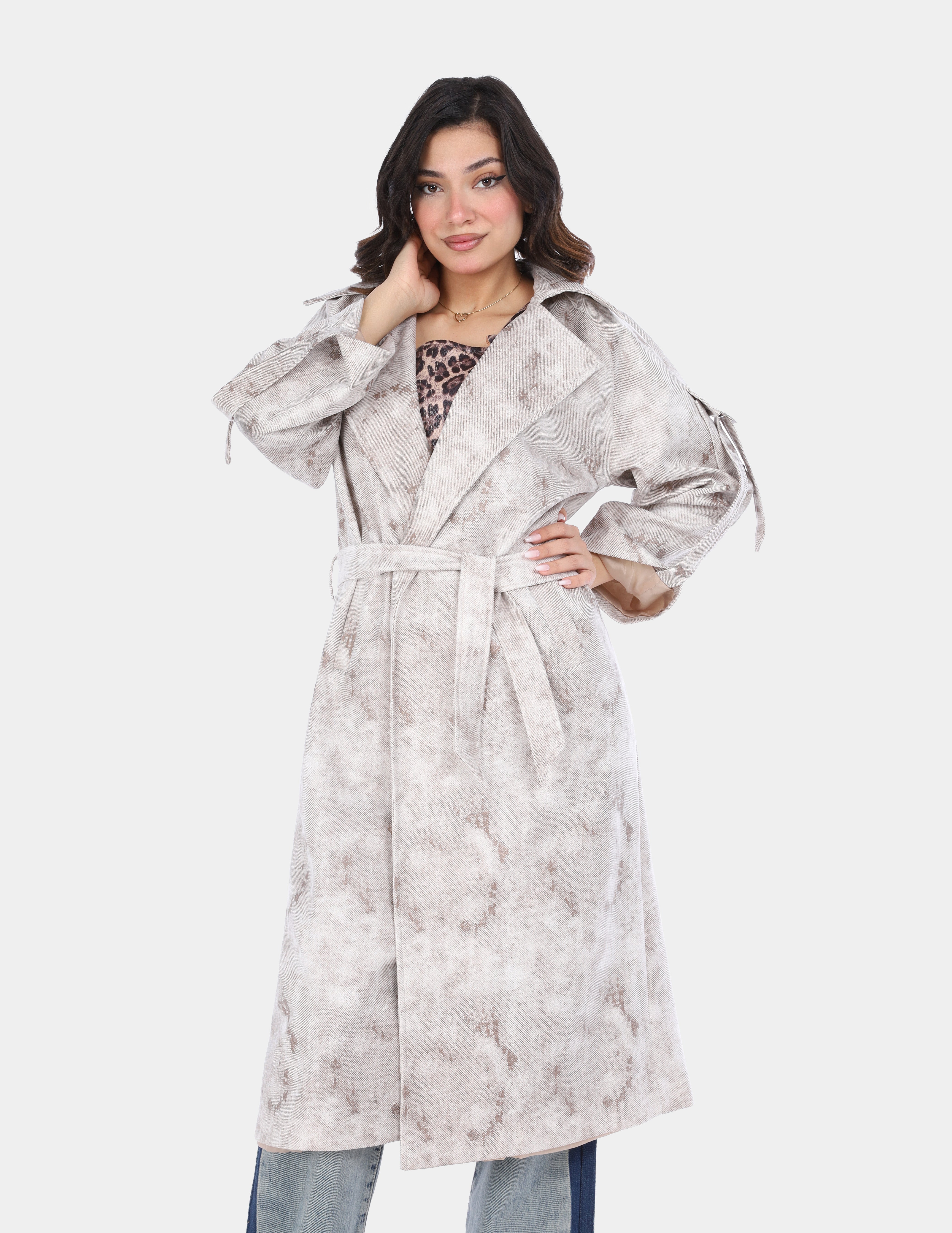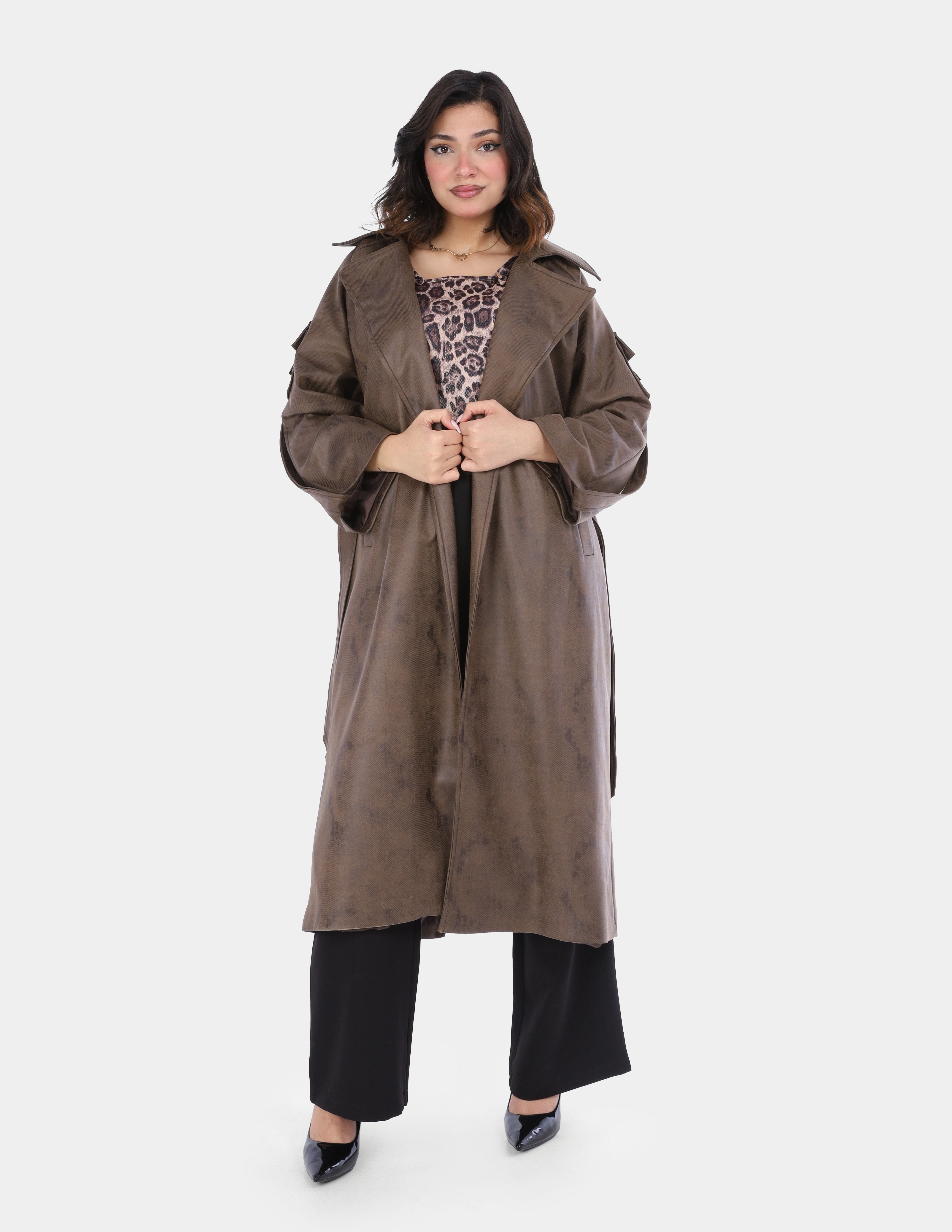 A long trench coat designed with a modern utility touch, featuring unique sleeve pockets and a belt-inspired detail for a bold, contemporary look.