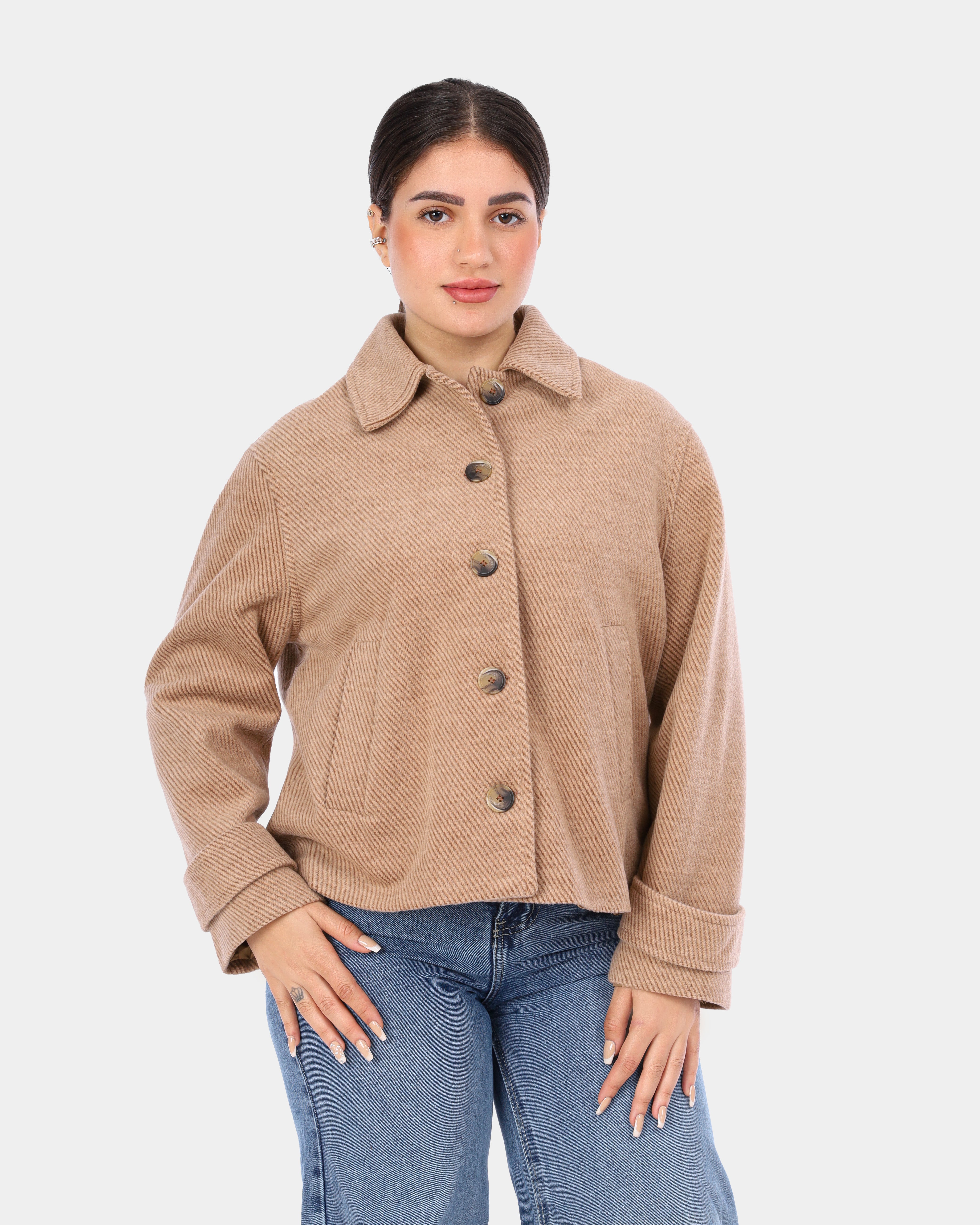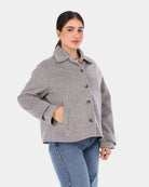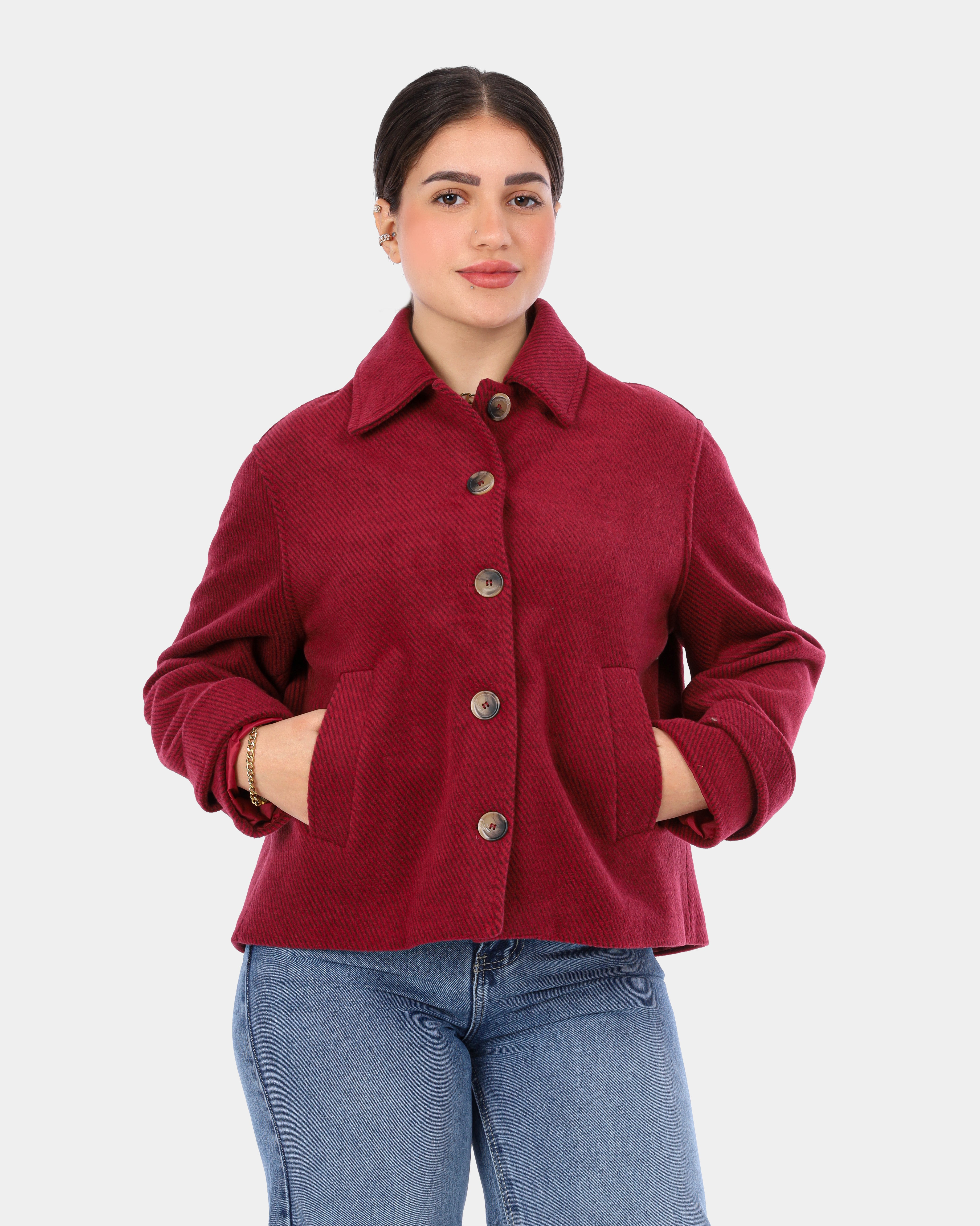 A timeless wool peacoat jacket with a structured fit, offering warmth and effortless elegance for everyday winter wear.