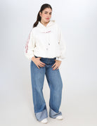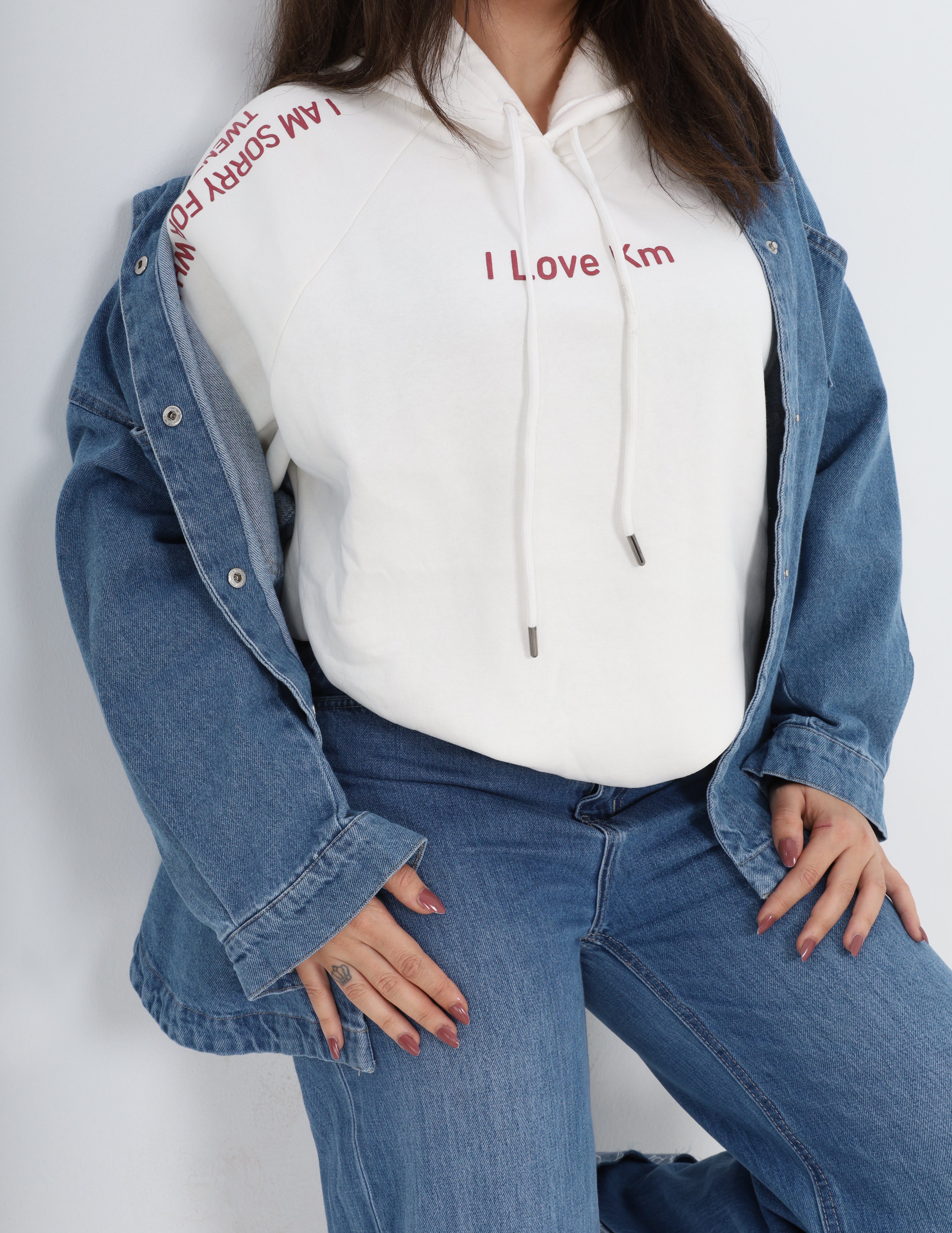 Oversized hoodie with front text and bold sleeve print. Soft, comfy fabric perfect for casual everyday wear.