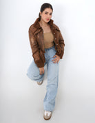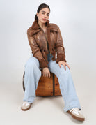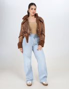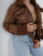 A cozy cropped jacket with soft shearling lining, faux-leather texture, and a front zip for a stylish look.