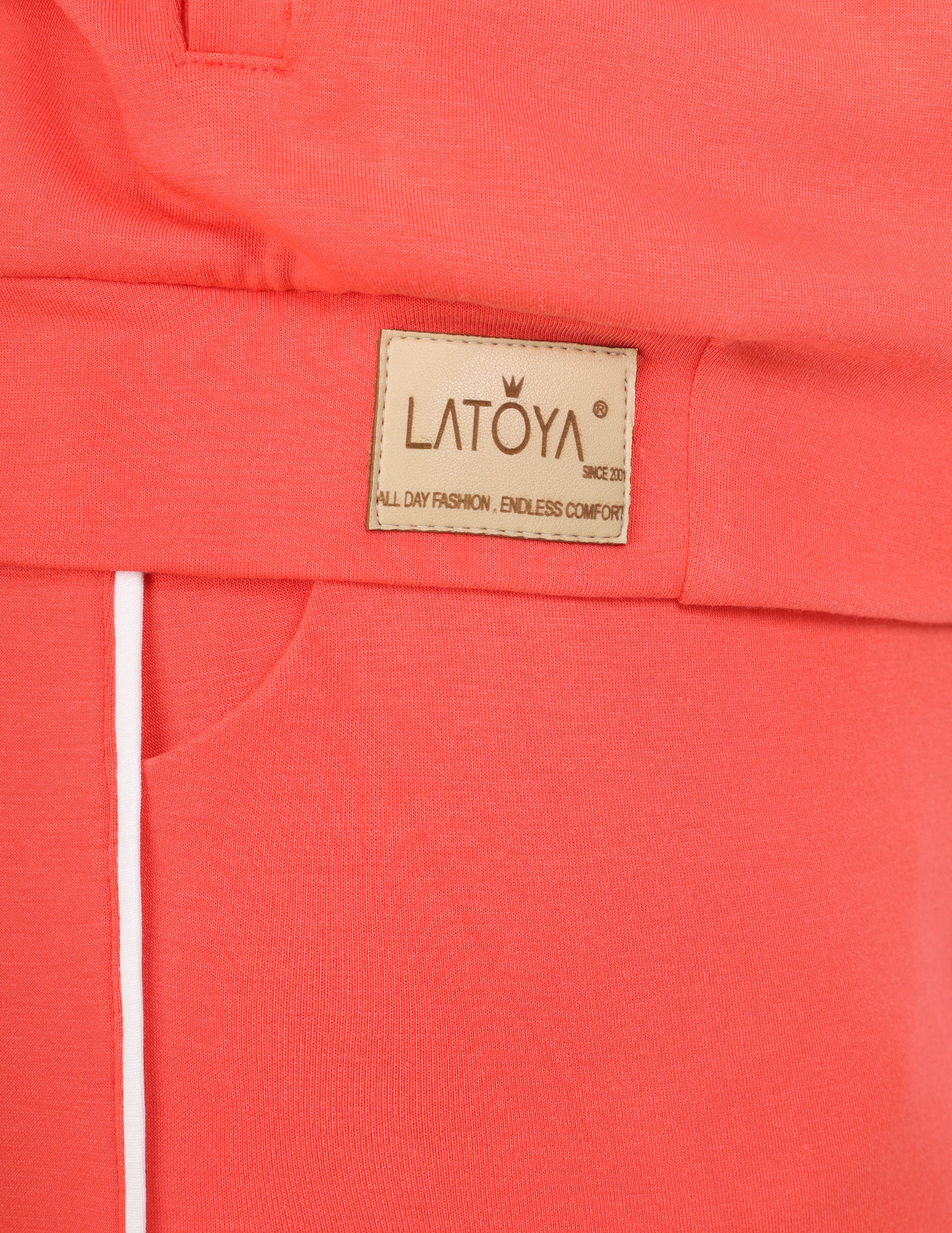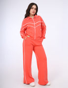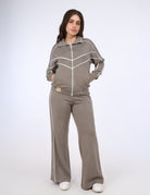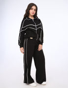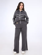 Sports set decorated with stripes consisting of a zip-up jacket and pants containing white stripes for an elegant look