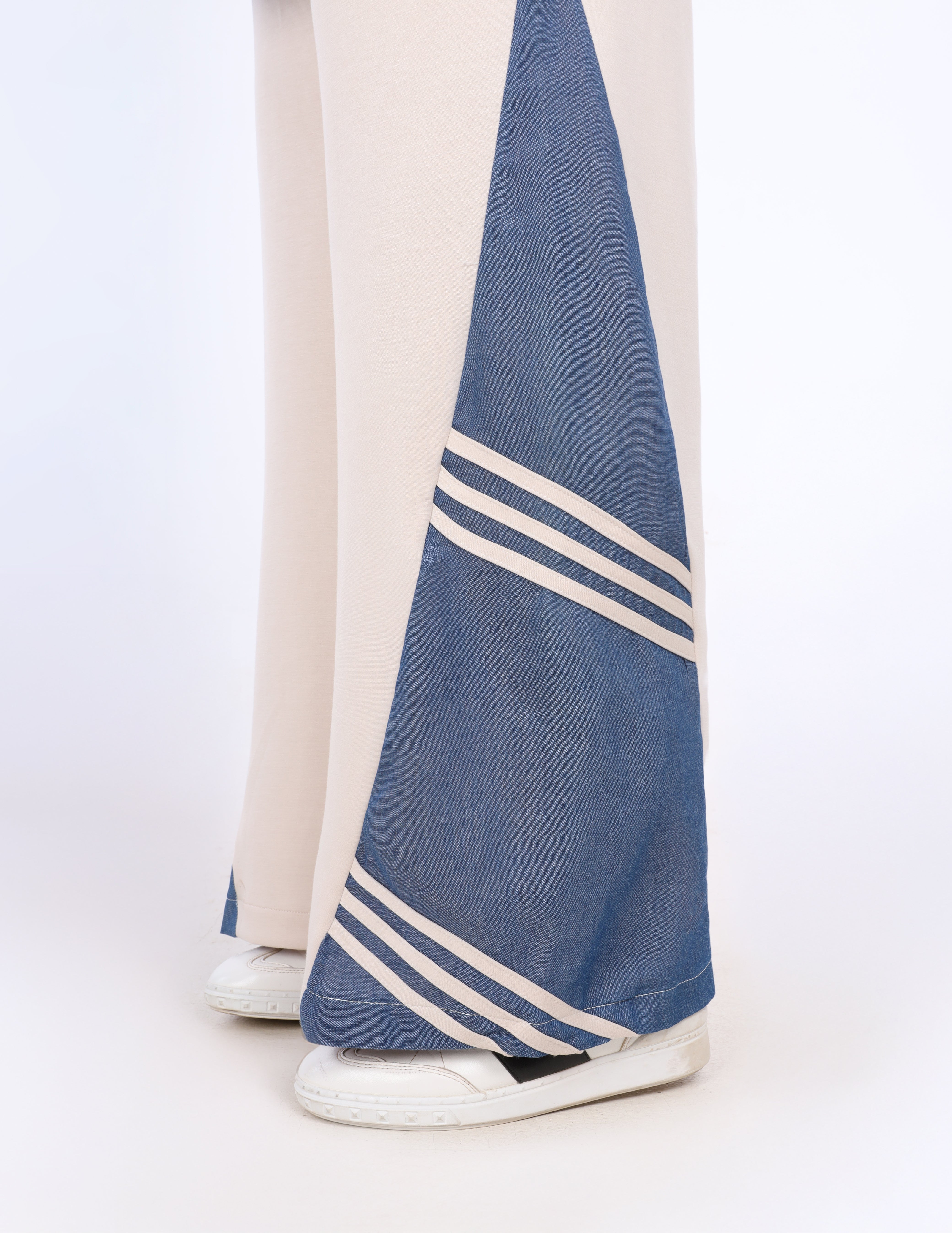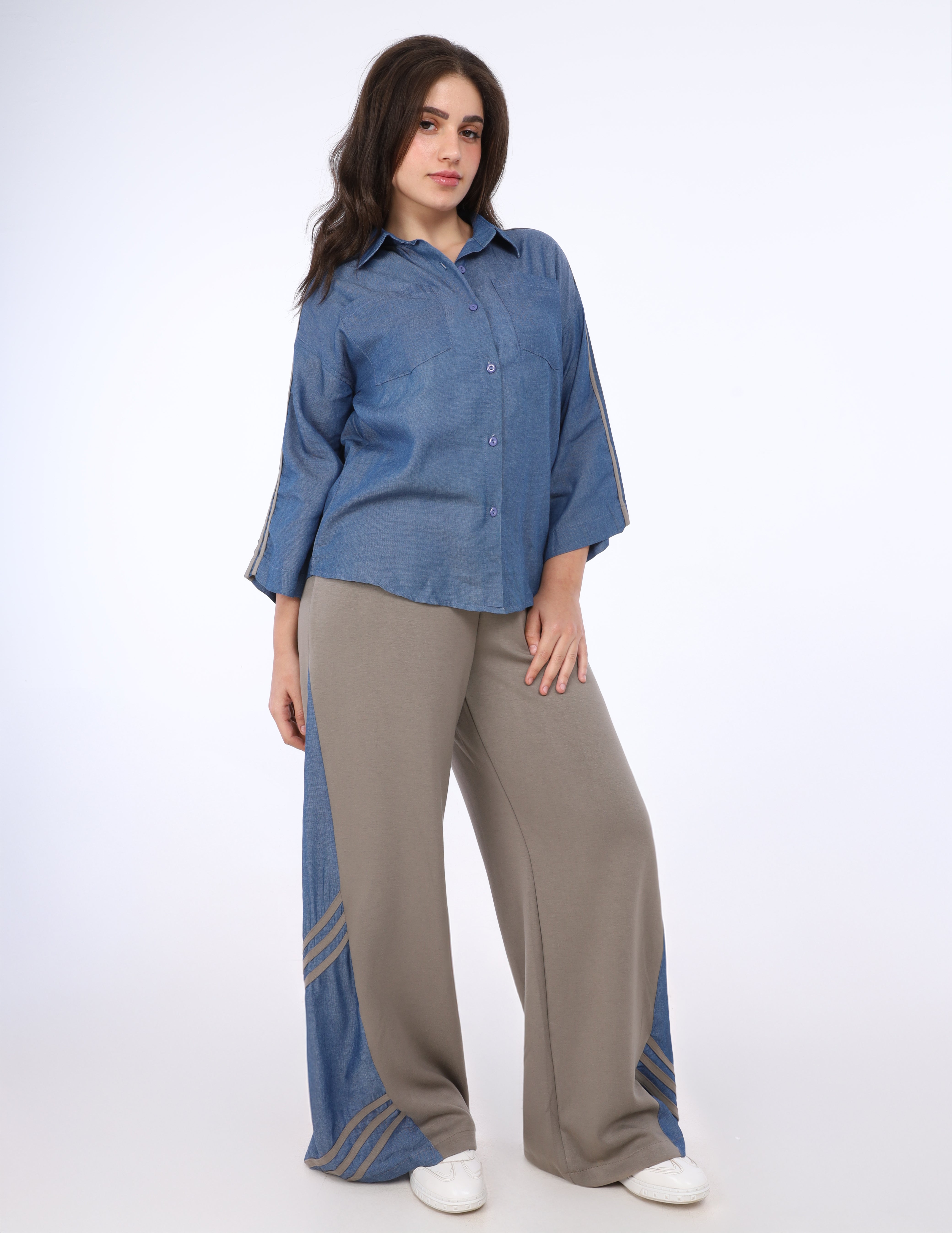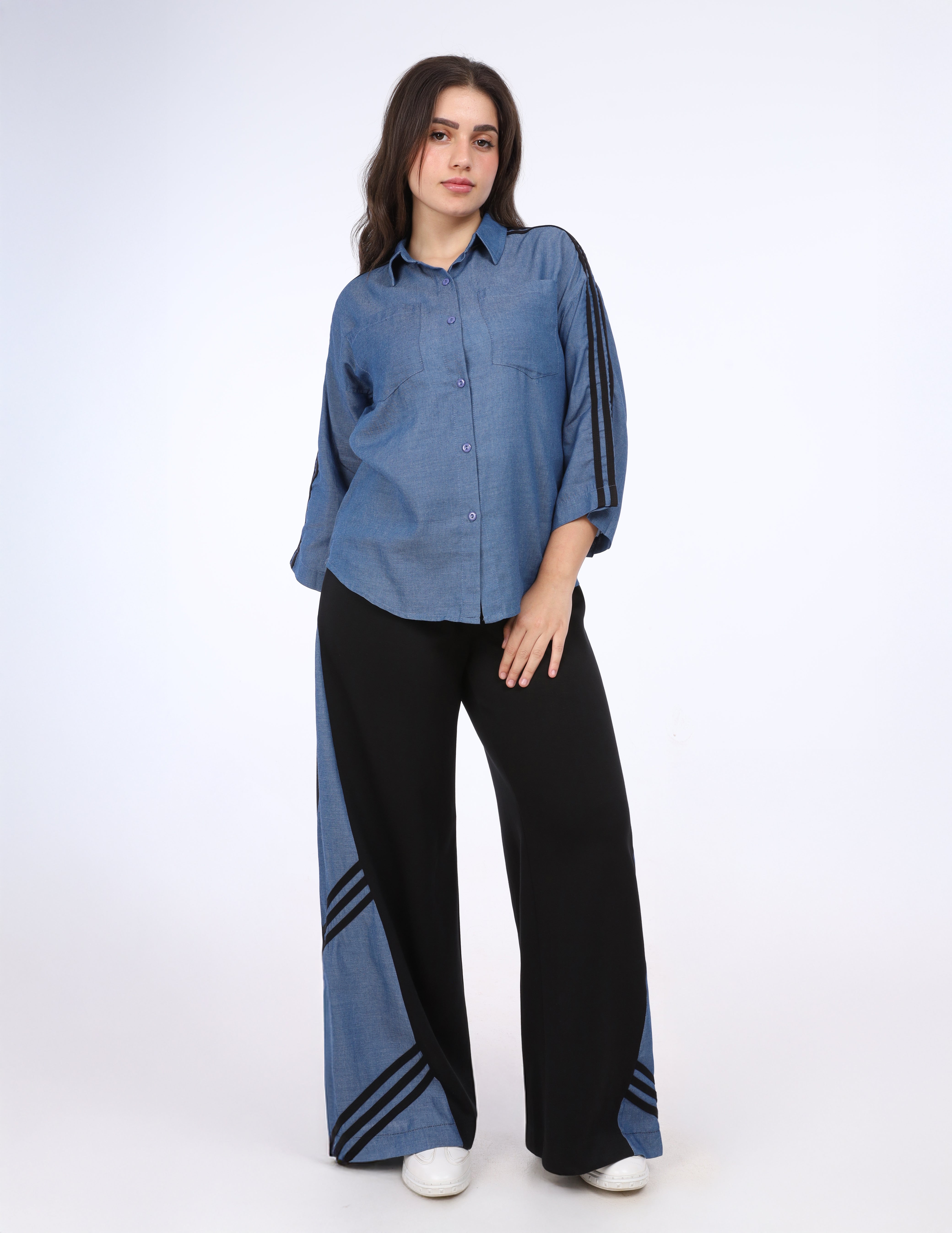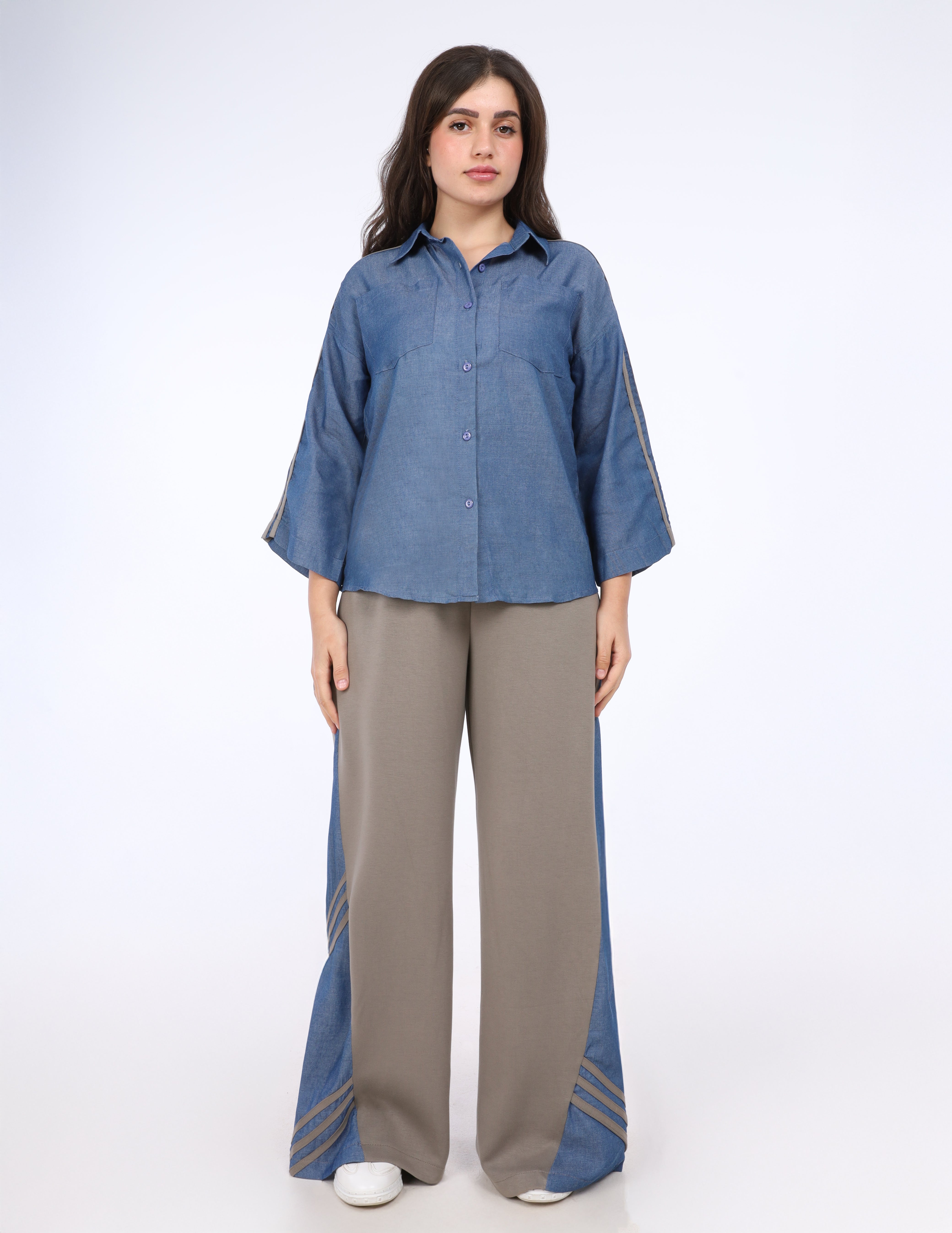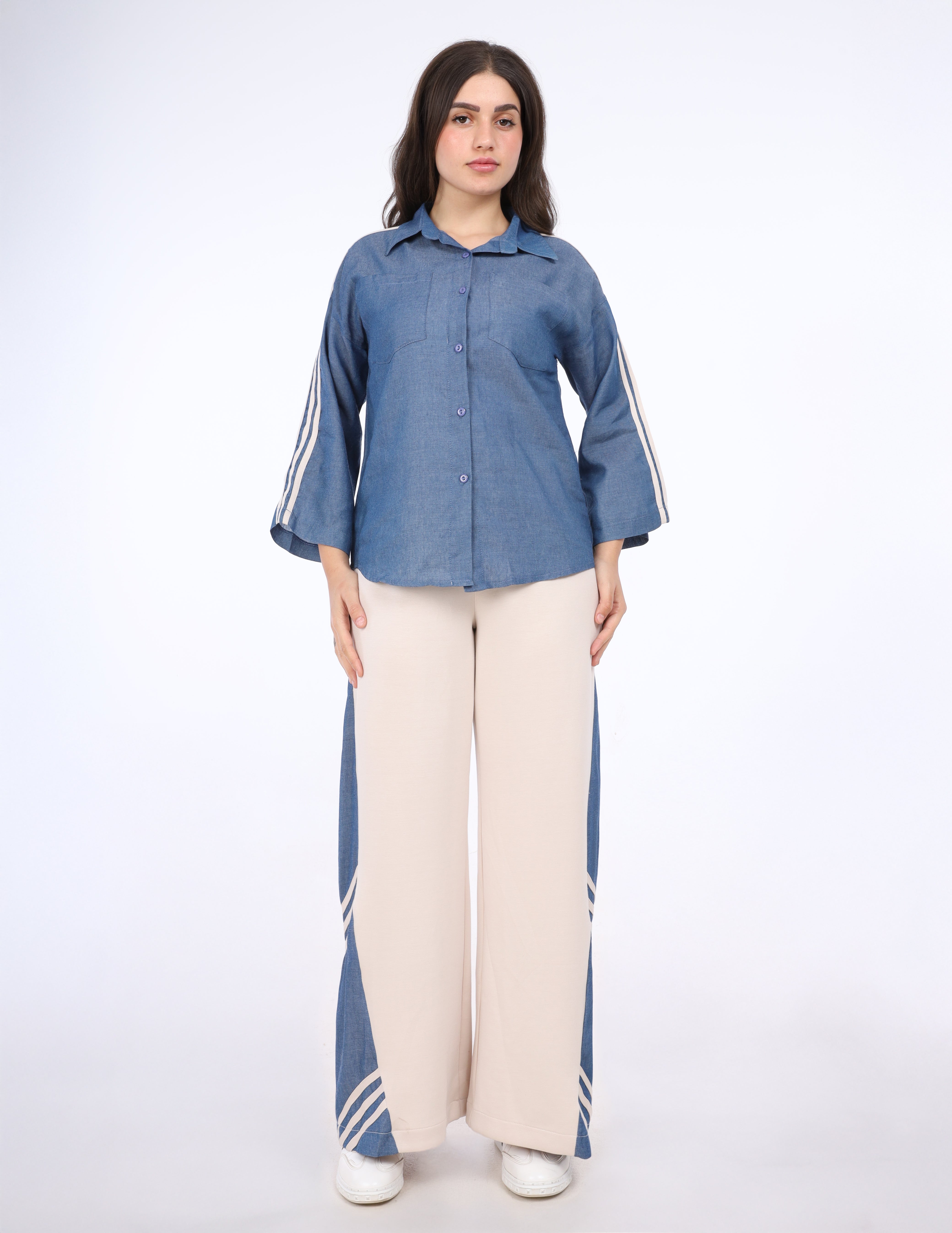 Chic two-piece set featuring a relaxed denim shirt with flared sleeves and wide-leg pants.