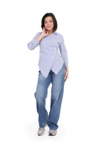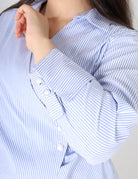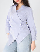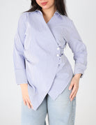 Asymmetrical striped shirt-style blouse with a collar, Long sleeves, and a side waist button.