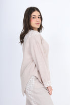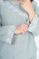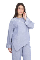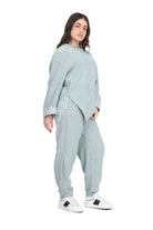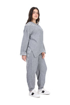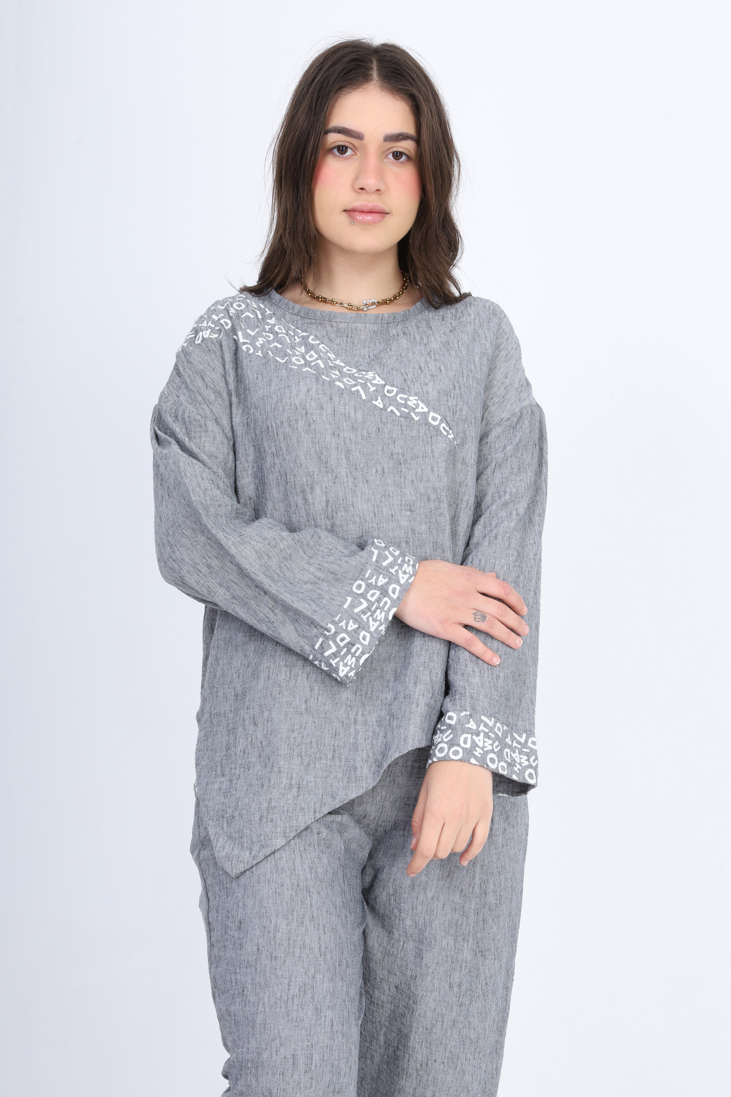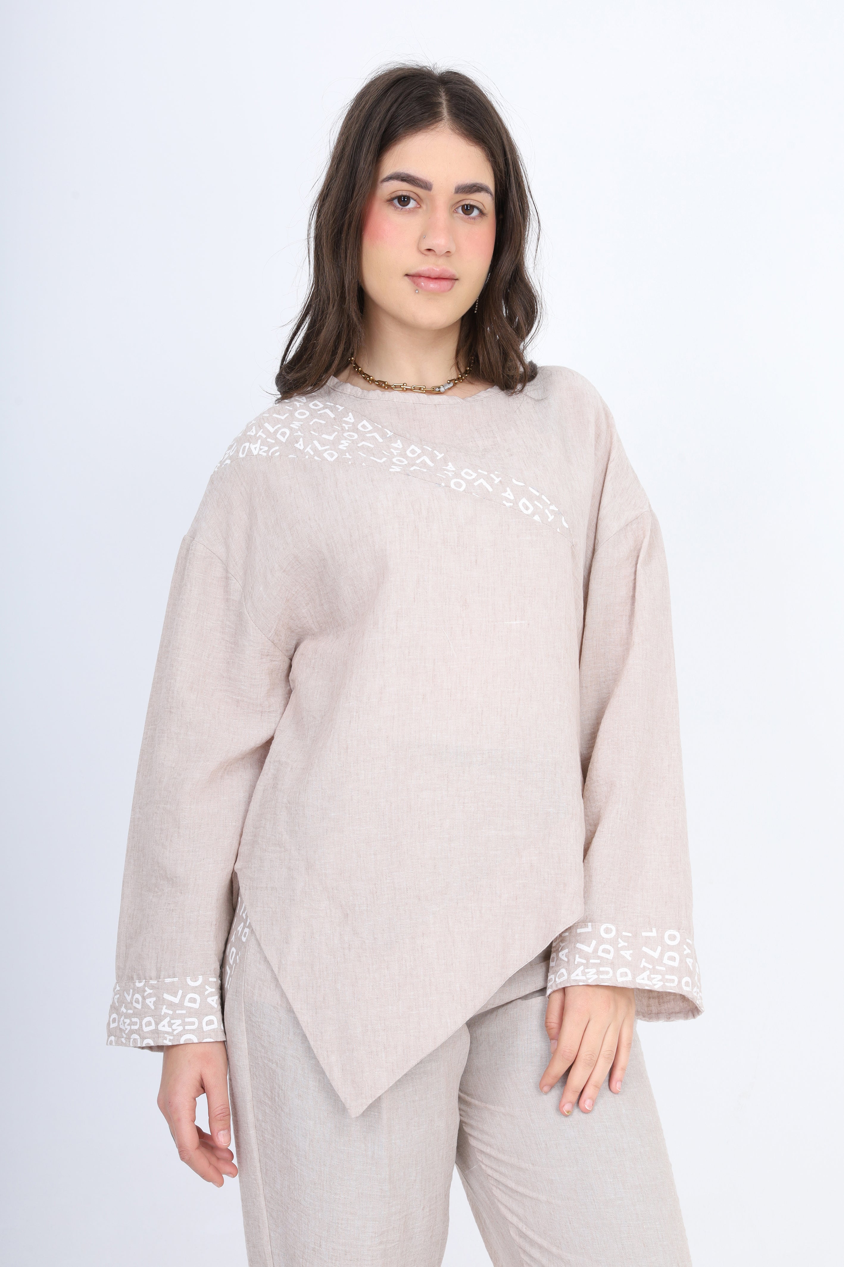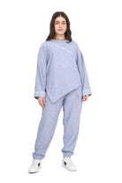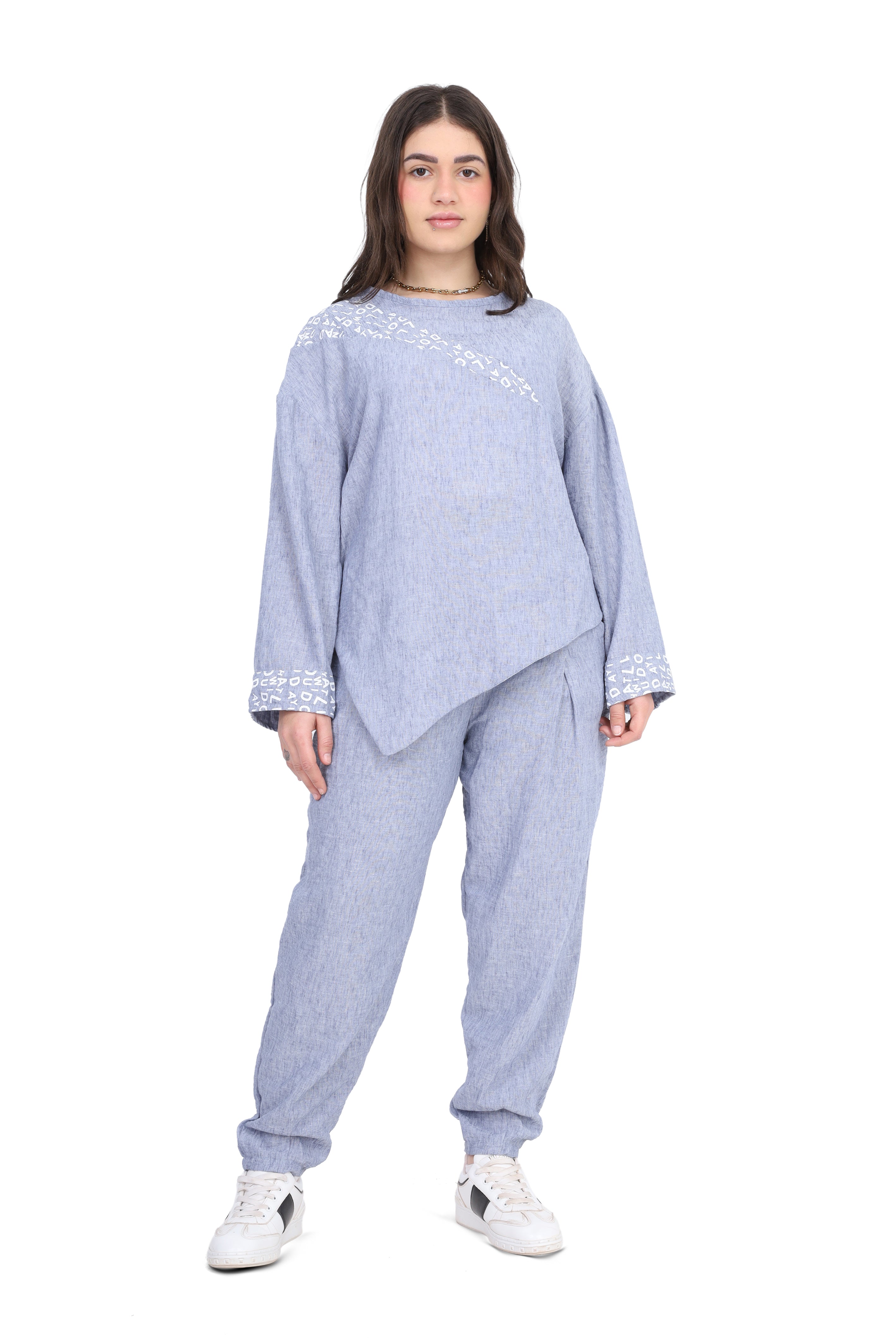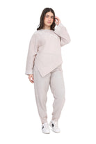 Modern two-piece set featuring an asymmetrical tunic top and relaxed-fit pants.