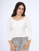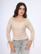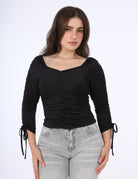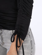 Stylish long sleeve top featuring ruched details along the front and sleeves with adjustable drawstrings.