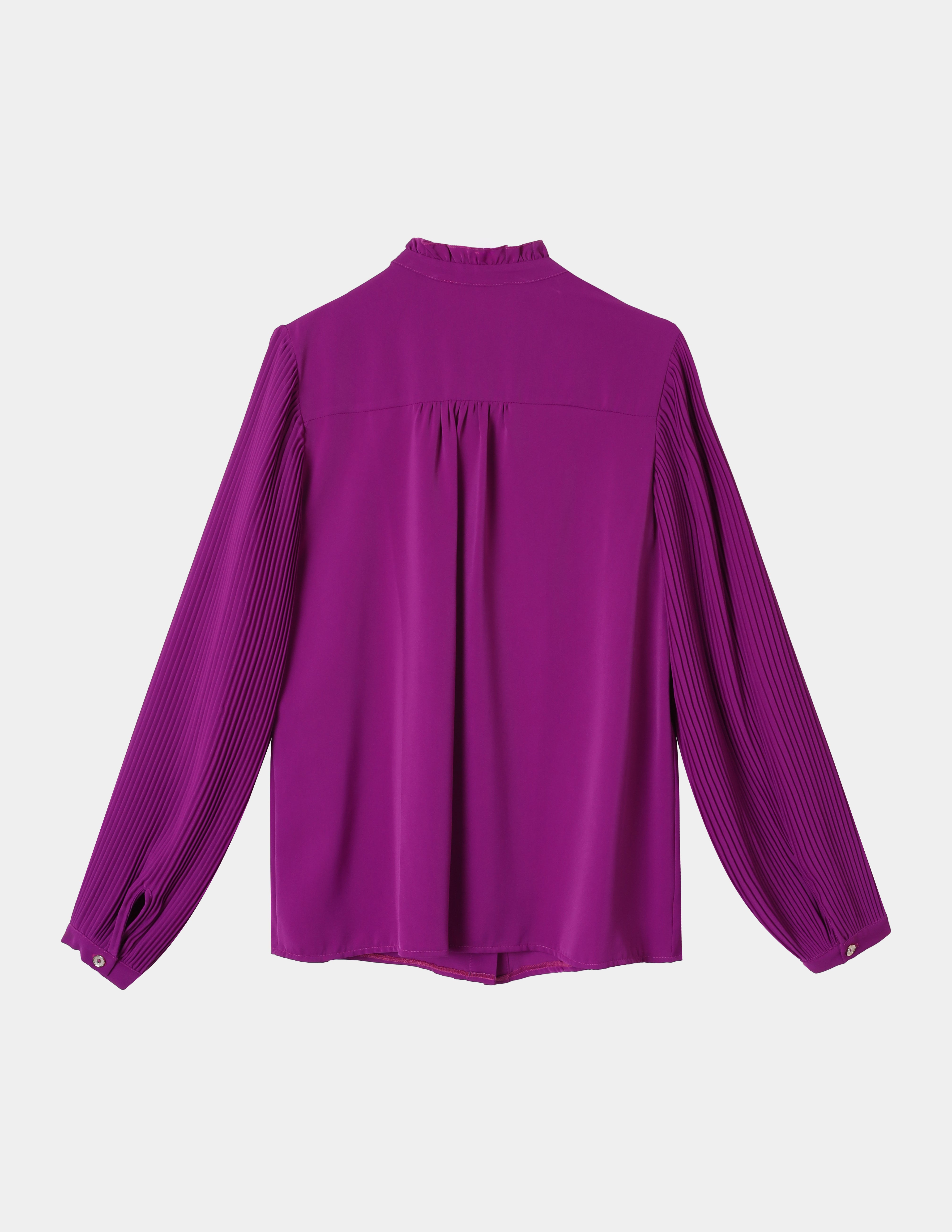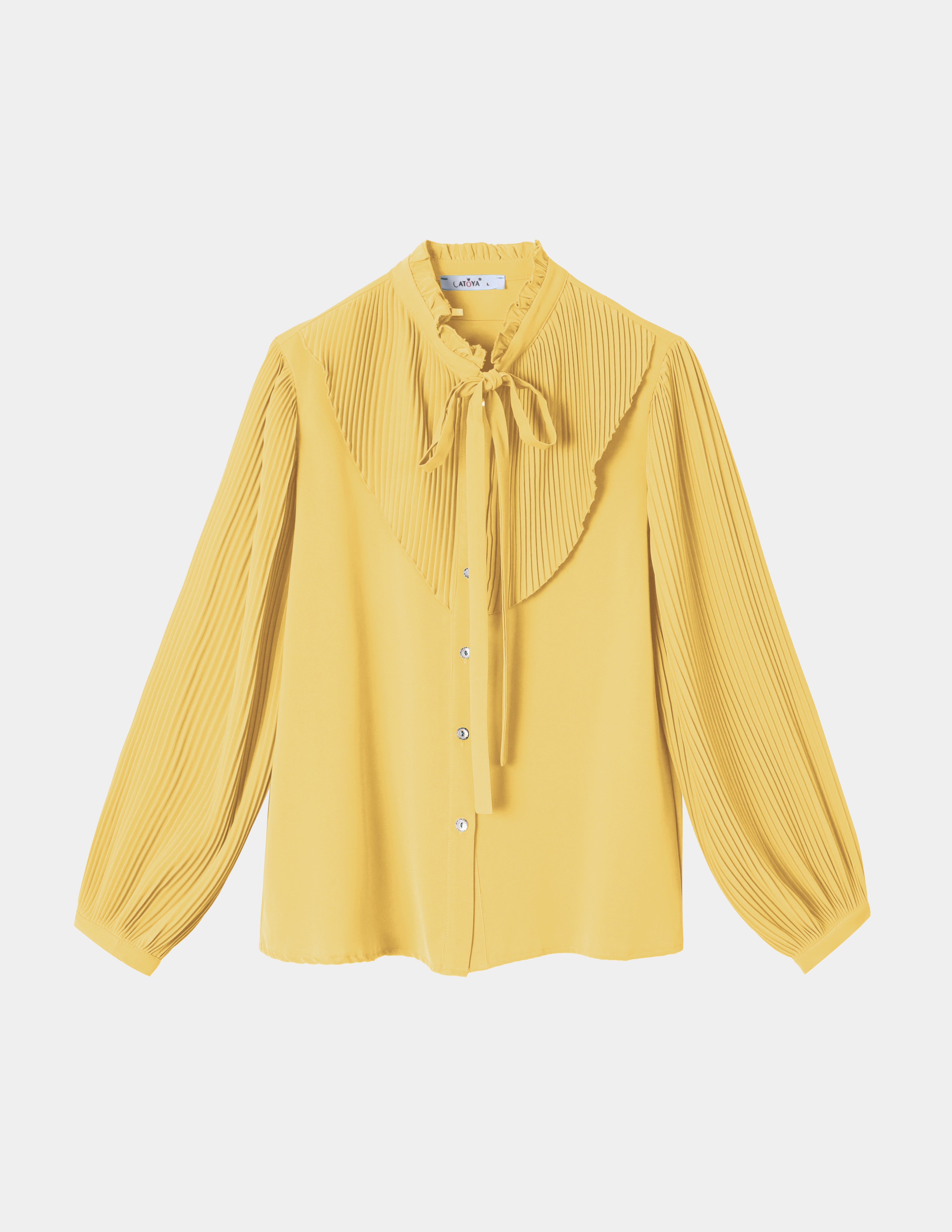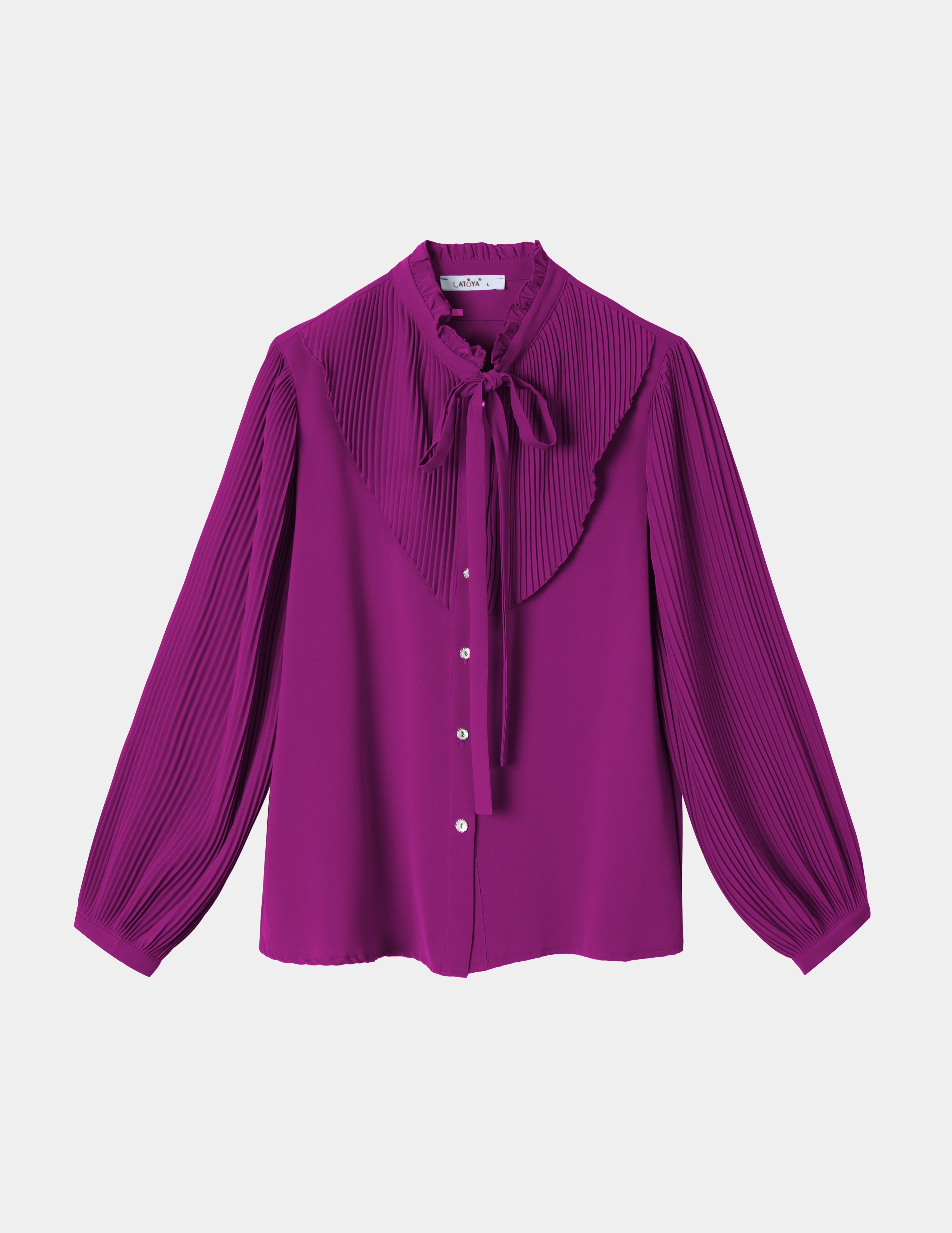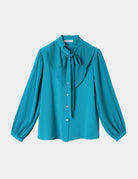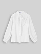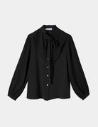 Blouse with ruffled chest & and sleeve details, front buttons, and neck tie.