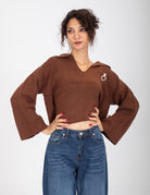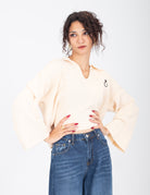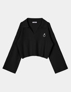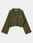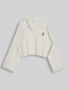 A stylish cropped knit sweater featuring a sharp V-neckline with a flat collar for a modern, preppy look. Designed in a relaxed fit with long sleeves for everyday comfort