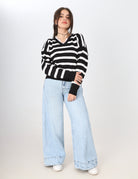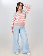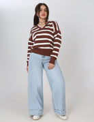 A soft striped knit sweater featuring a delicate lace V-neckline for a feminine, stylish touch.