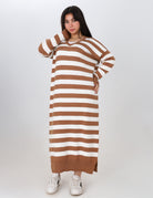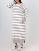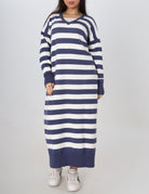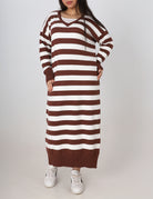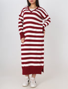 A long striped dress featuring a flattering V-neckline and a comfortable, casual fit