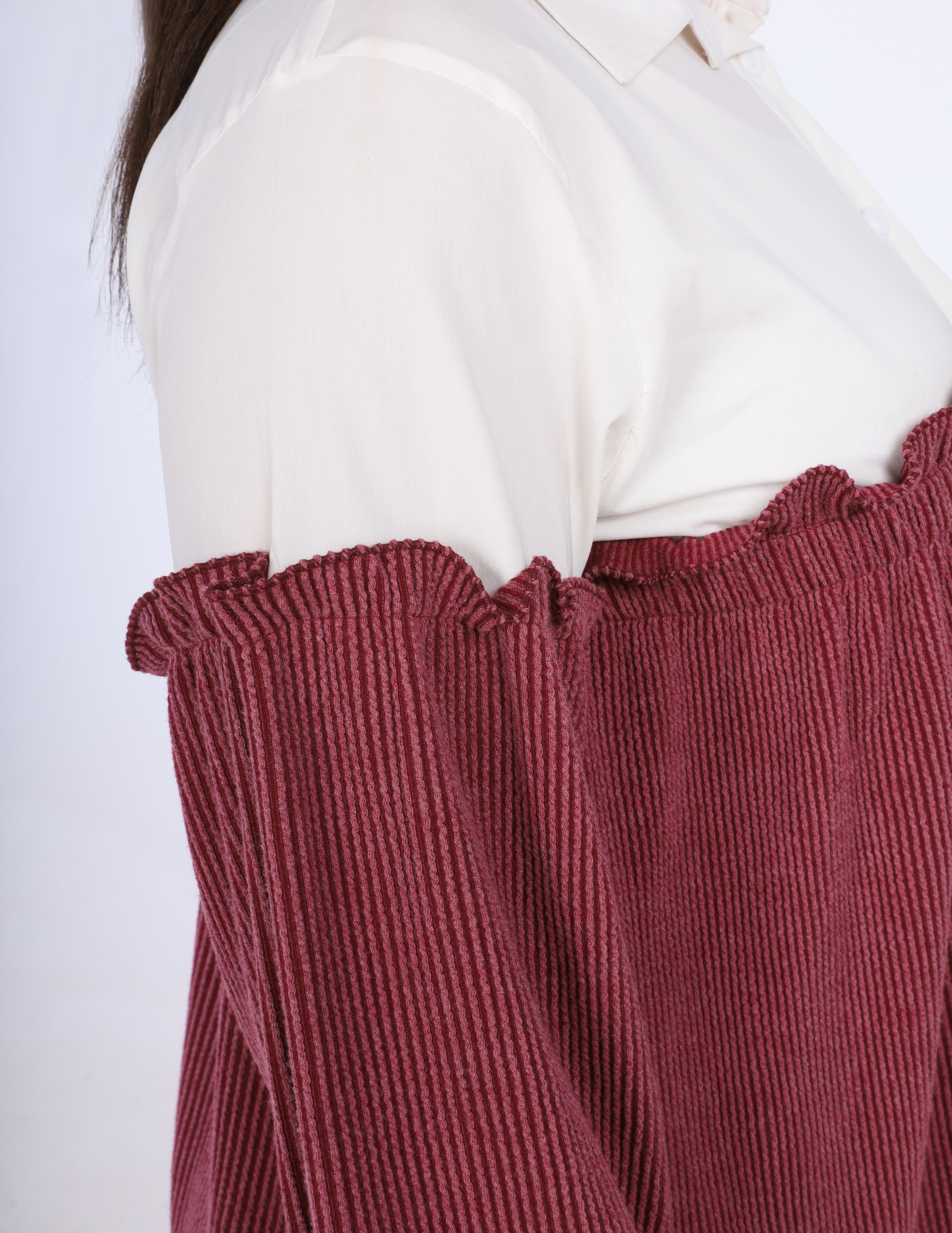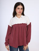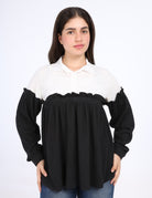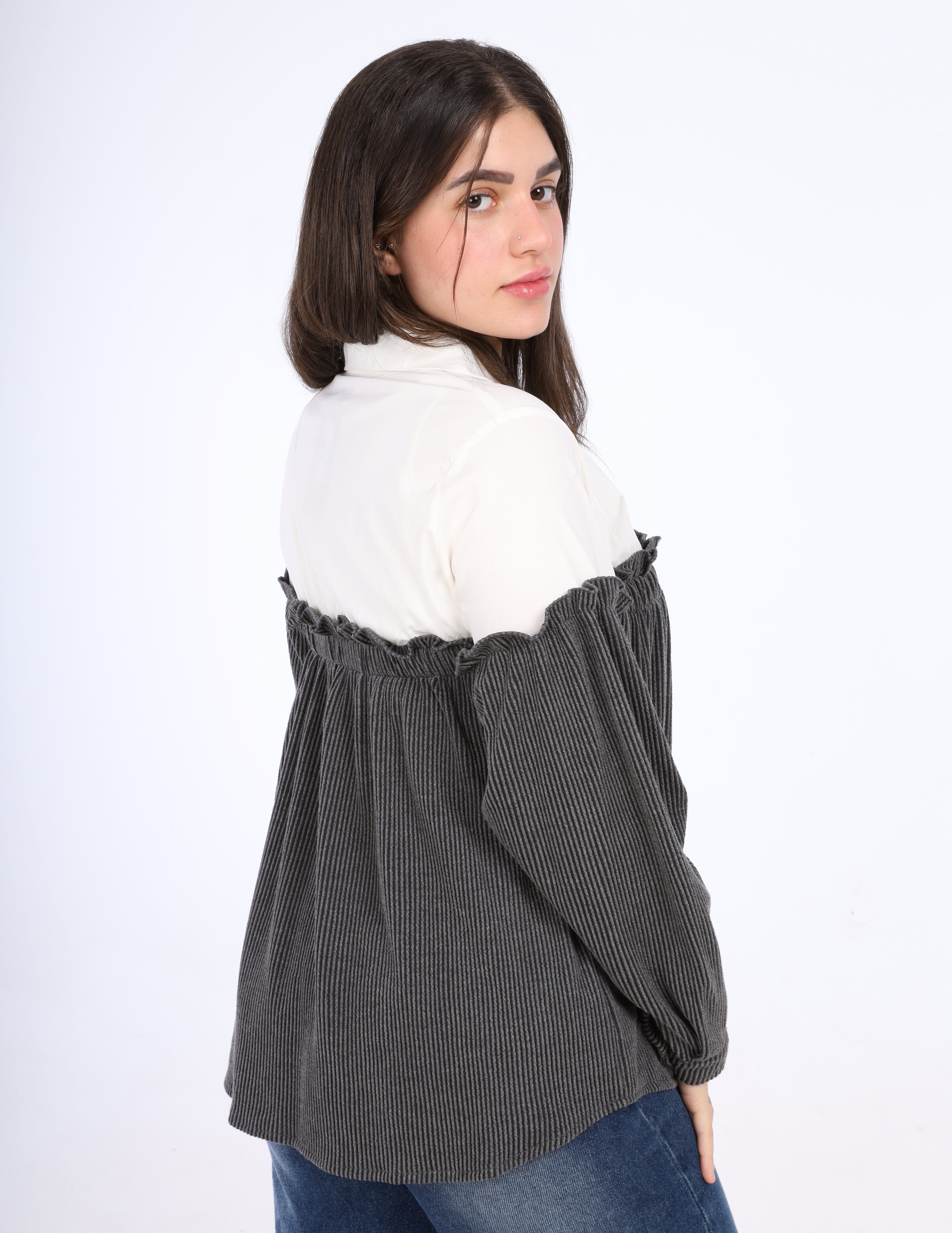 Elegant contrast blouse with ruffle seam details, combining style and comfort.